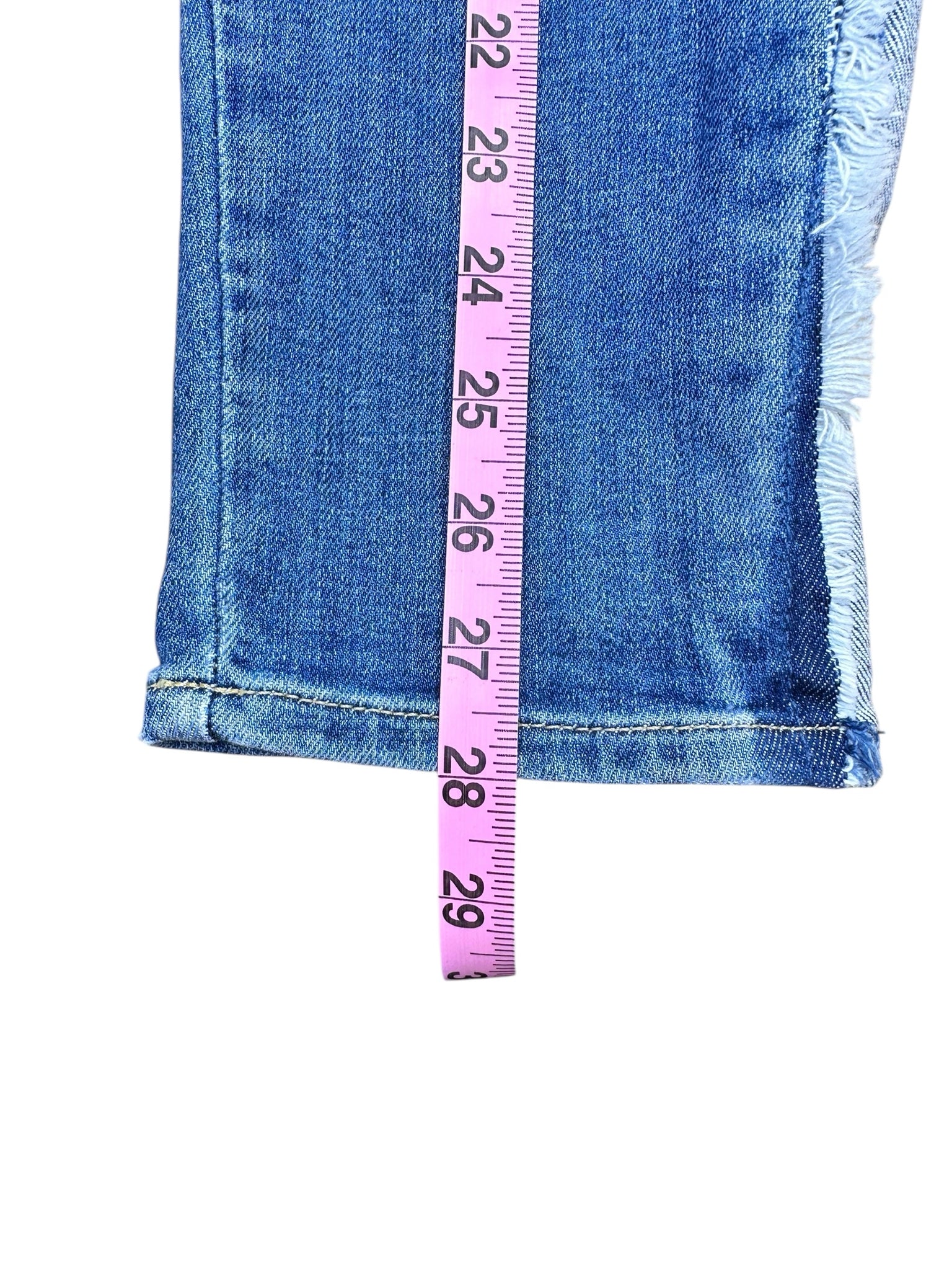 Light wash straight leg jeans with a frayed stripe down each leg.