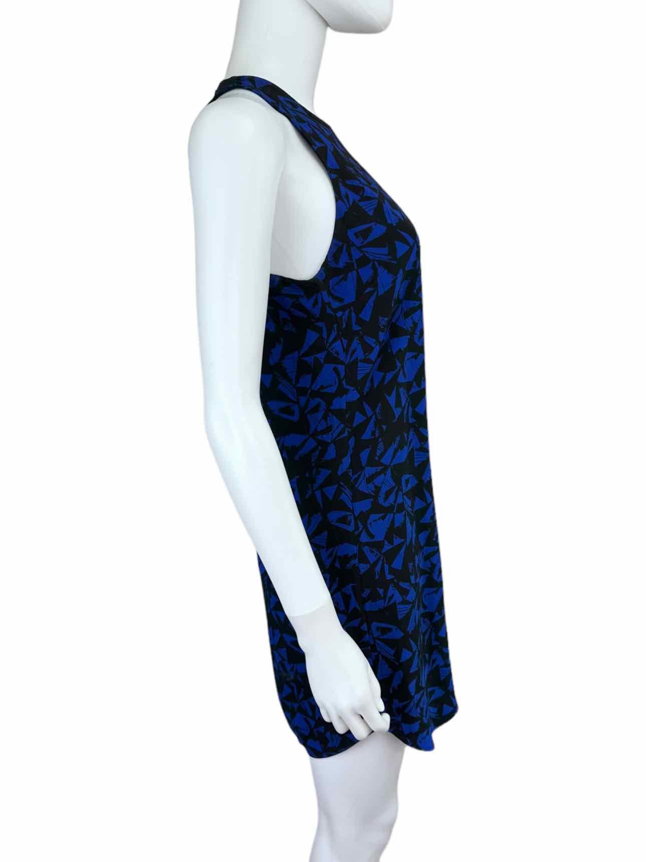 Lightweight black and blue print sleeveless dress with back snap closure.