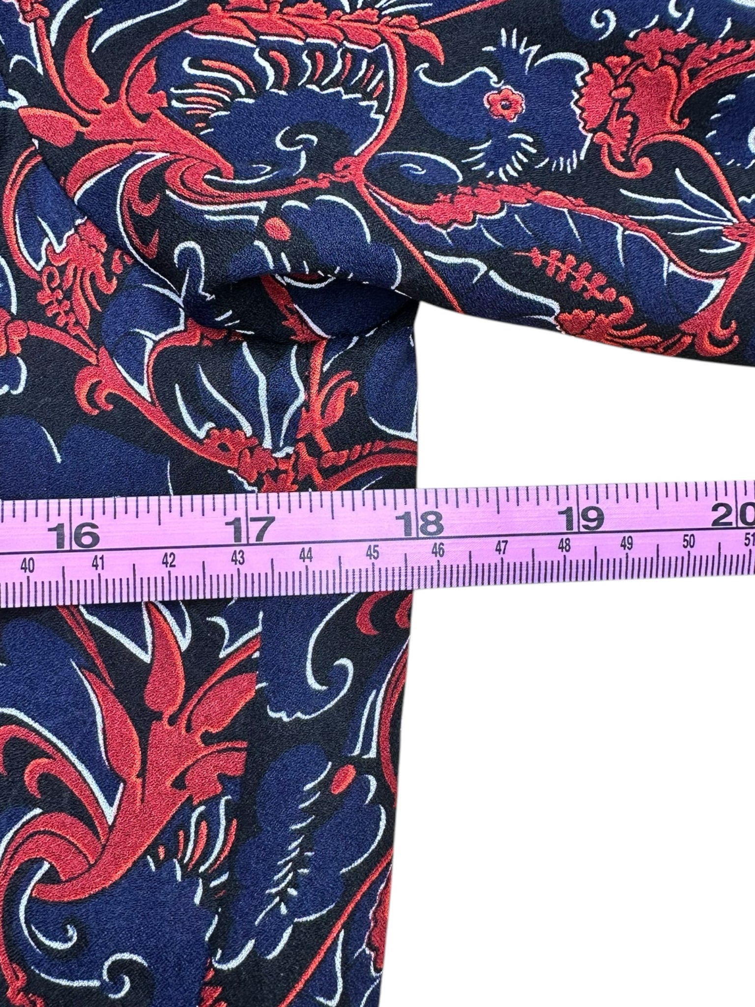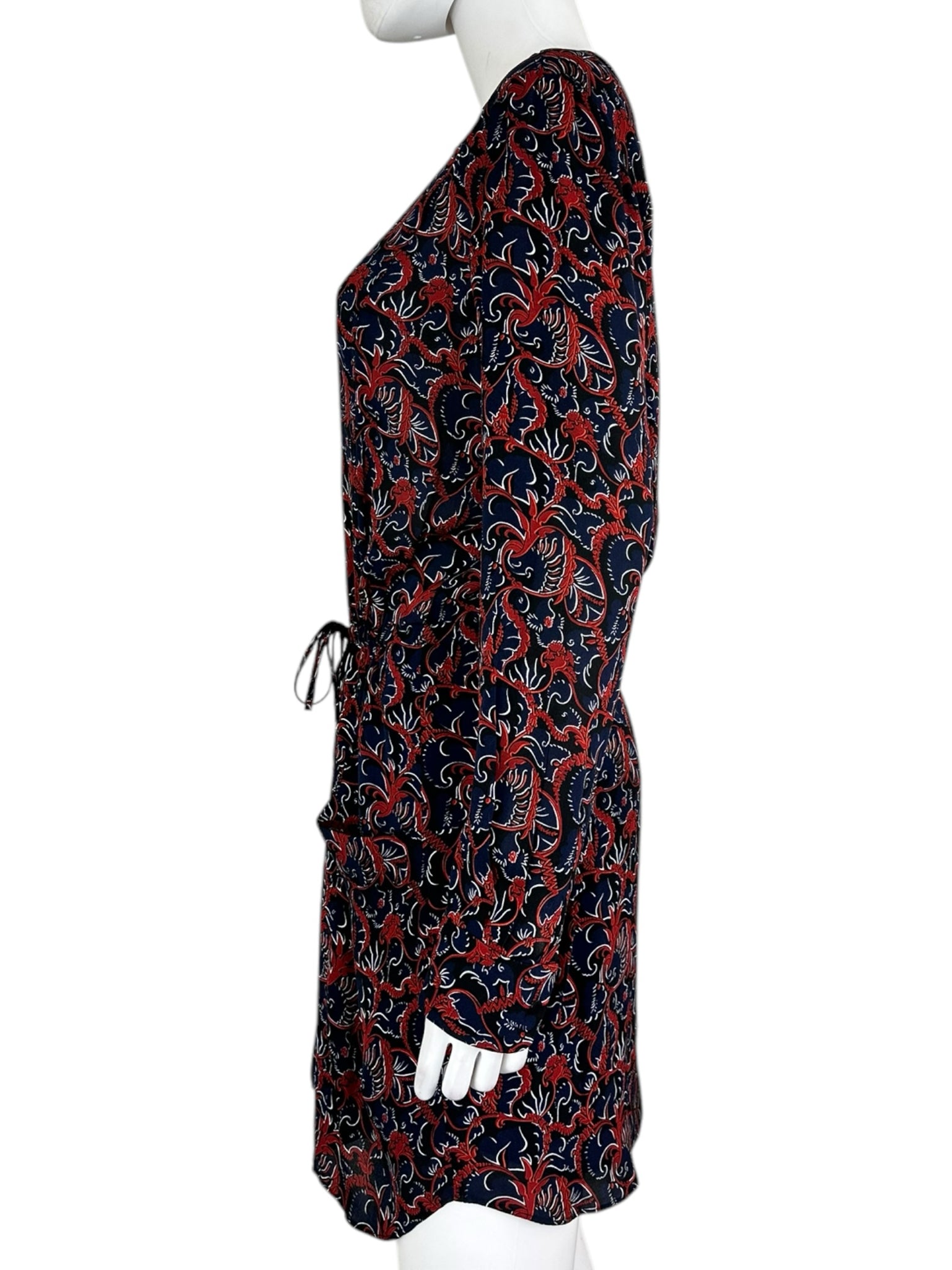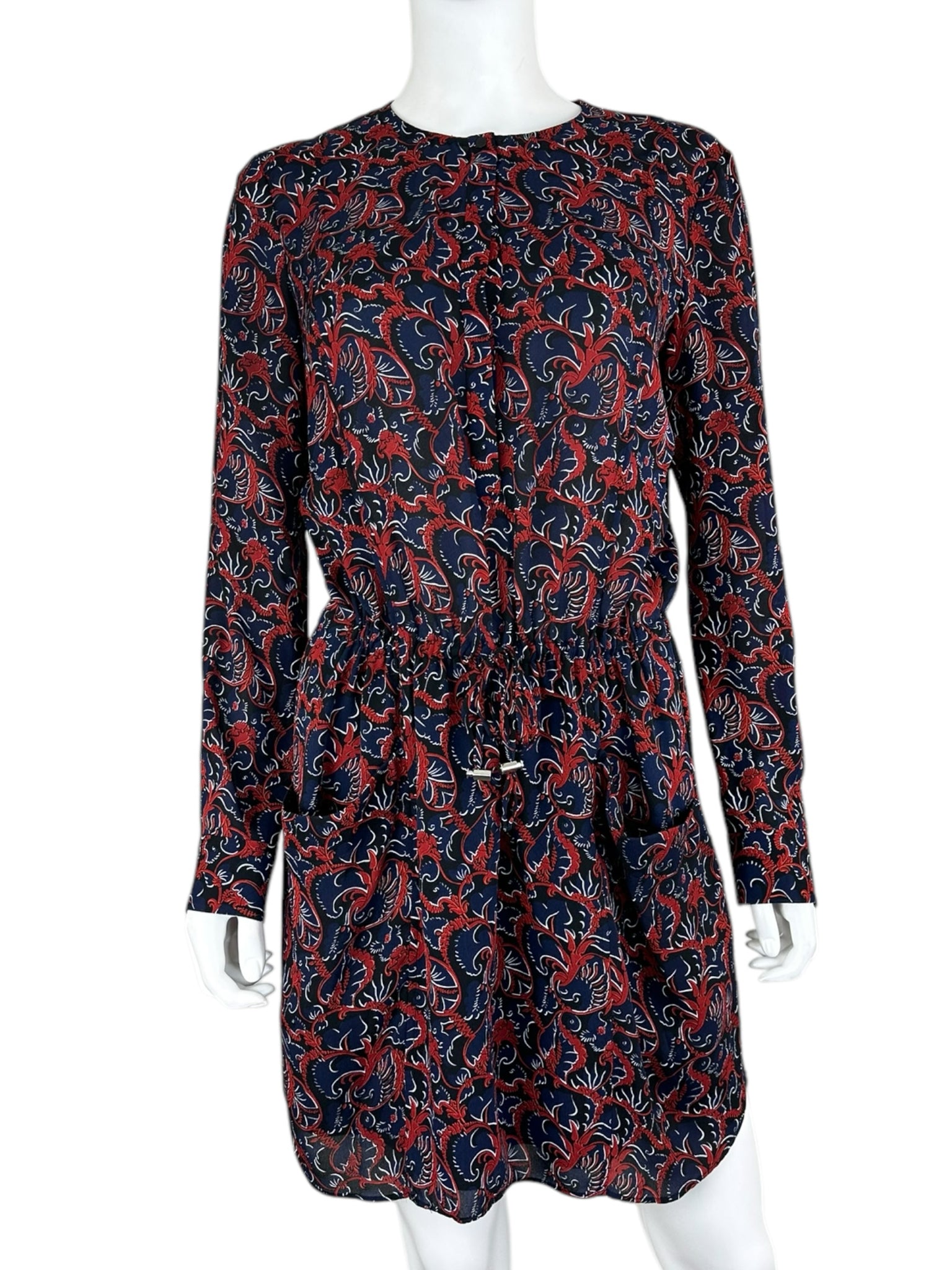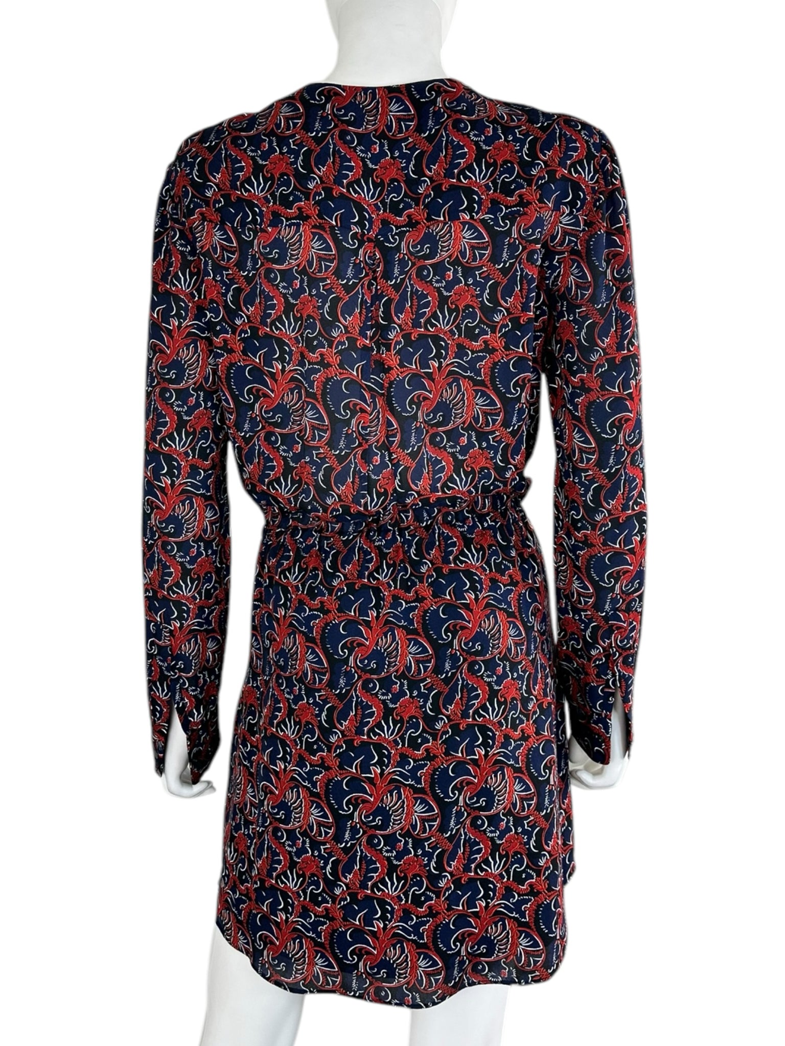 100% silk red & blue paisley print long sleeve mini dress with front hidden button closure and an adjustable drawstring tie closure at waist. Cuffs have a snap closure and dress features two front pockets.