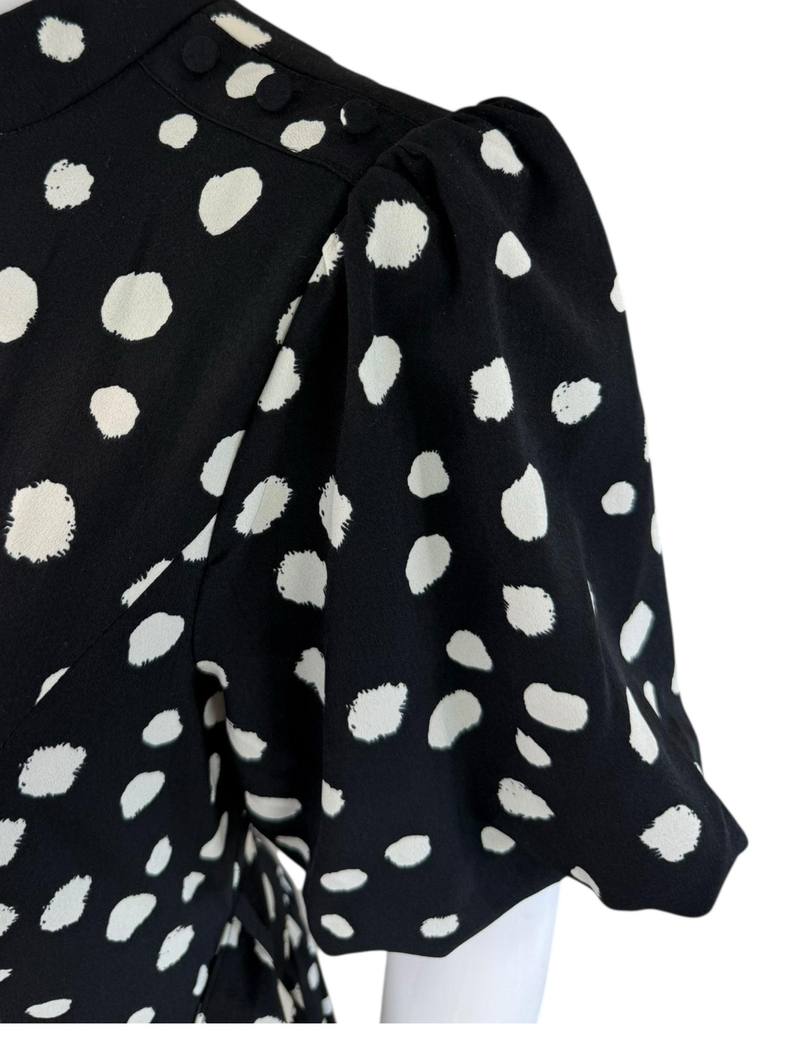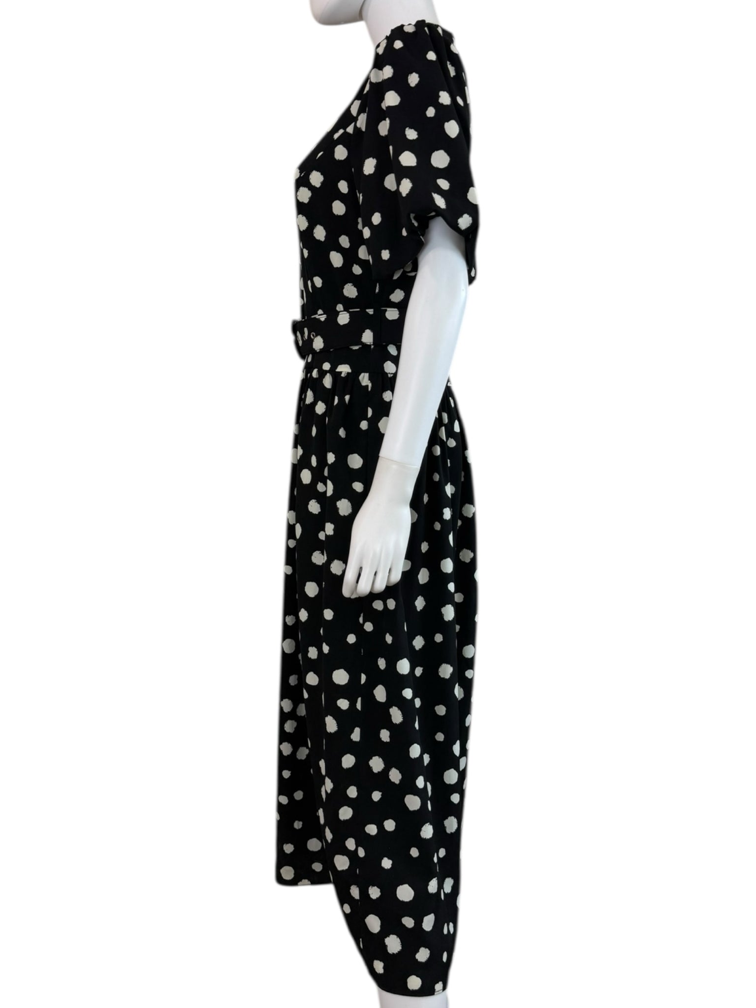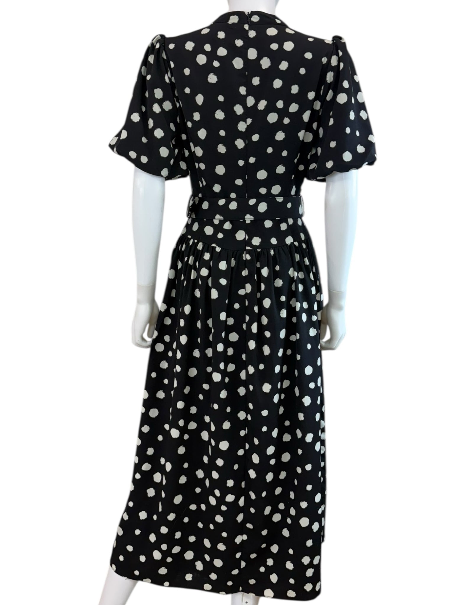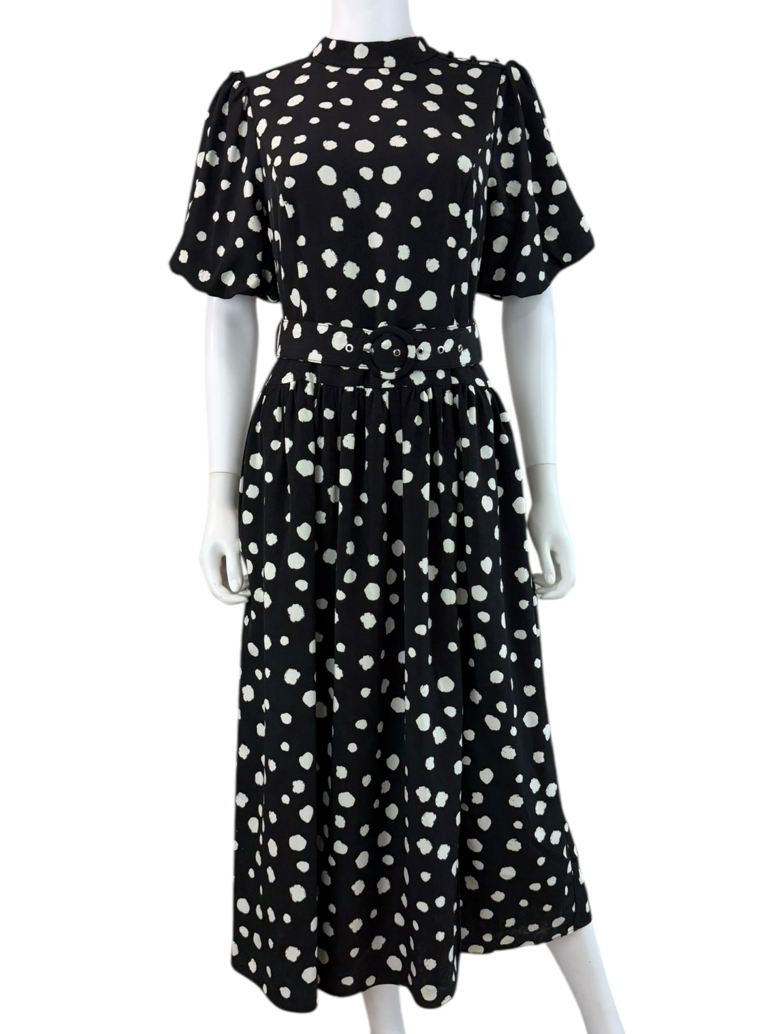 New with tags! Black & white polka dot pattern mock neck midi dress with short puff sleeves, belted buckle belt, back zipper closure and a front split hem.