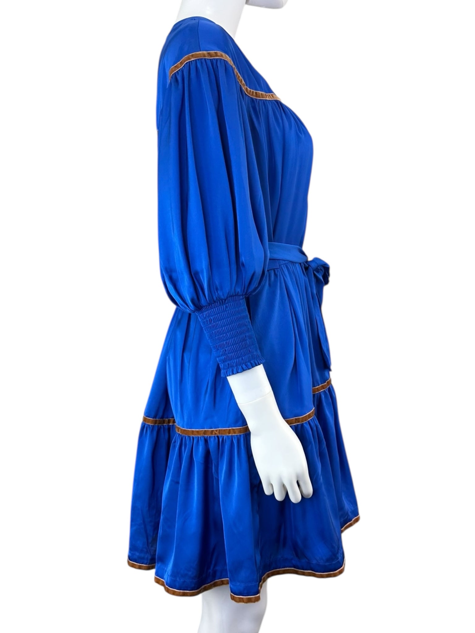 Bright cobalt blue satin mini dress with long smocked cuff sleeves, split neck opening with hidden button closure, optional belted waist and a tiered skirt with brown velvet trim.