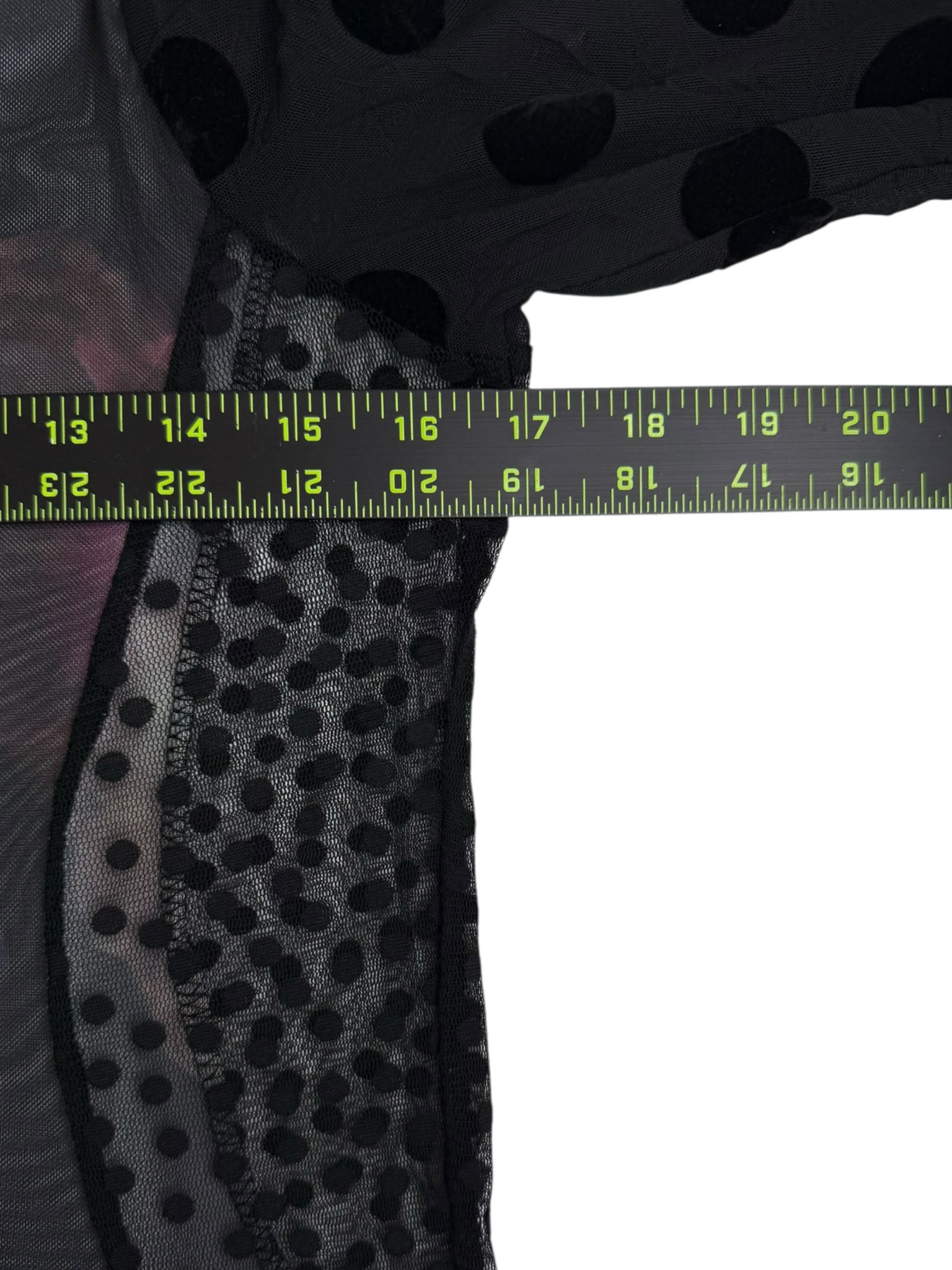 Black mesh maxi dress with floral designs on the torso and large and small polka dots on the sleeves and sides of the dress. Dress has pockets and a black slip dress underneath.