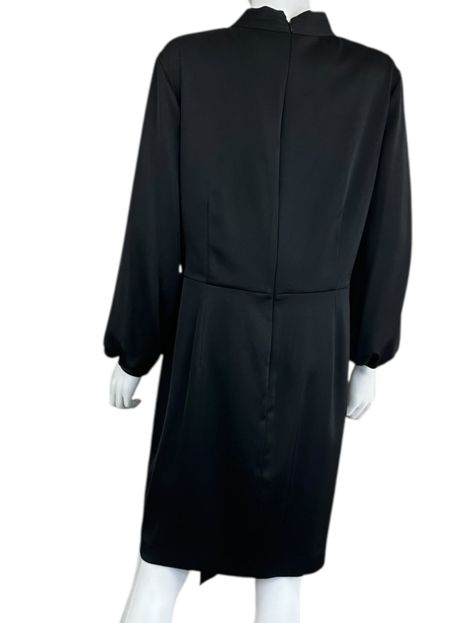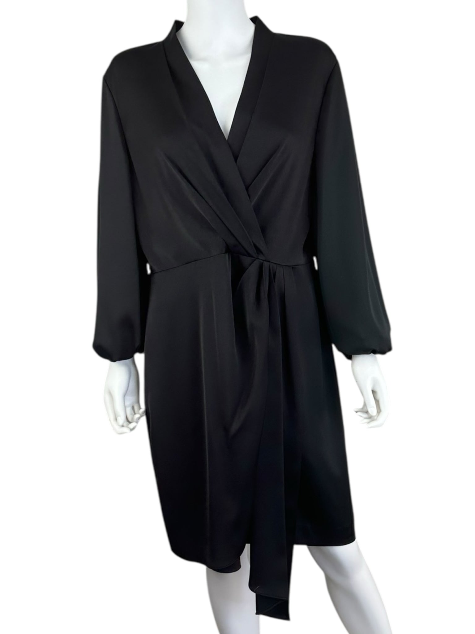 New with tags! Black wrap front satin cocktail dress with long balloon sleeves. Dress is lined and features a back zipper closure.