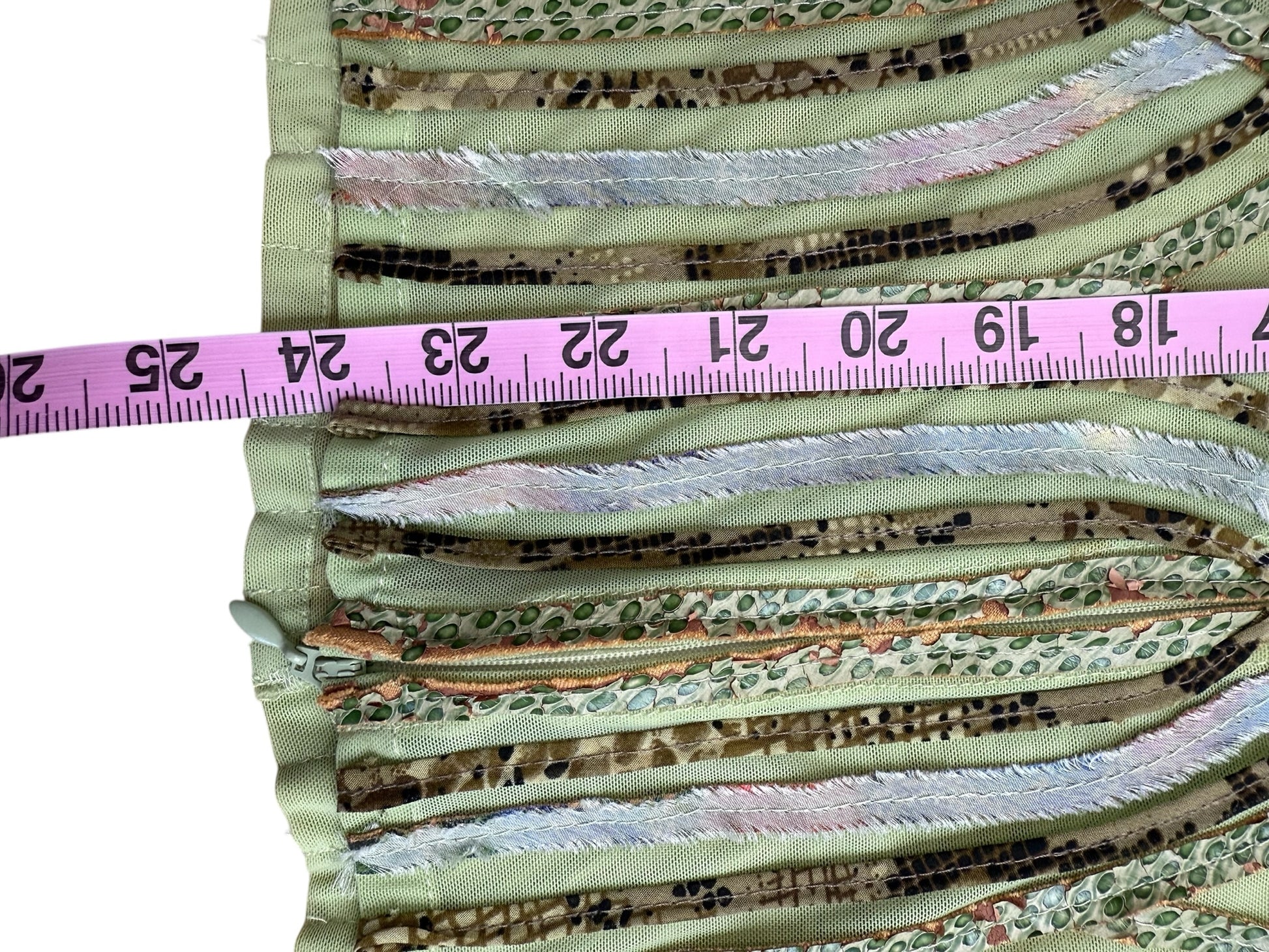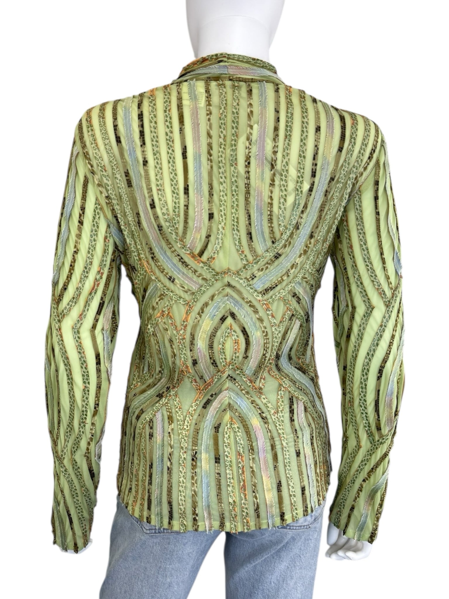 Lightweight green mesh ribbon trim jacket with long sleeves and a front zipper closure. Jacket is vintage and a fun statement piece!