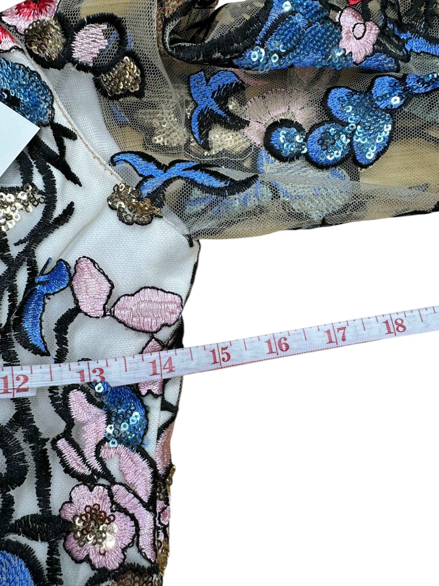 Multi-colored embroidered floral pattern dress embellished with sequins. Dress is an off the shoulder style, midi length with ruffle hemline and has 3/4 length bell sleeves.
