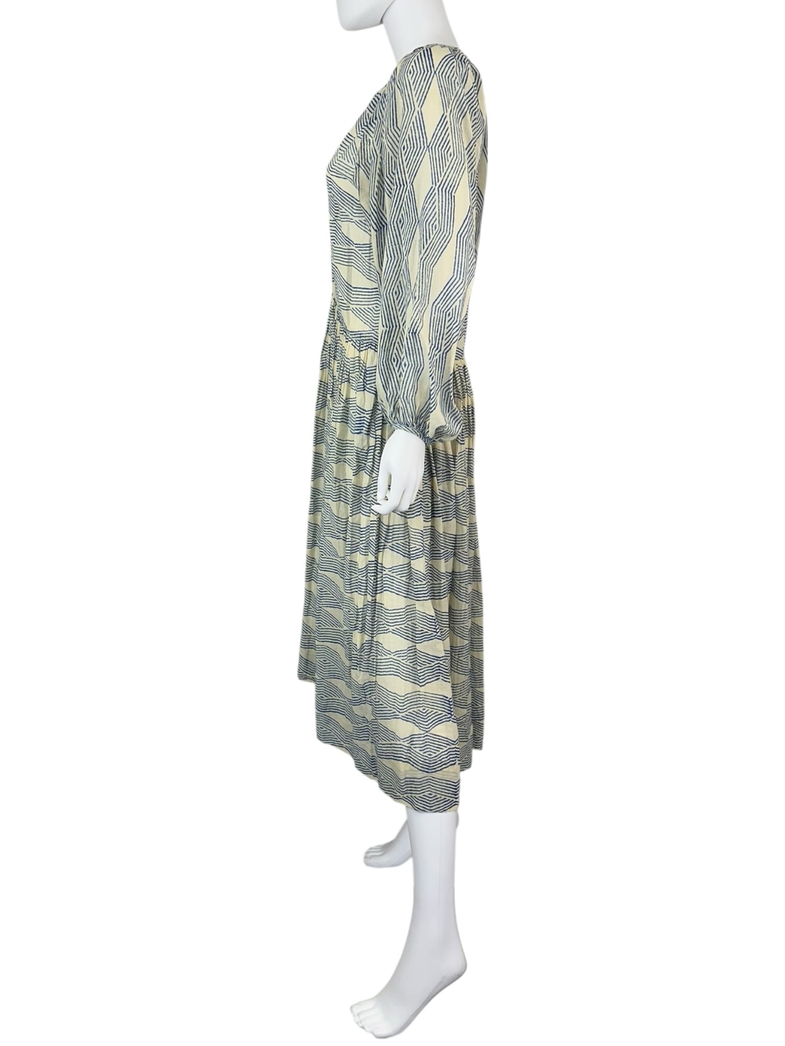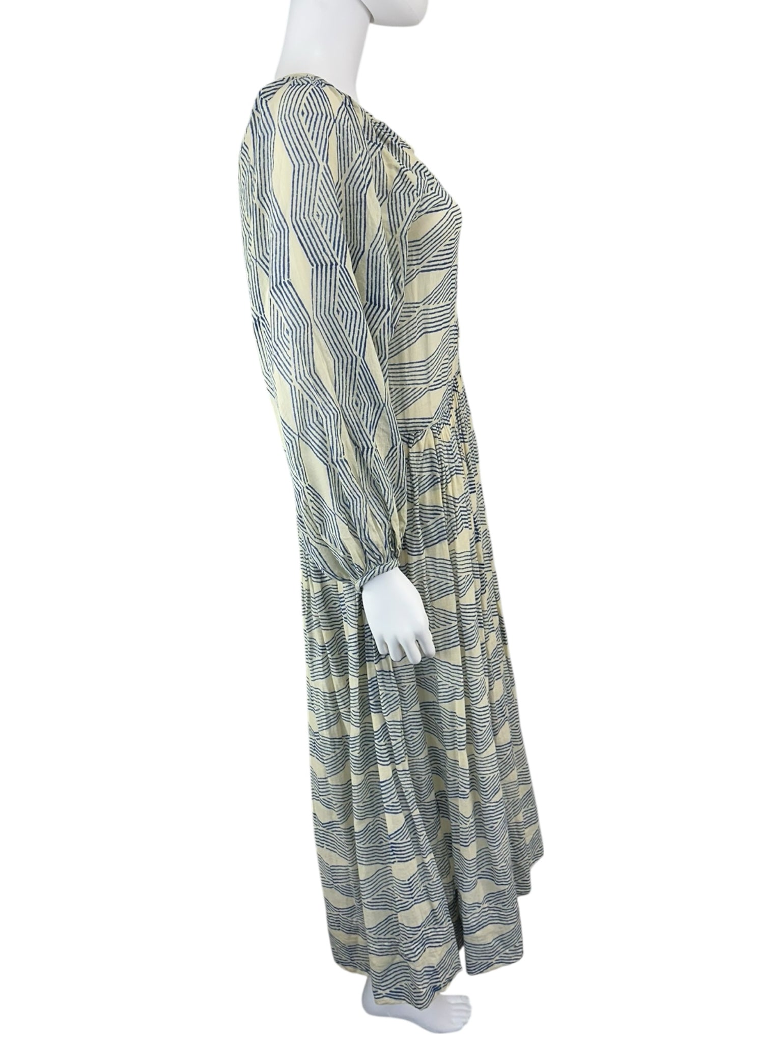 Cream & blue print 'SARANNA' maxi dress with long balloon sleeves, split neck opening with hidden single hook closure, shell embellishment along neckline.
