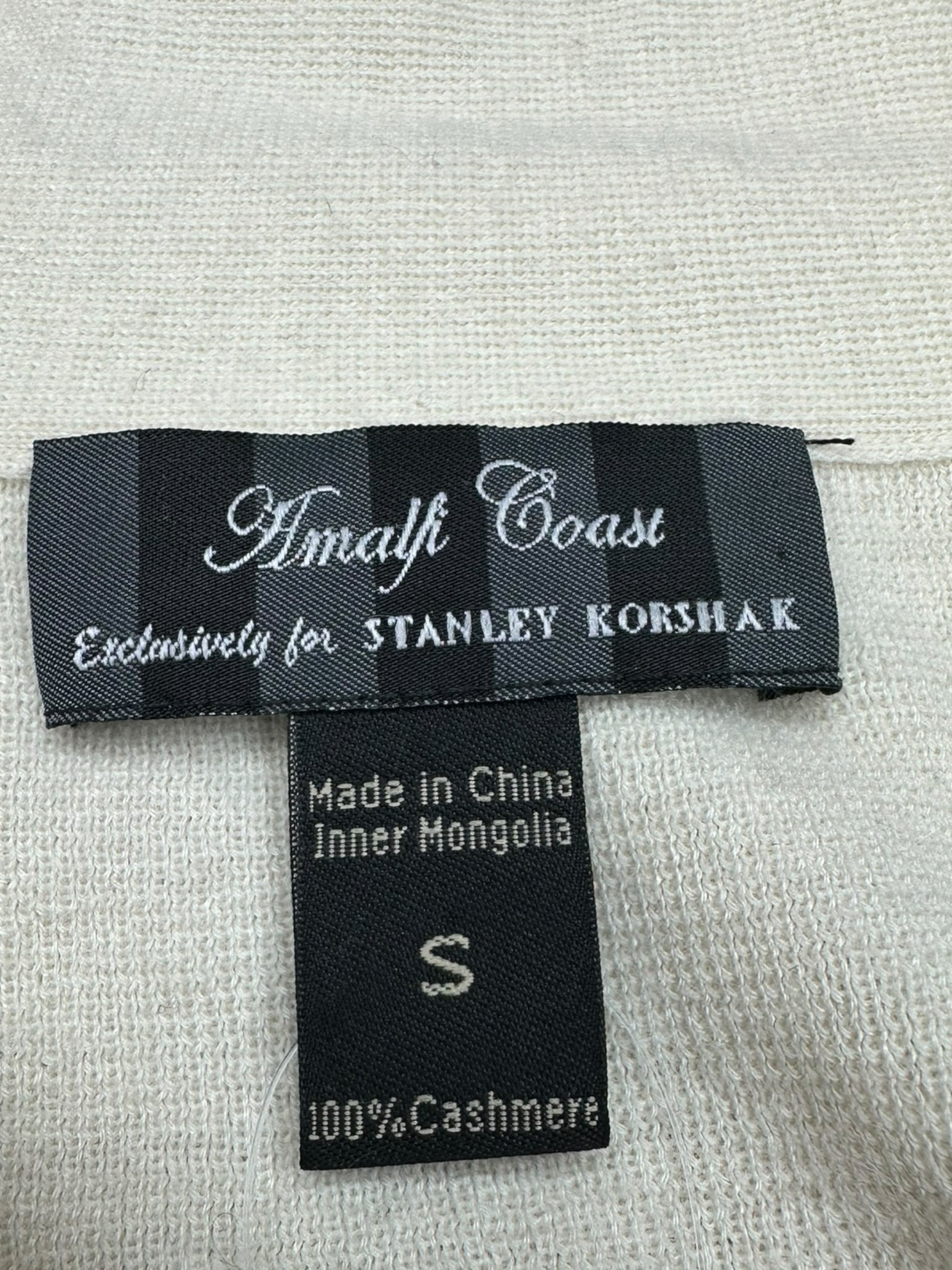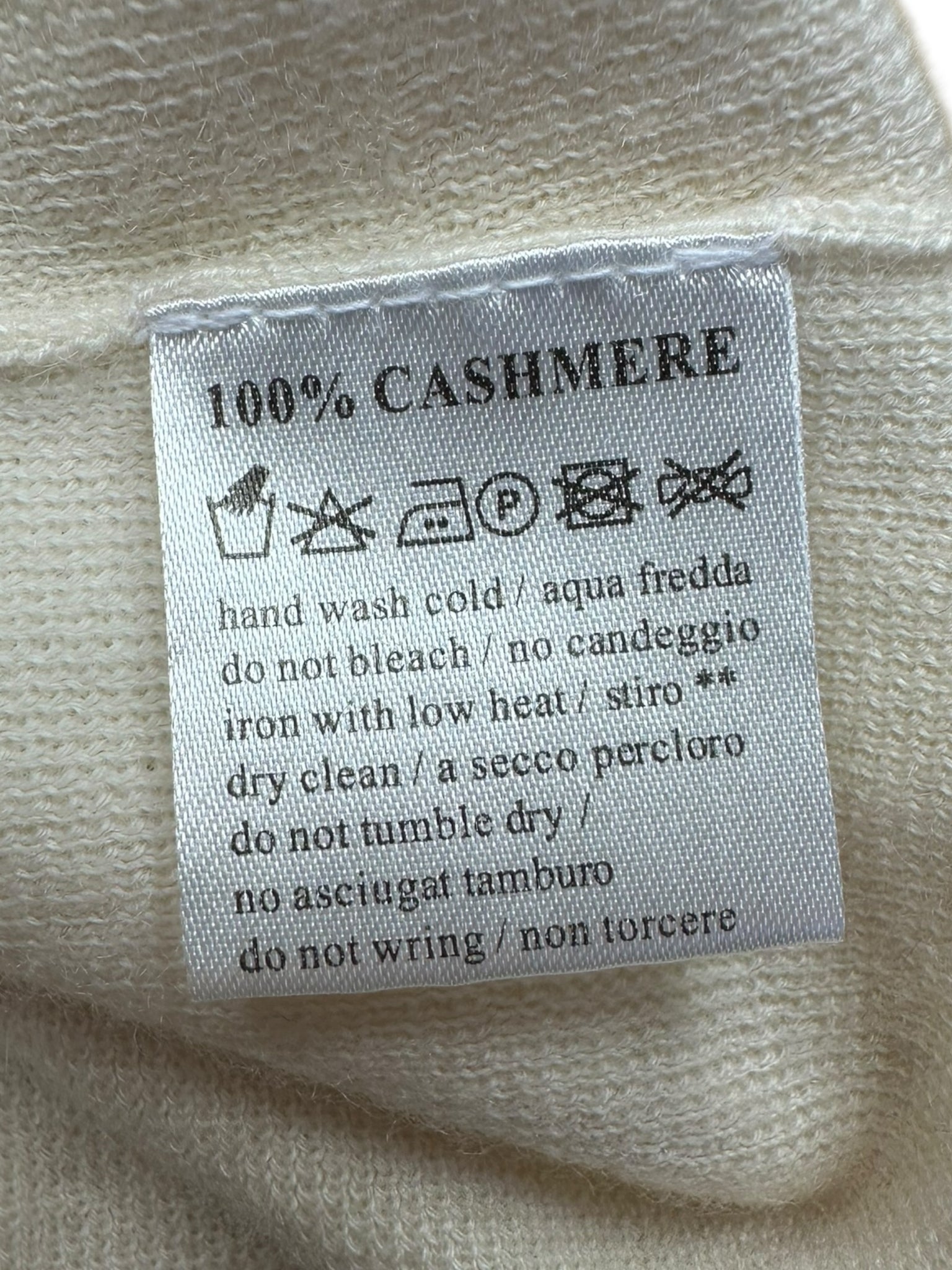 100% cashmere long sleeve cream sweater with a tying knot along the neckline.