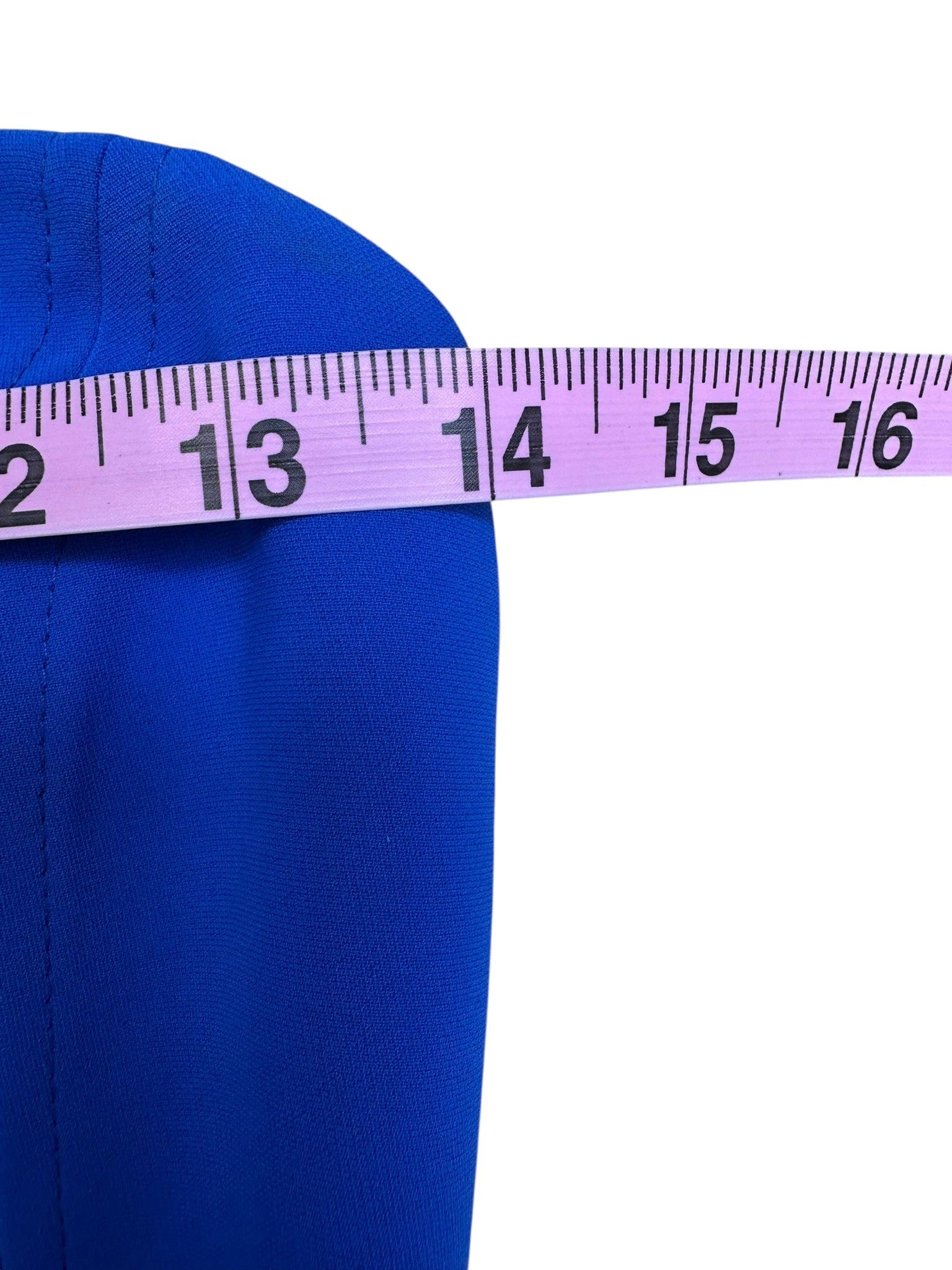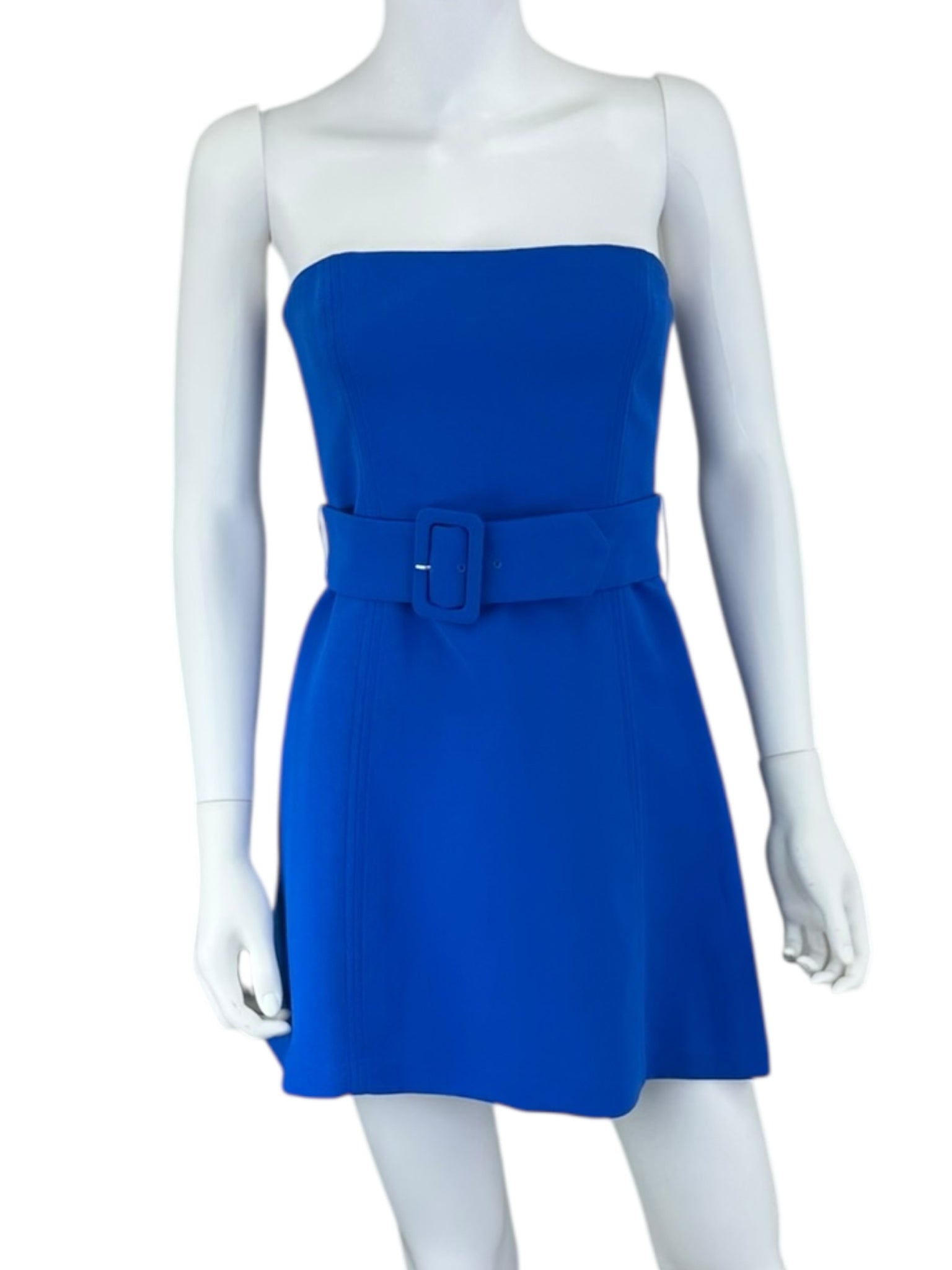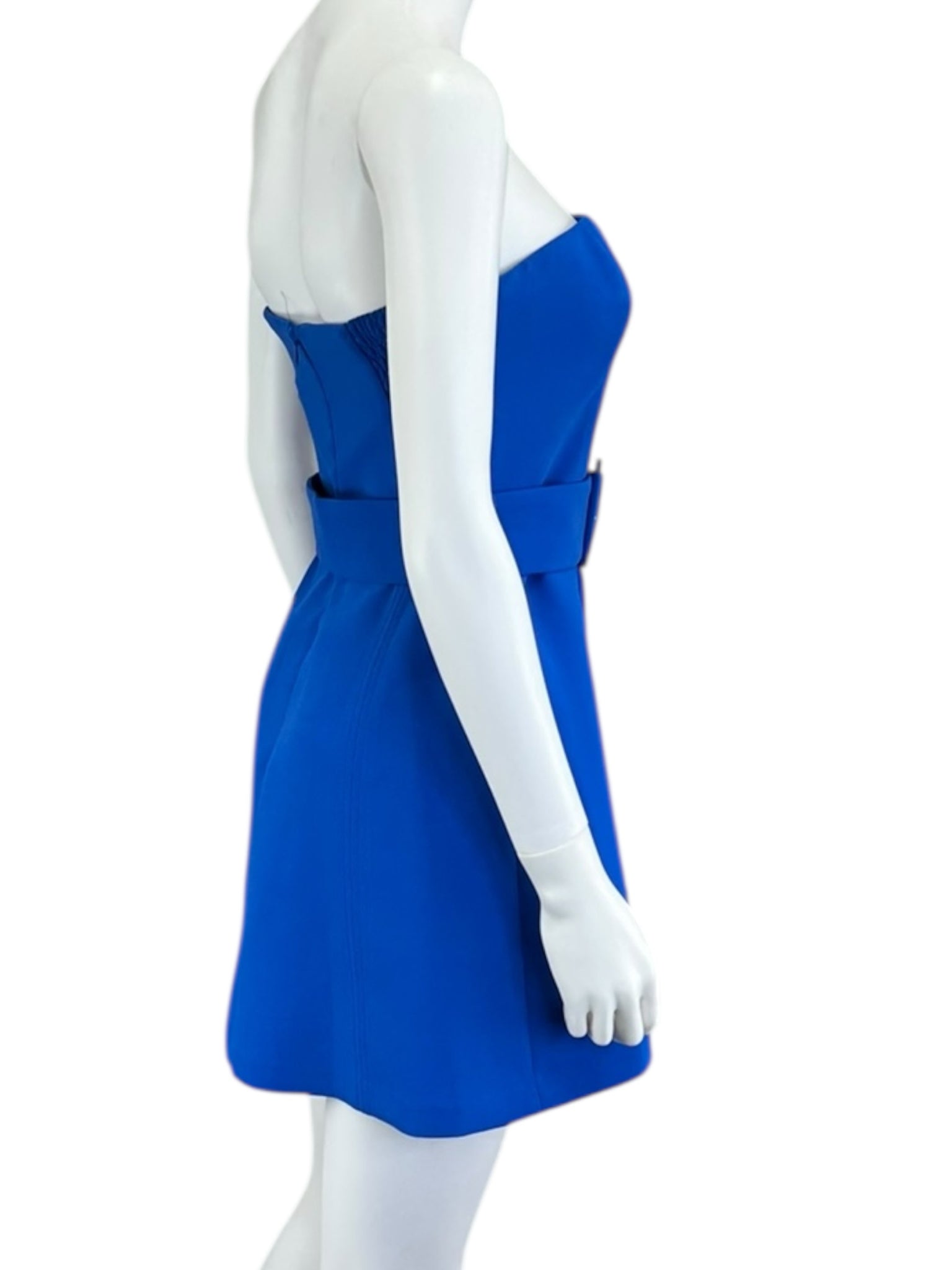 Royal blue strapless mini dress with smocked side panels, adjustable buckle belt and a back zipper closure.