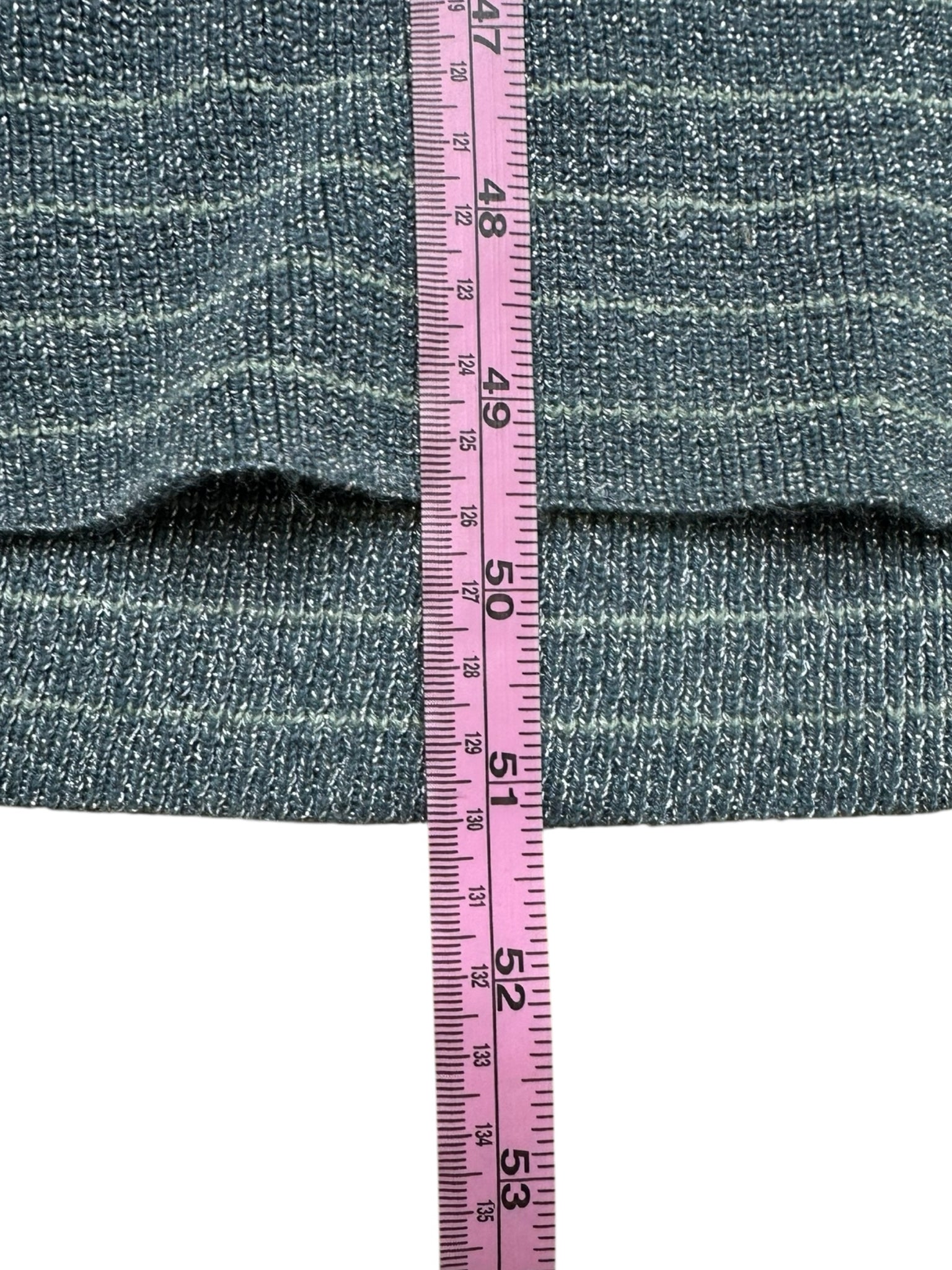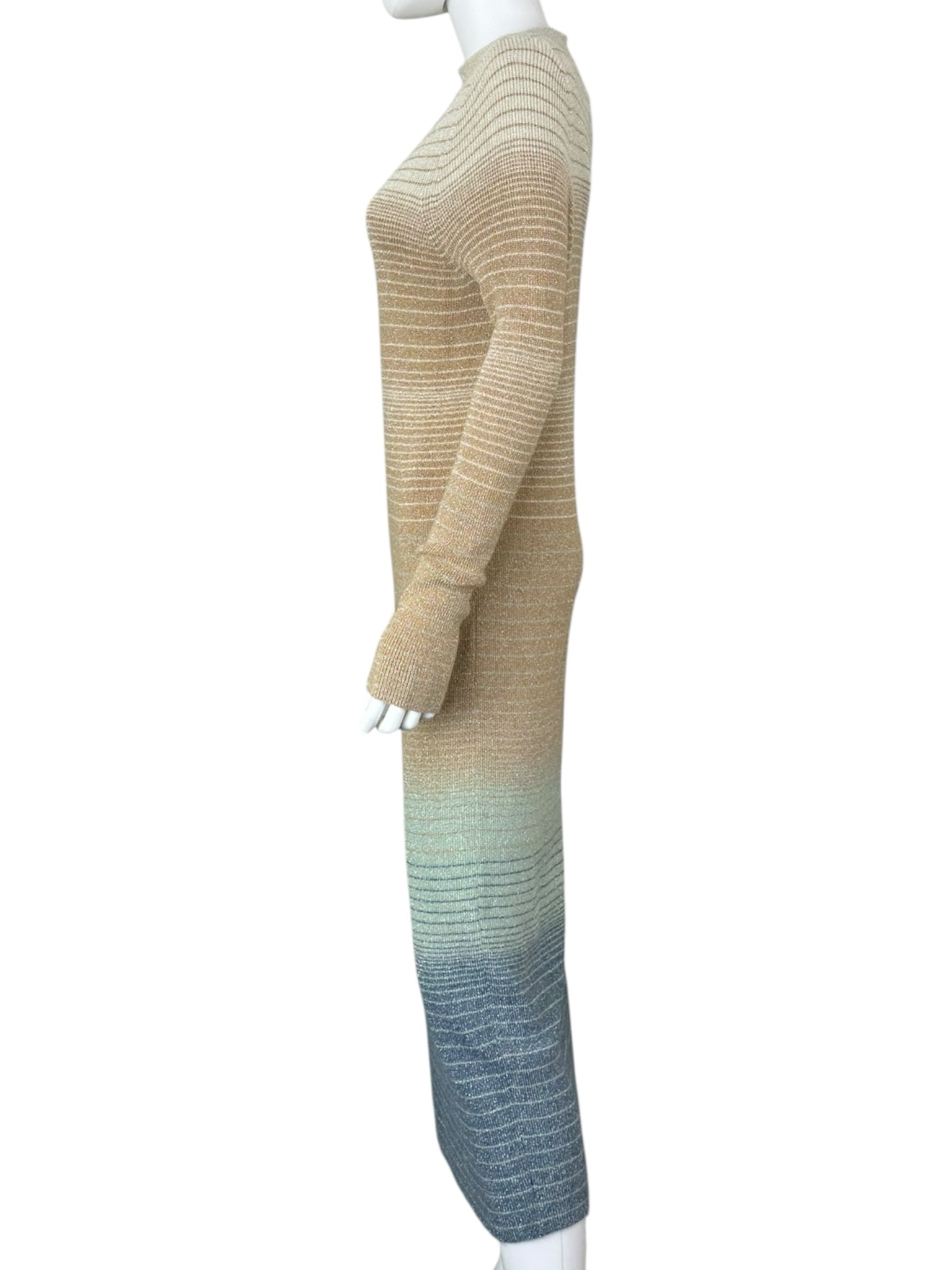 Cream and blue with metallic champagne striped ombre sweater maxi dress with long sleeves. Dress is made from a comfy cotton blend stretch knit yarn.