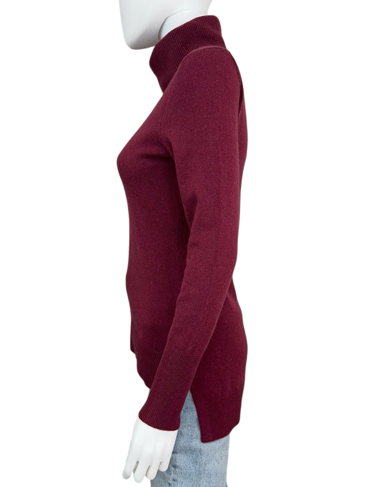 Garnet long sleeve 100% cashmere turtleneck with small side slits.