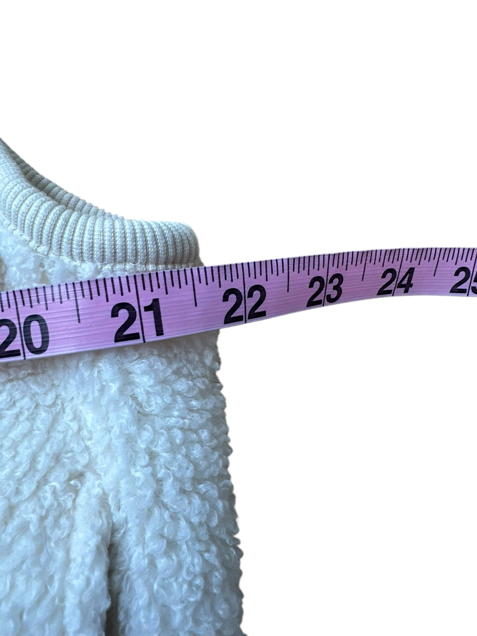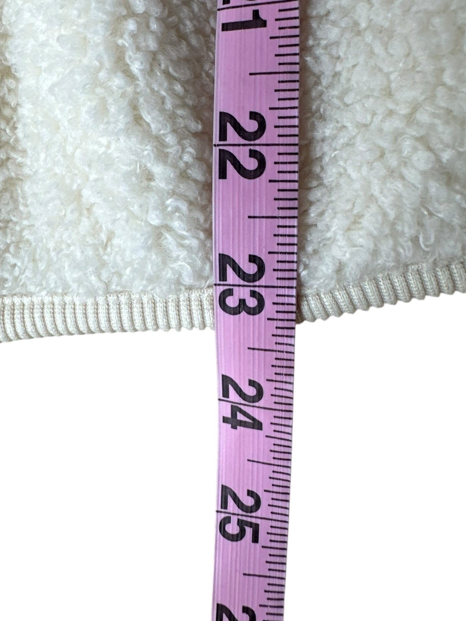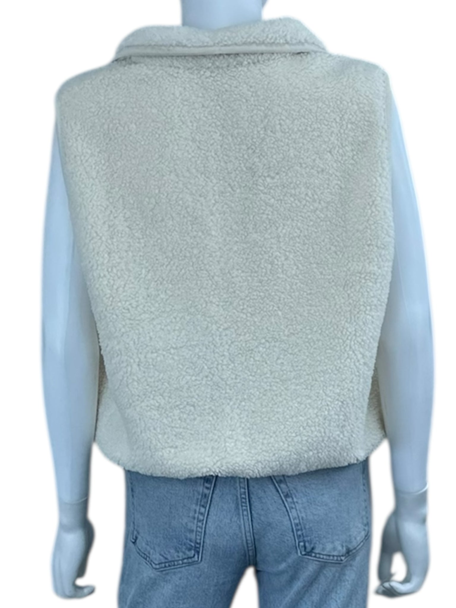 Cream teddy bear vest with quarter zip closure and adjustable tie closure at neck.