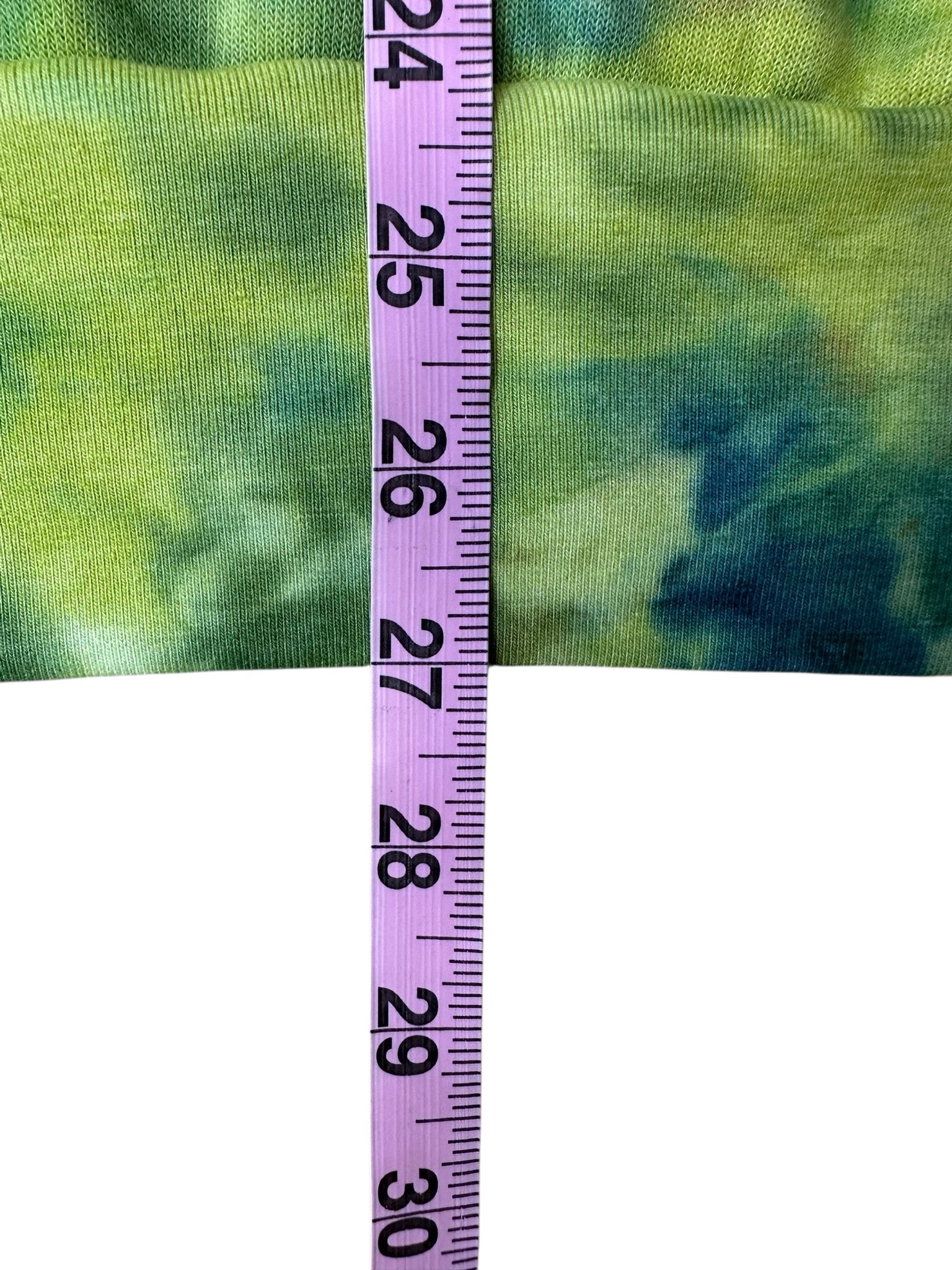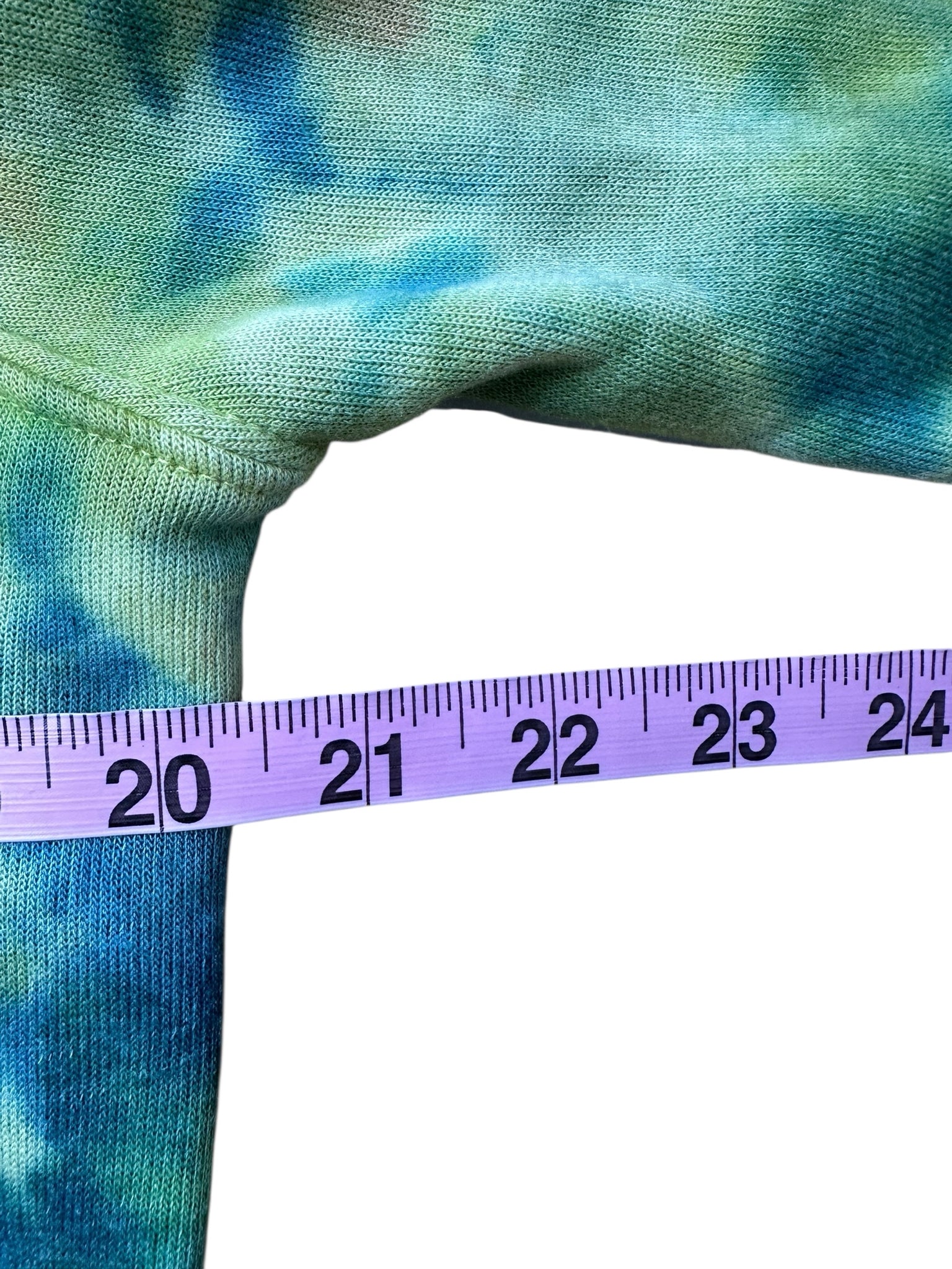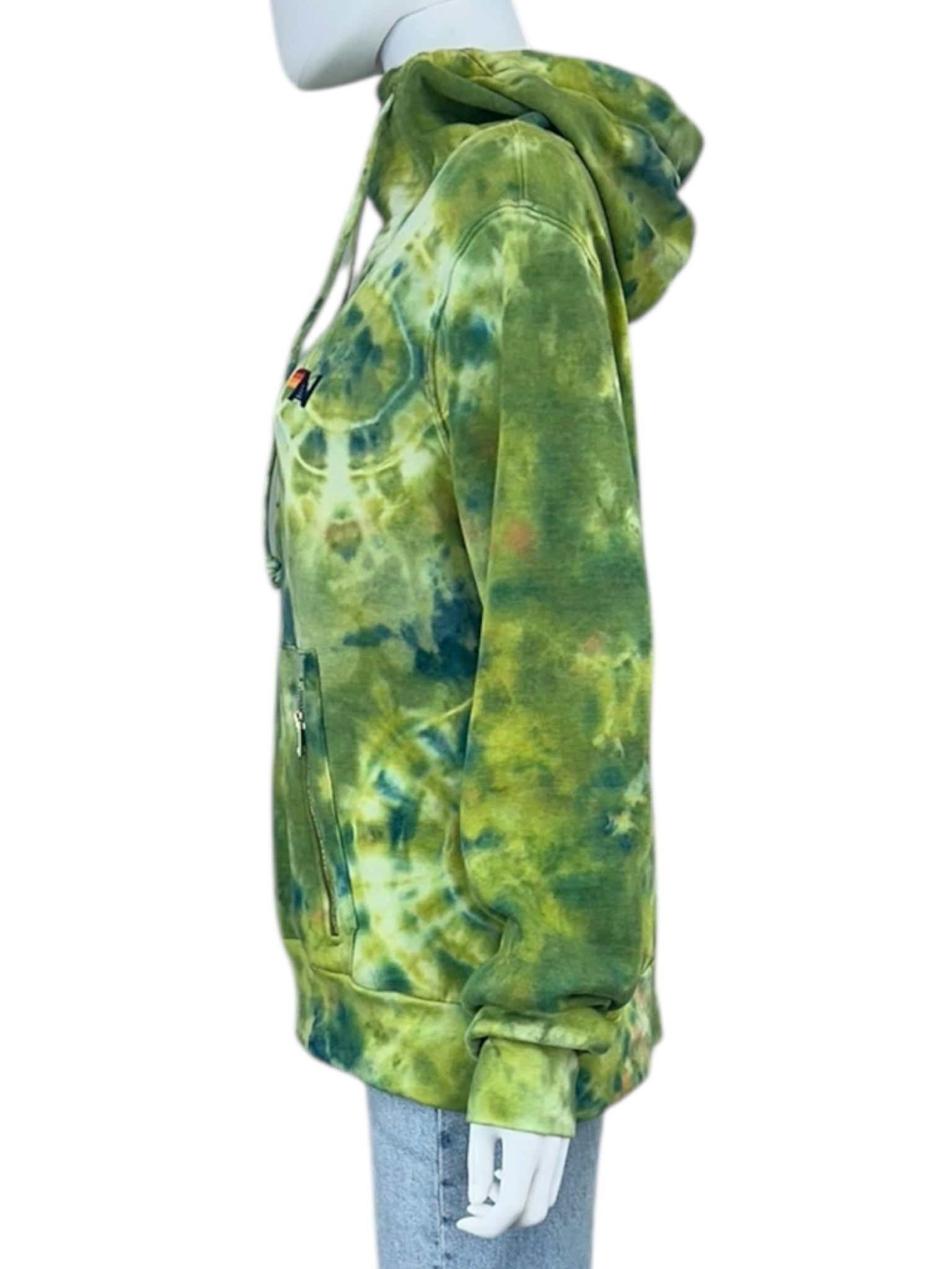 Green and blue tie dye hoodie with a drawstring hood and a middle pocket with gold zipper closures.