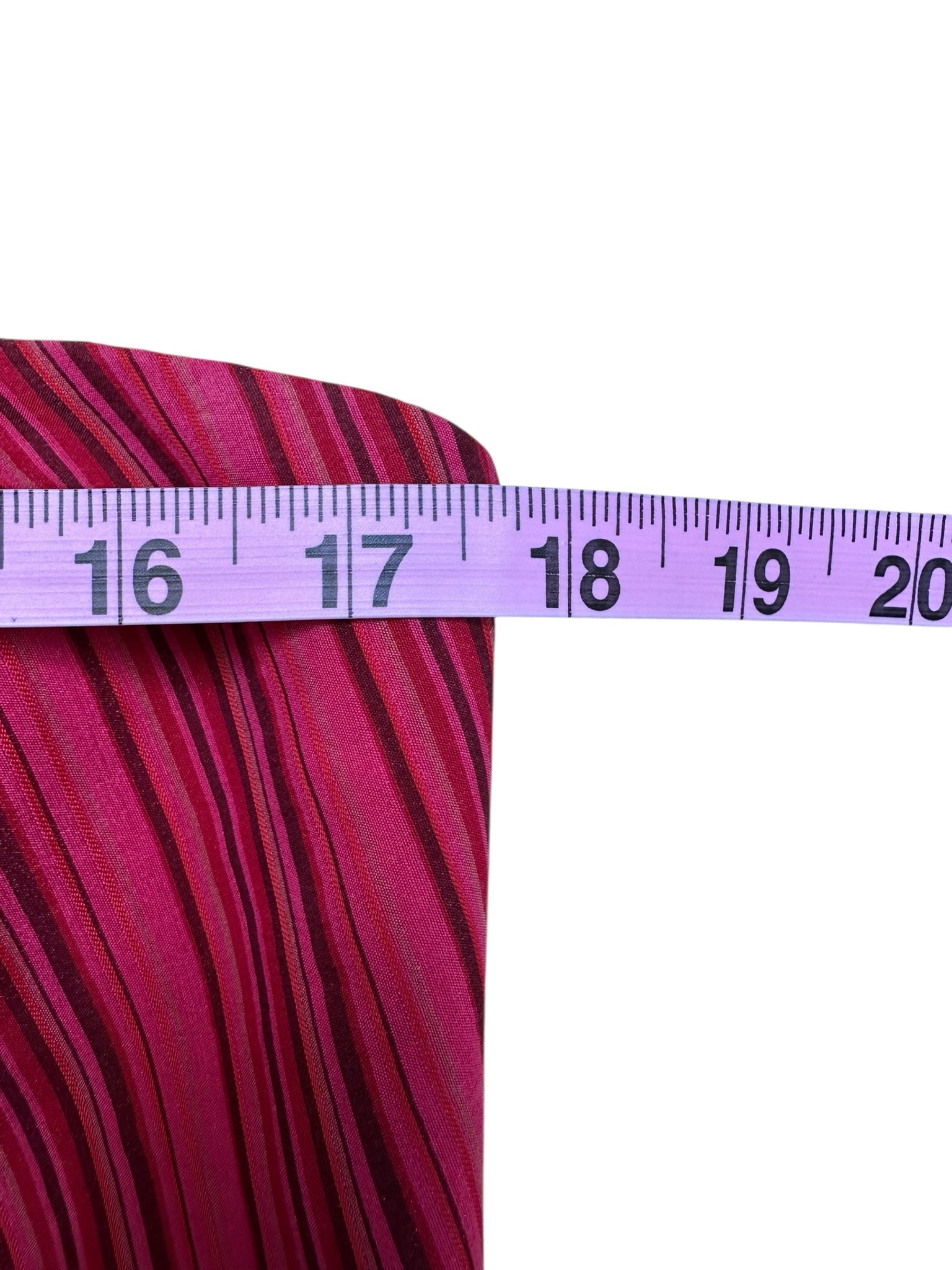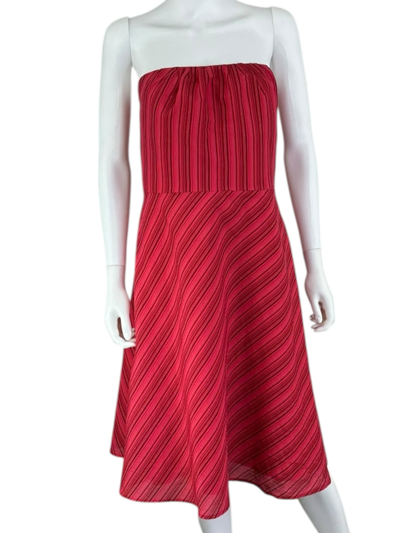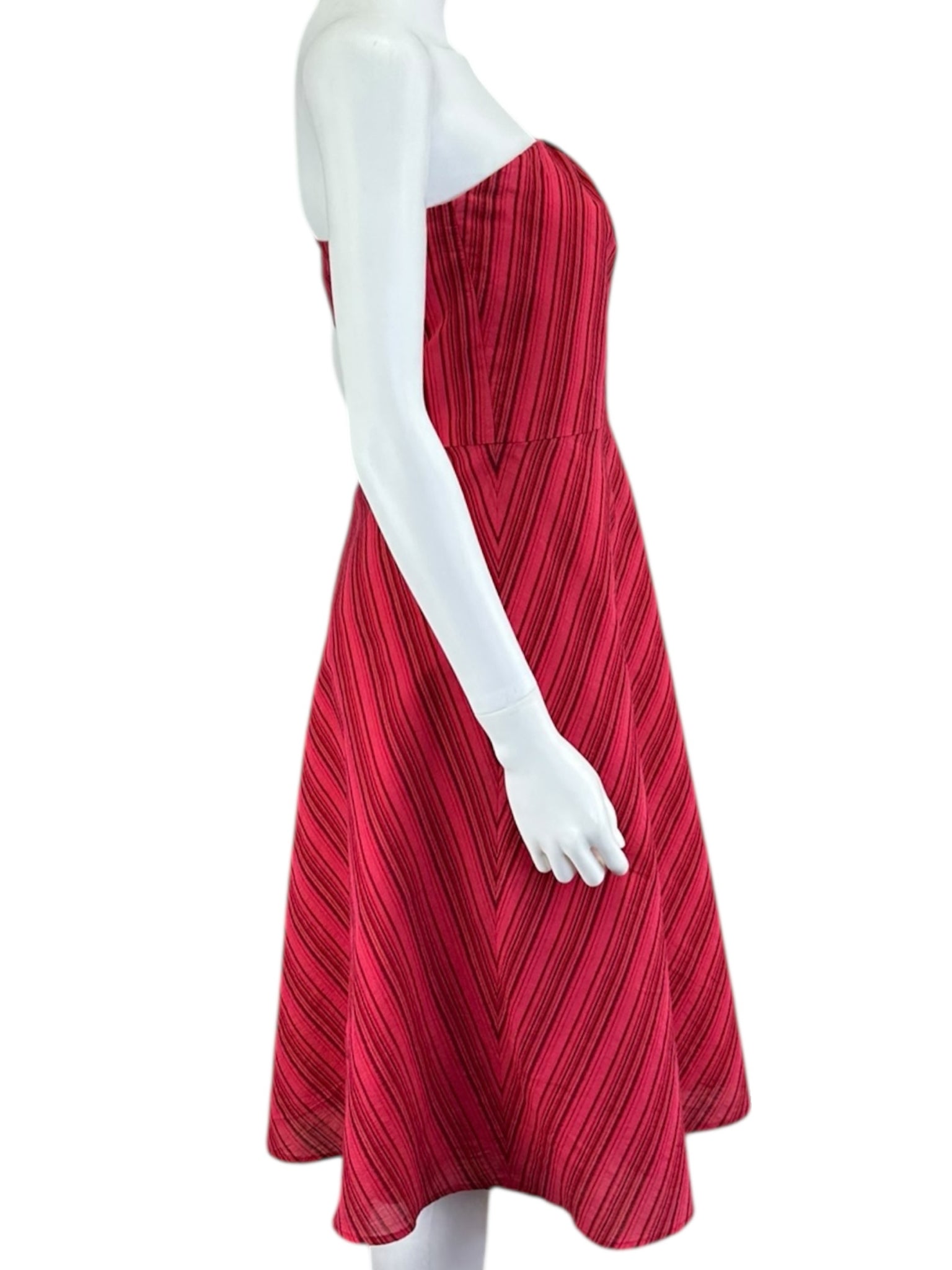 Red striped cotton blend strapless dress with a side zipper closure. Dress is lined and is designed in a fit and flare style.
