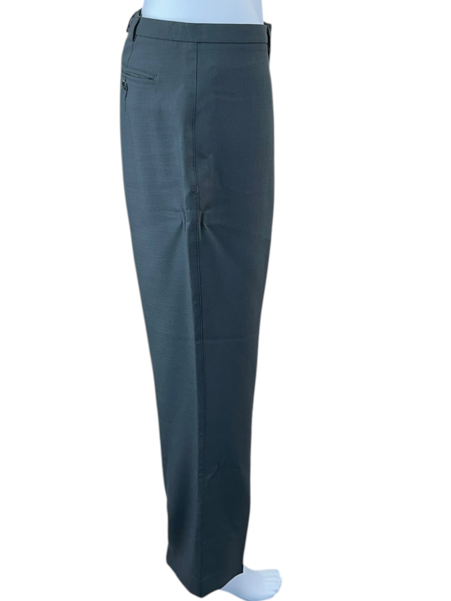 100% wool gray high rise straight leg trouser with single back pocket and front zipper/hook closure.