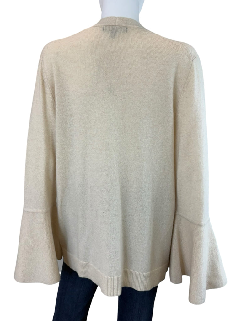 Super soft and cozy 100% cashmere cream sweater cardigan with long sleeves with a split bell cuff and an open front.