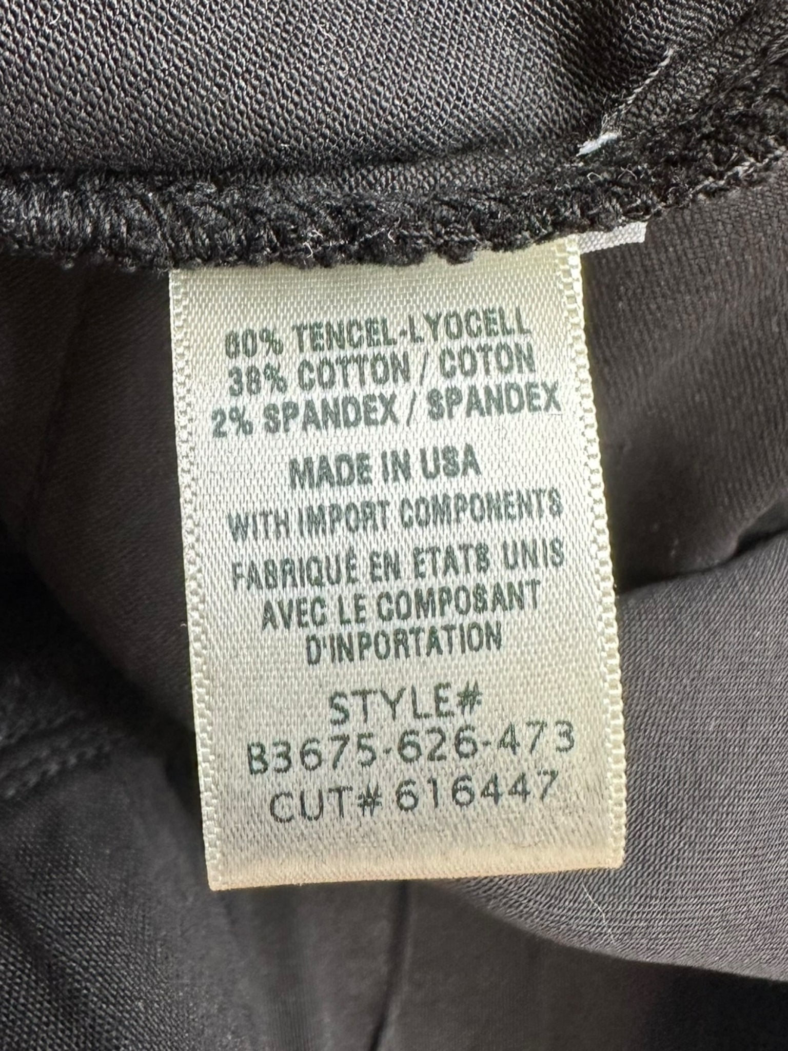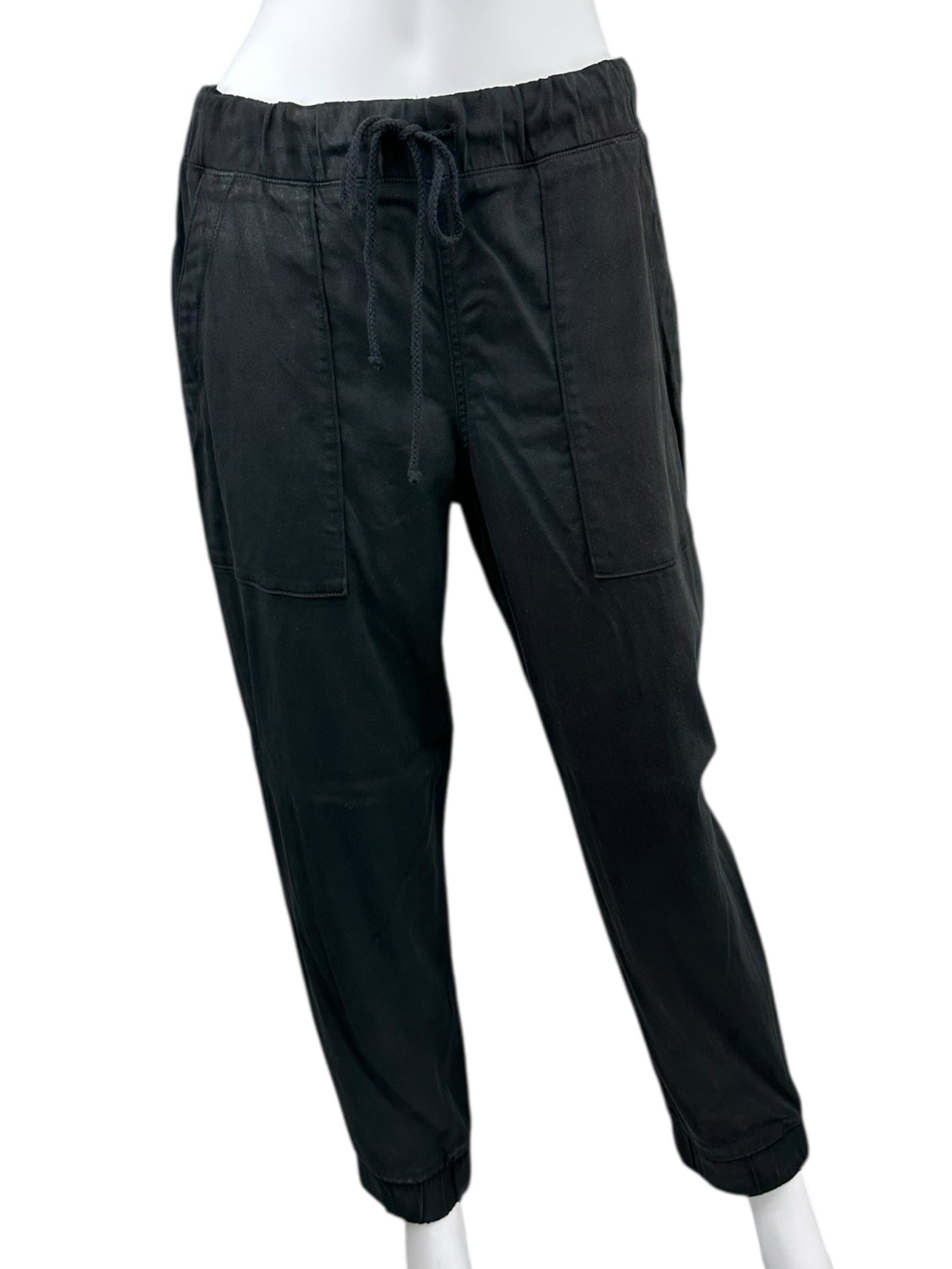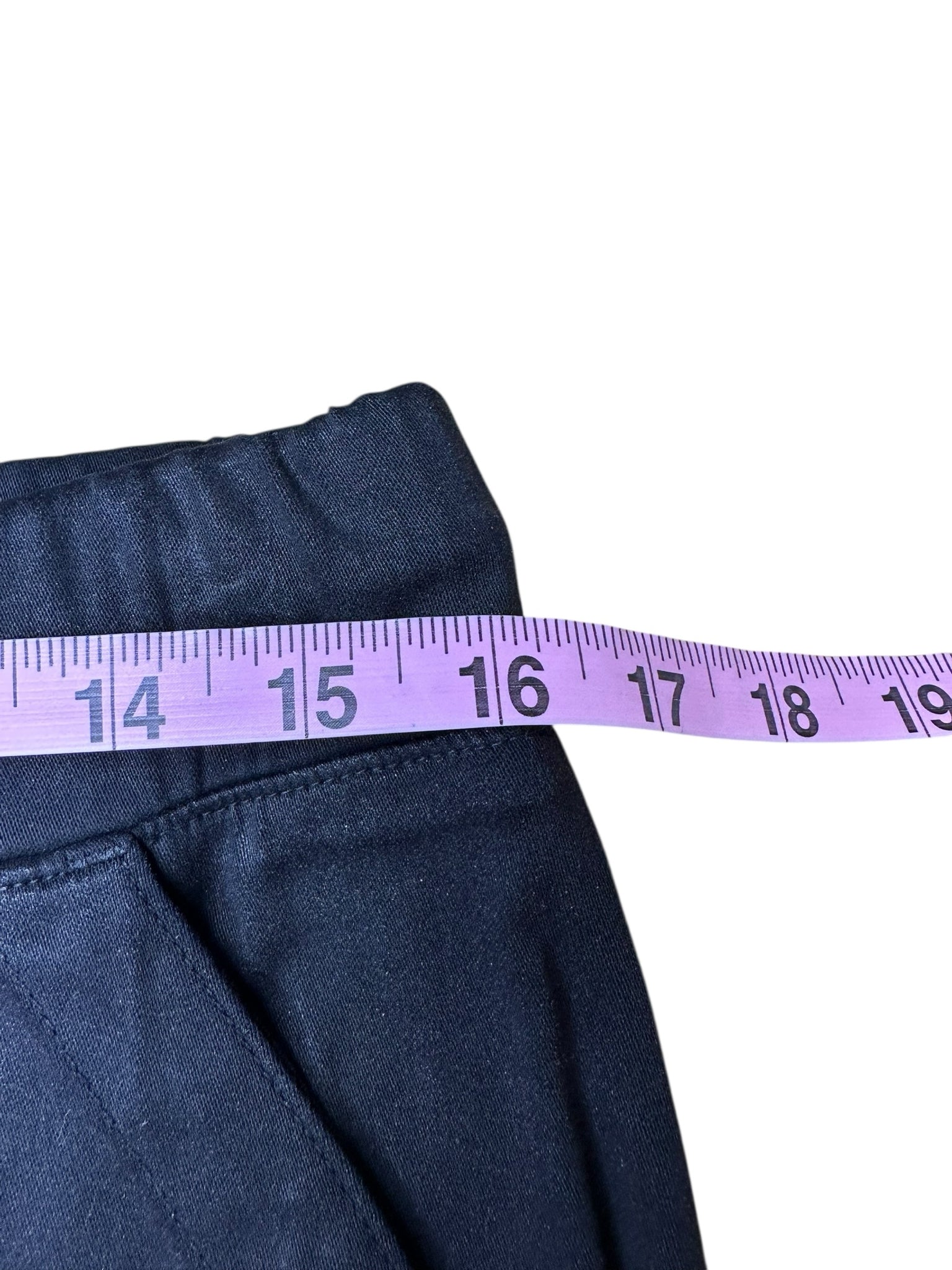 These black shimmer jogger-style pants feature a relaxed fit with a comfortable elastic waistband and adjustable drawstring. Finished with back pockets and cuffed ankles, they offer an easy, casual look with a clean, minimalist feel.