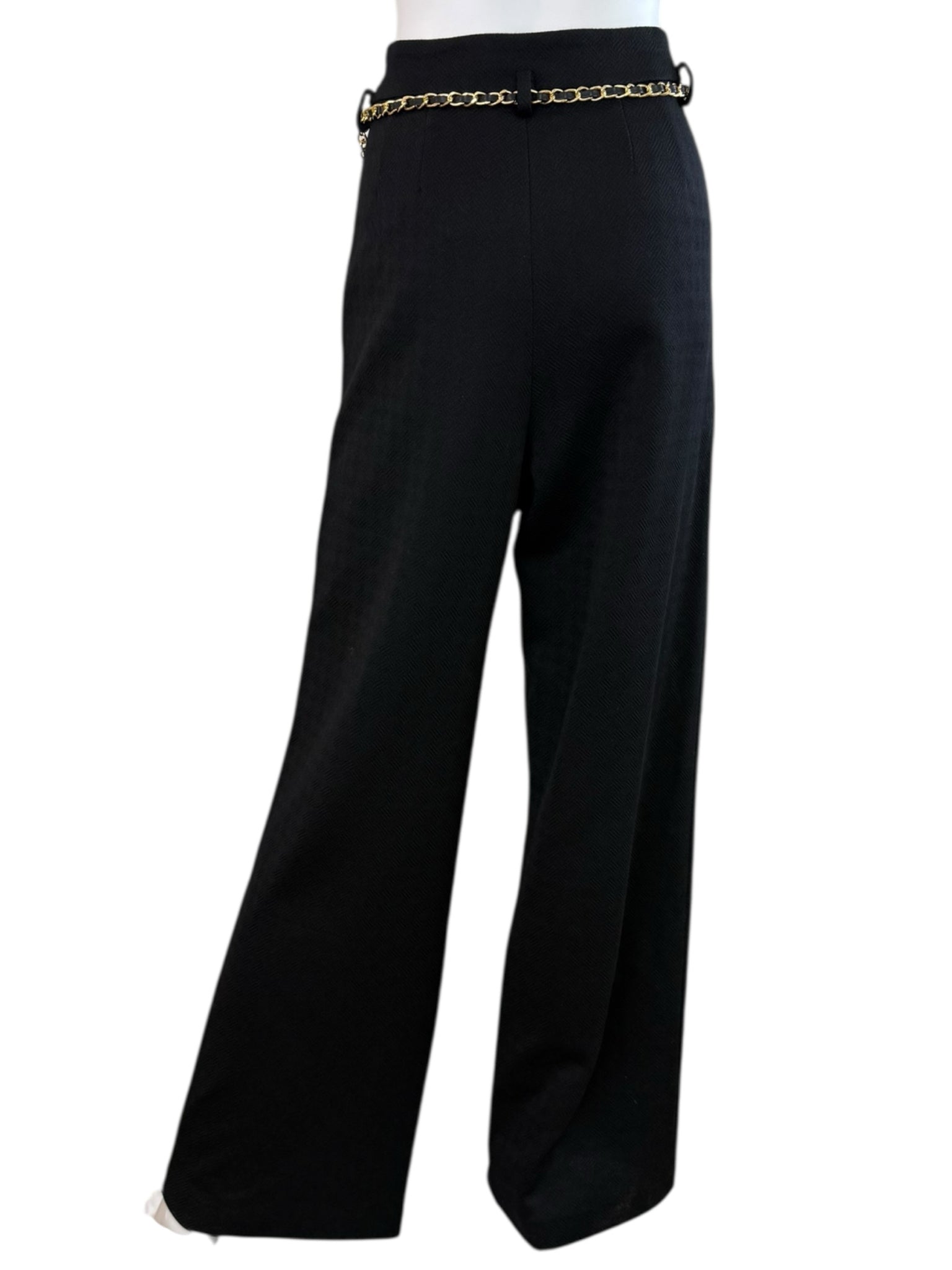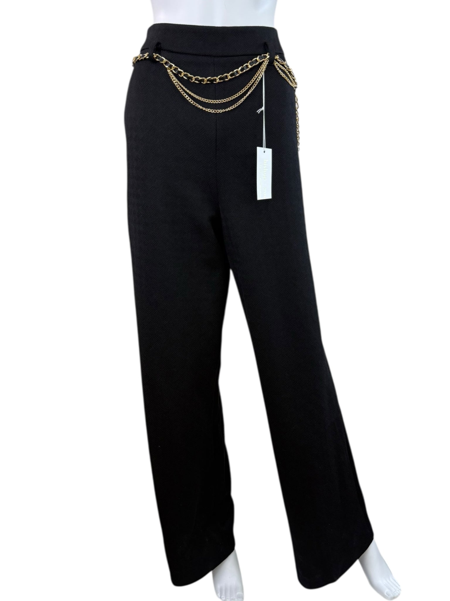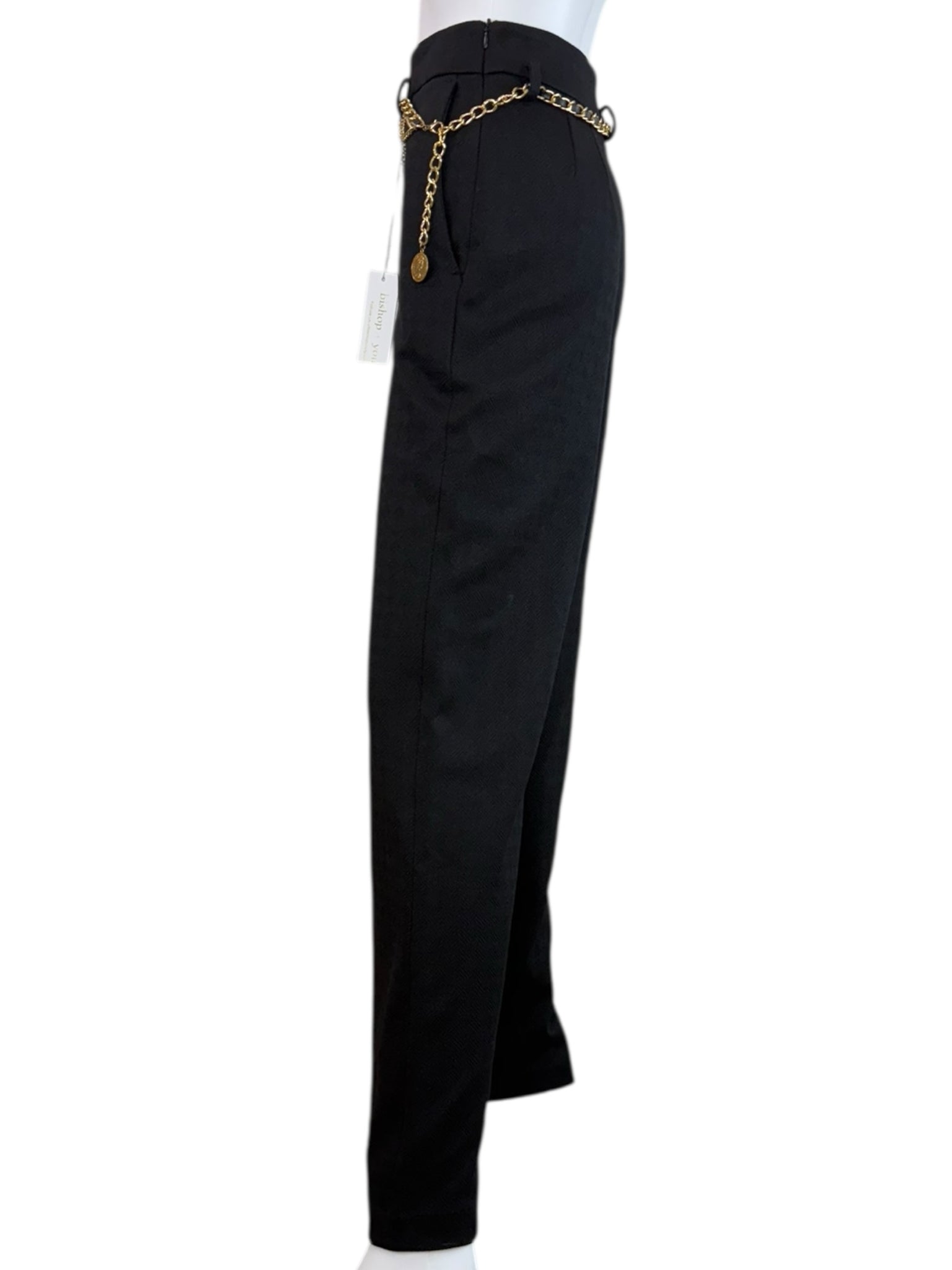 New with tags! Black wide leg trousers with front pockets, side zipper closure and a removeable gold chain belt.