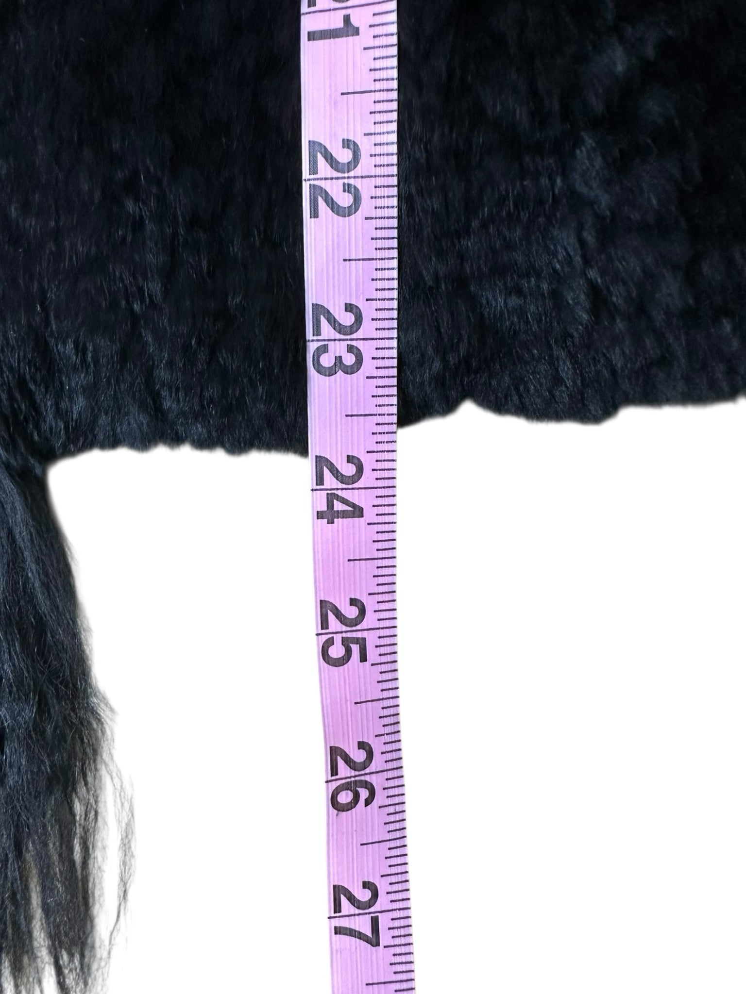 Black fur jacket with a single hook front closure and fuzzy lining.