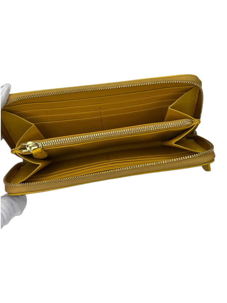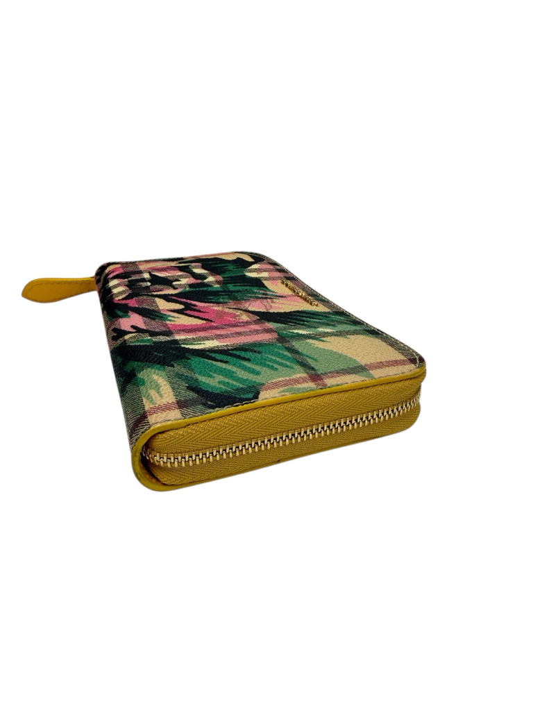 Peony rose printed haymarket check coated canvas zip around wallet with yellow leather interior. Interior features 2 slip pockets, 9 card slot pockets and a zipper closure coin pocket. Wallet measures 4.25" x 7.5" x 1.0" and is in perfect condition with no signs of wear present.