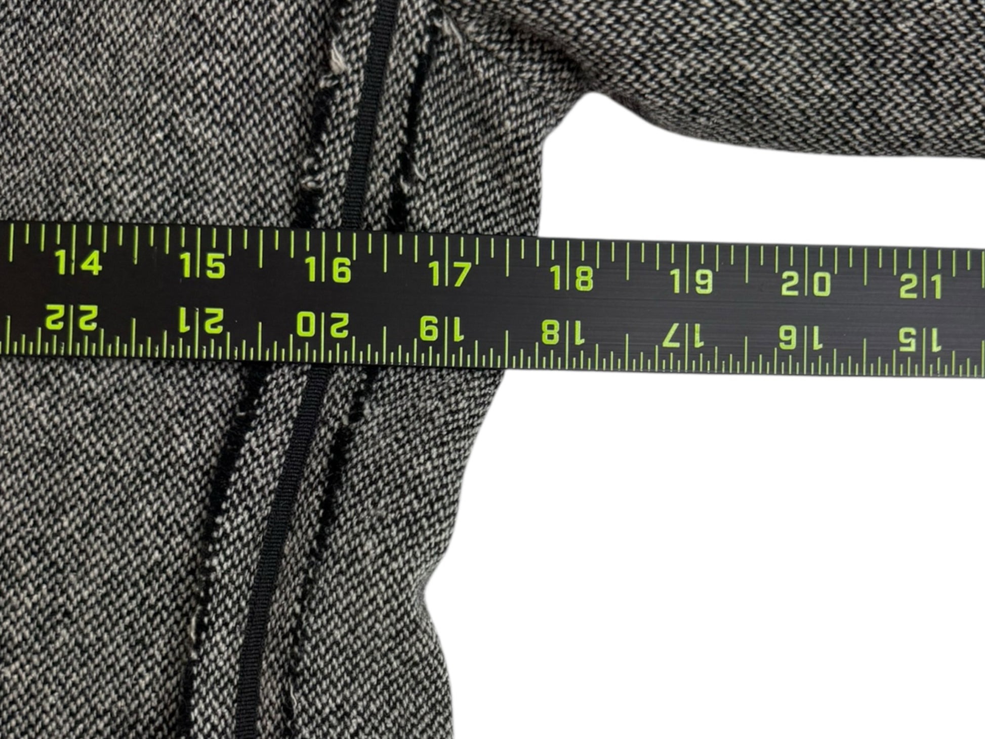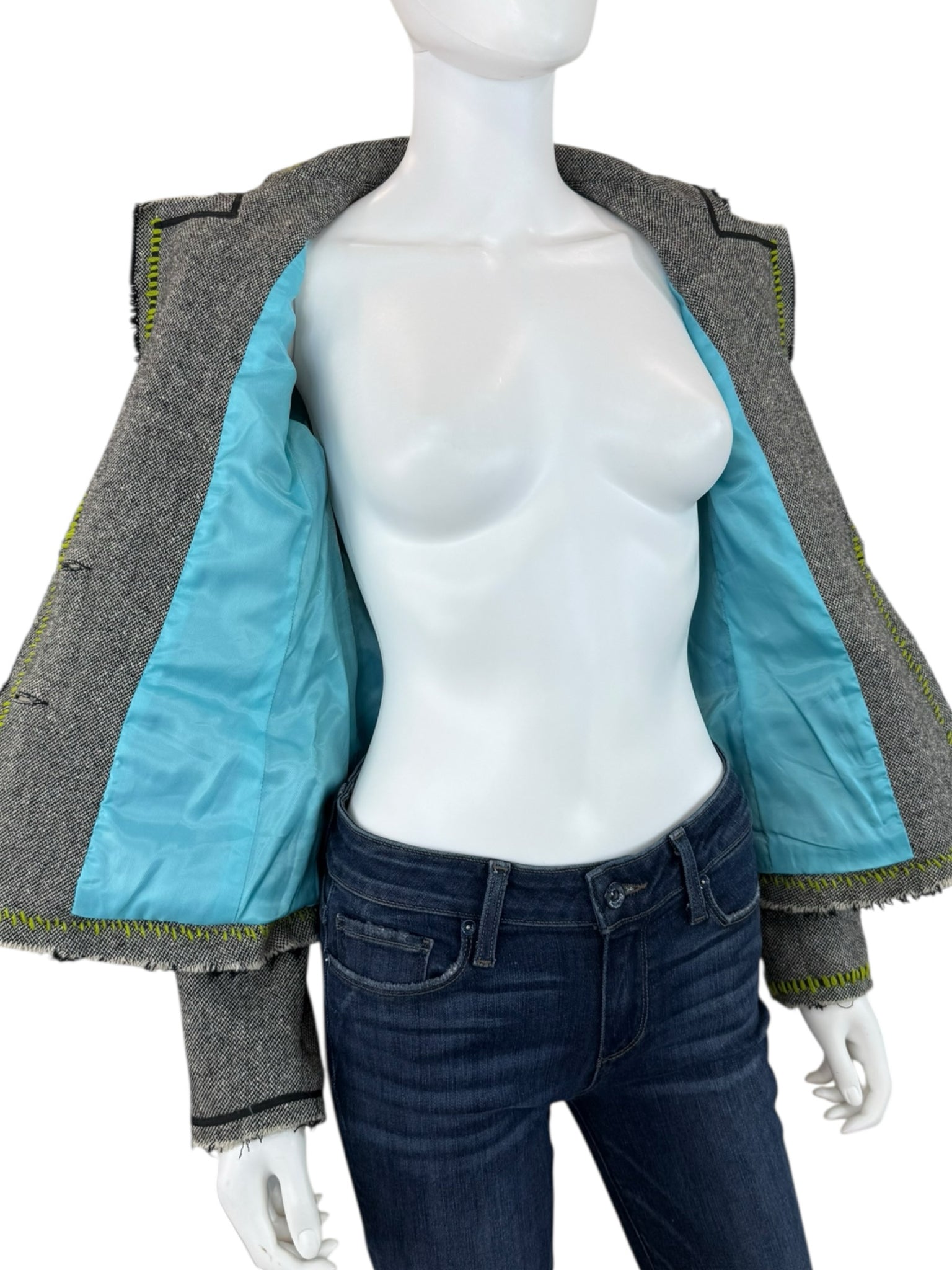 Black and white long wool blend tweed blazer jacket with long sleeves, embroidered and raw edge design, front pockets and a button front closure.