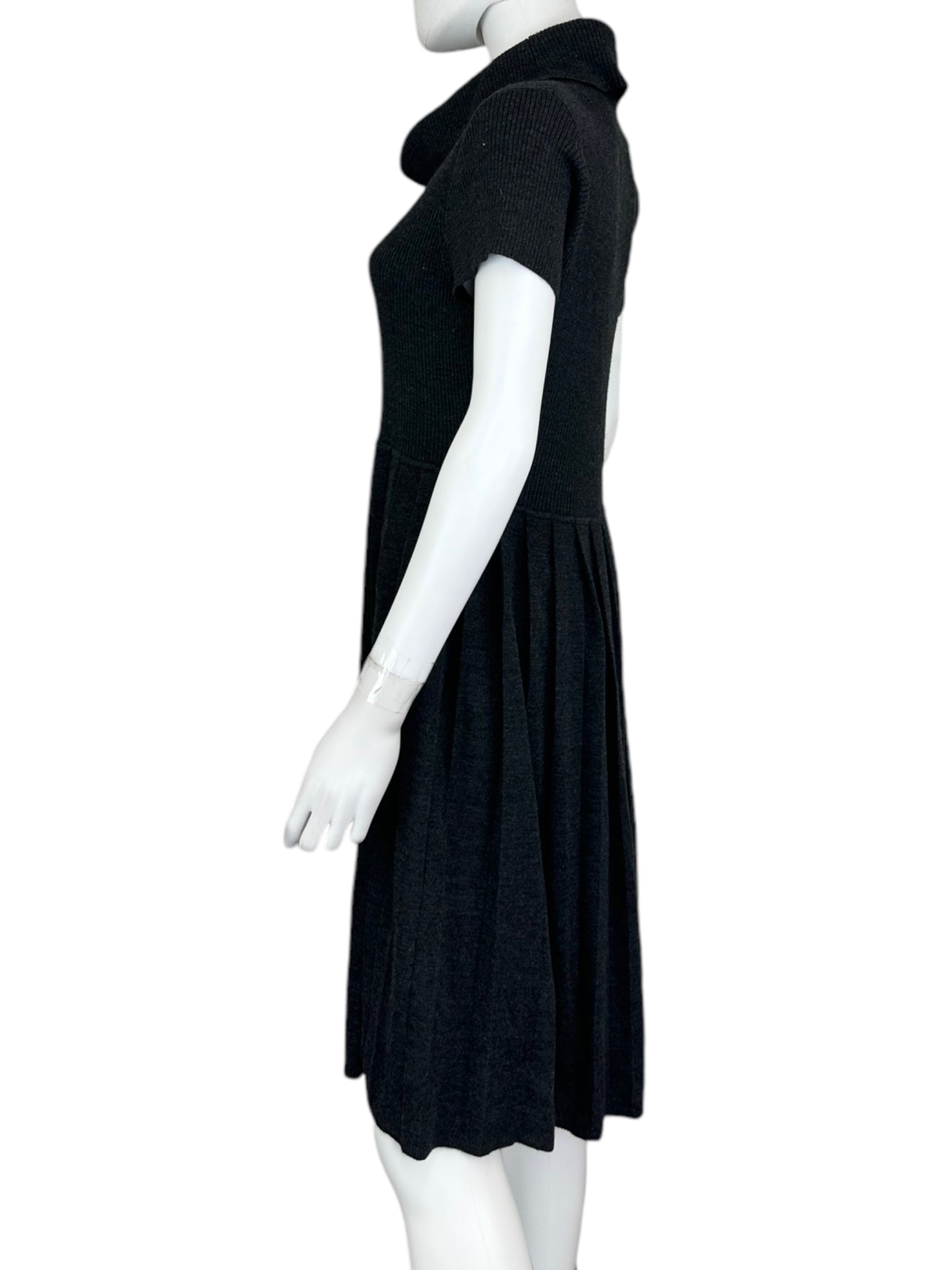 Gray wool blend short sleeve ribbed mini sweater dress with a pleated skirt and a turtle neck.