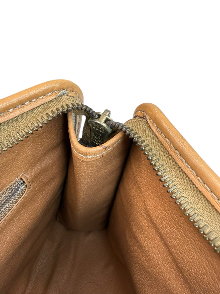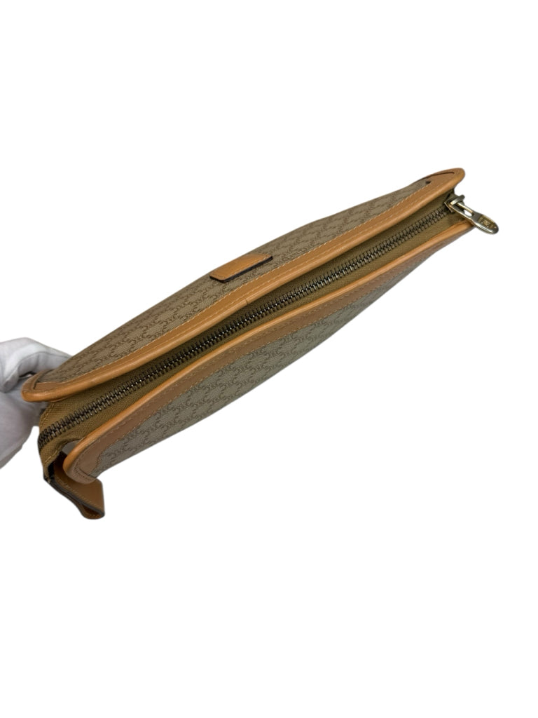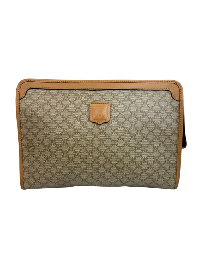 Beige monogram macadam canvas and leather clutch bag with zipper closure and interior zipper closure pocket. Clutch measures 10.5" x 8.0" x 2.5". Wear present to zipper pull and corners as pictured.
