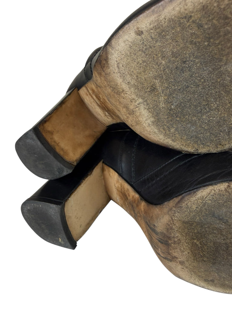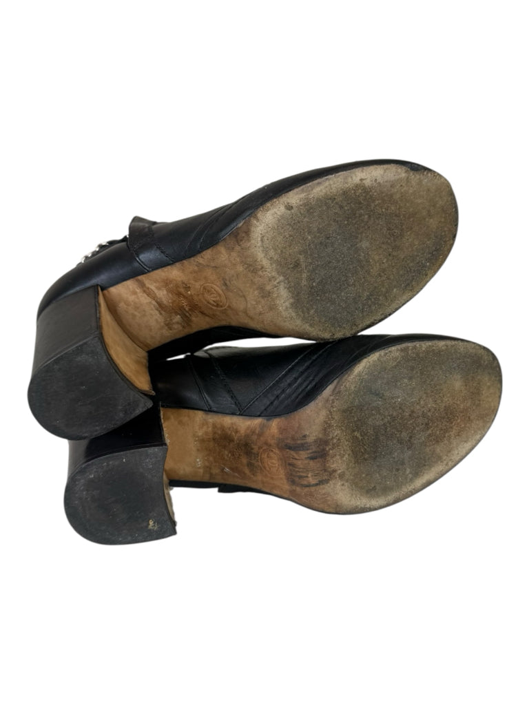 Soft black leather ankle boot with a rounded toe, side zipper closure, silver chain accent and a 3 inch block heel. Boots are in good pre-loved condition with very minimal signs of wear with exception of wear to interior heel and bottom of shoe as pictur