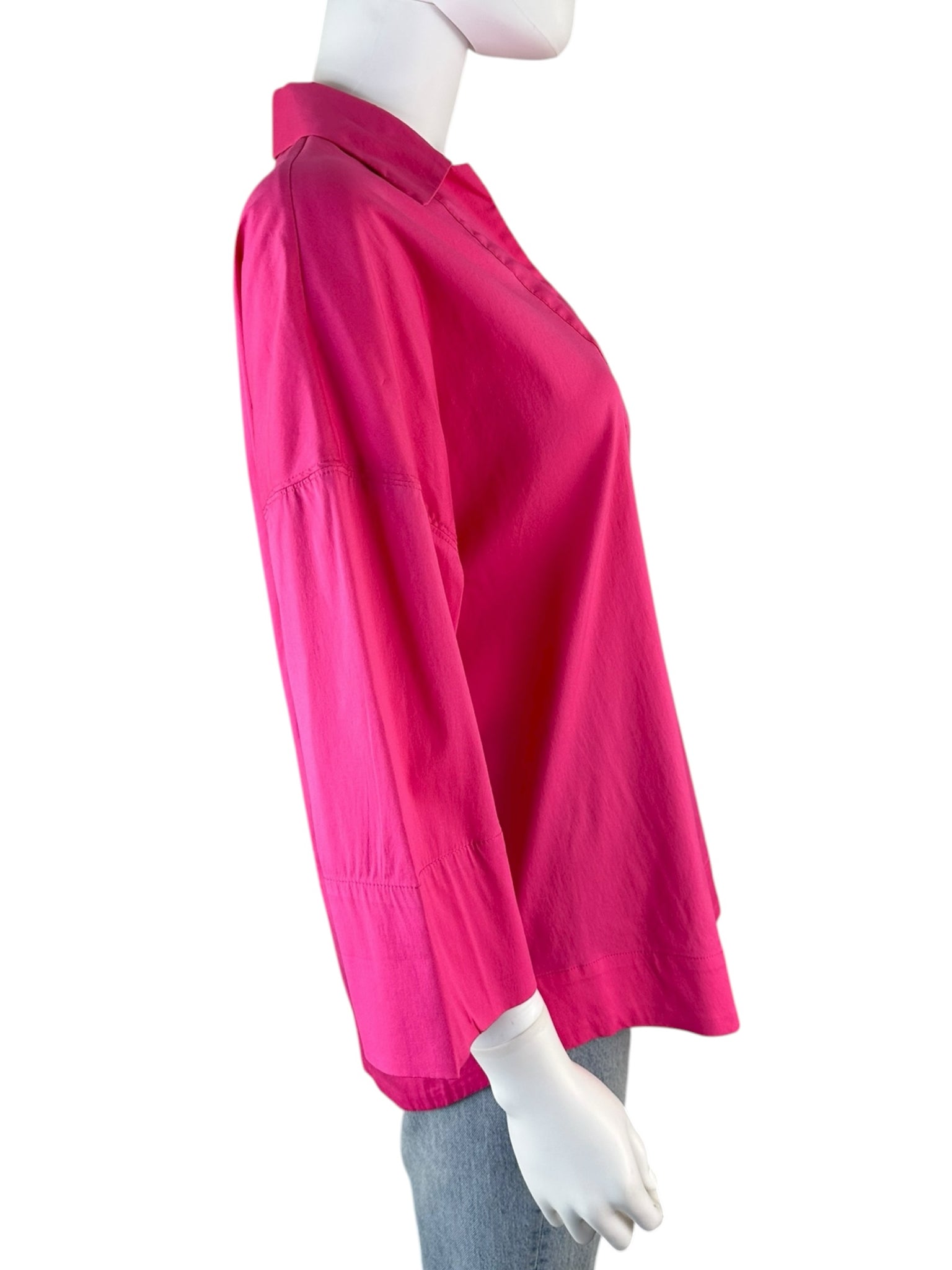 Bright pink cotton blend popover top with collared split neck opening with snap closure and 3/4 length sleeves.