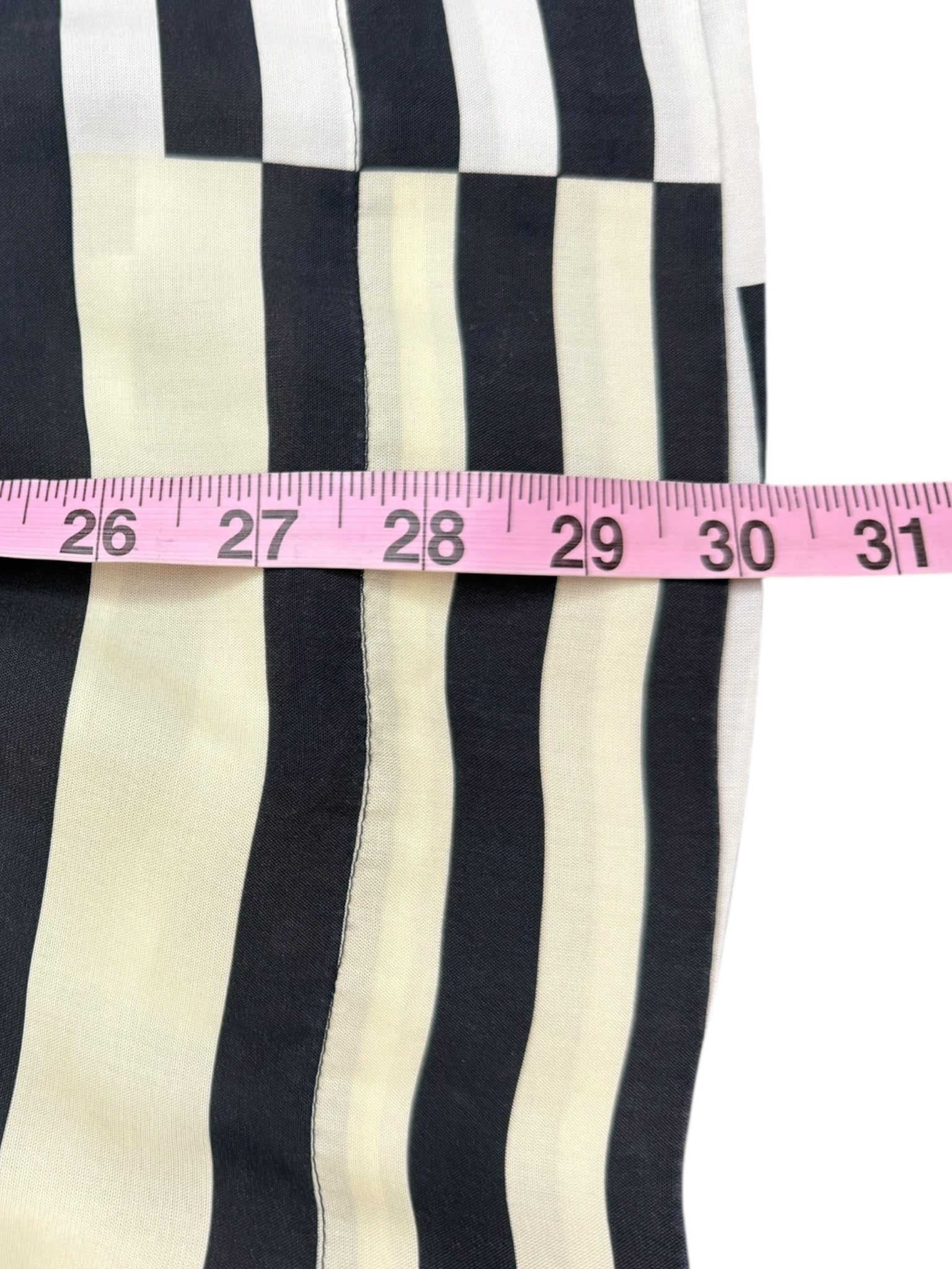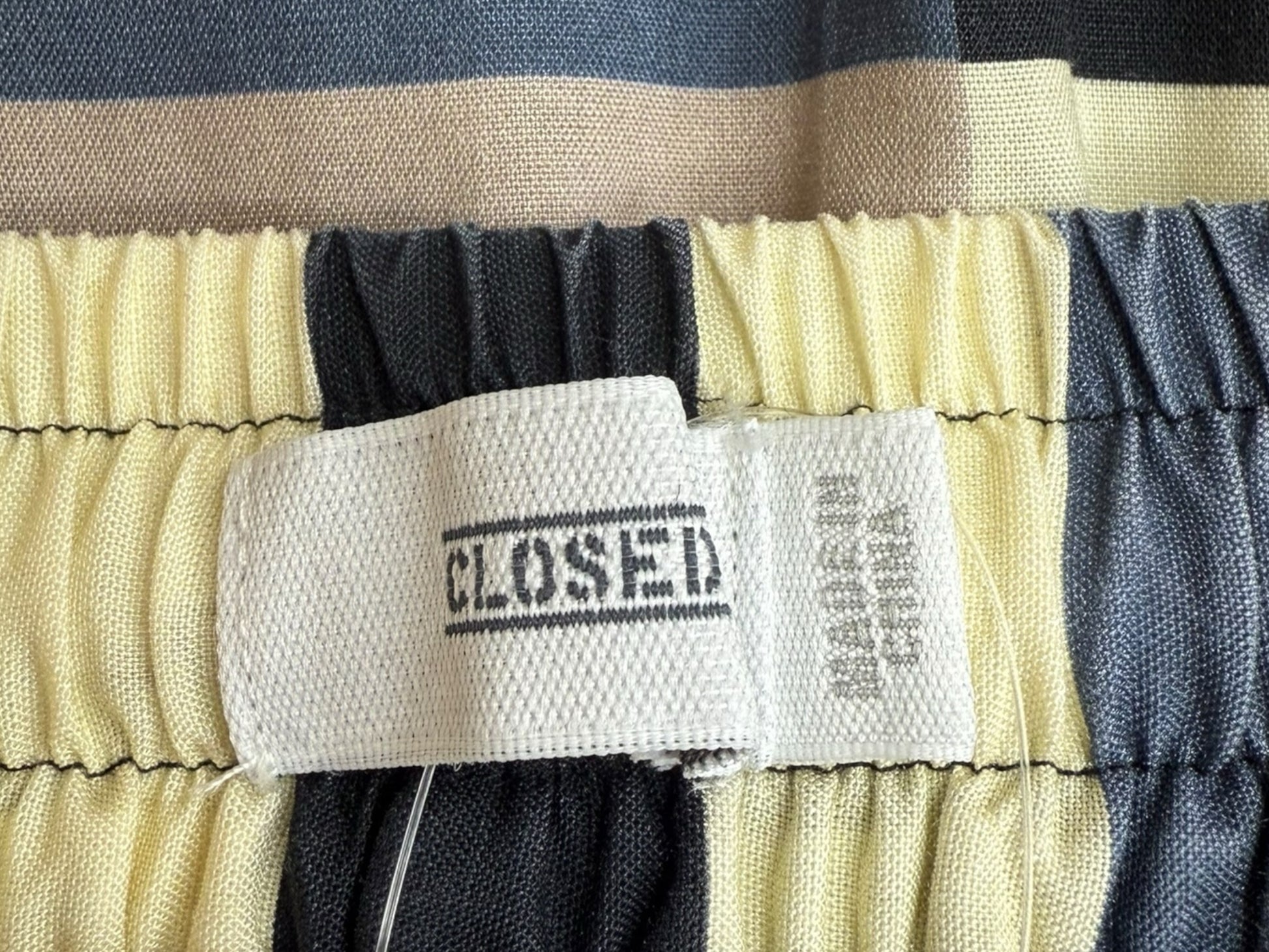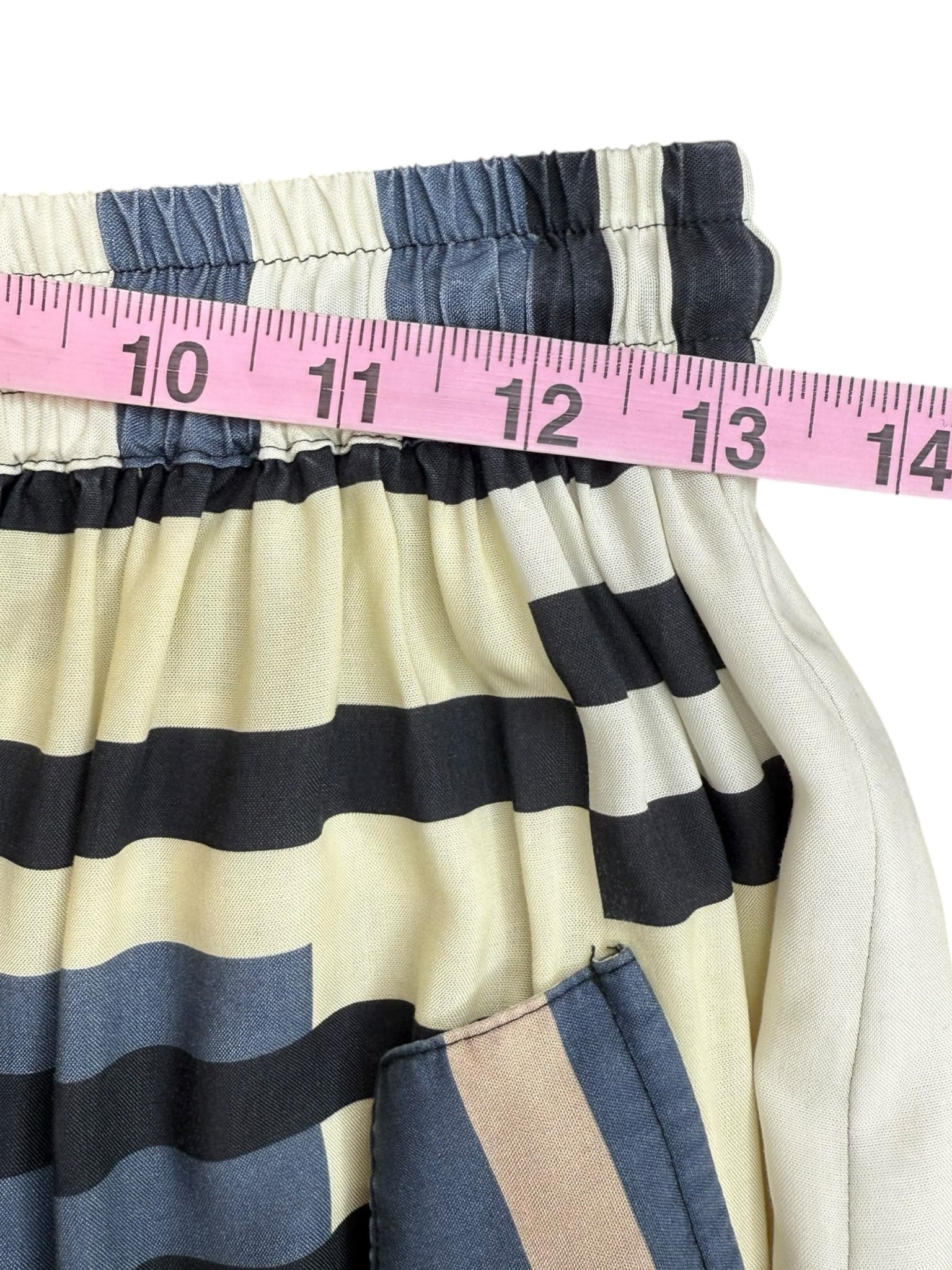 Multi-colored cream, black, tan & blue color block striped print midi skirt with front pockets and an elastic waistband with adjustable tie closure.