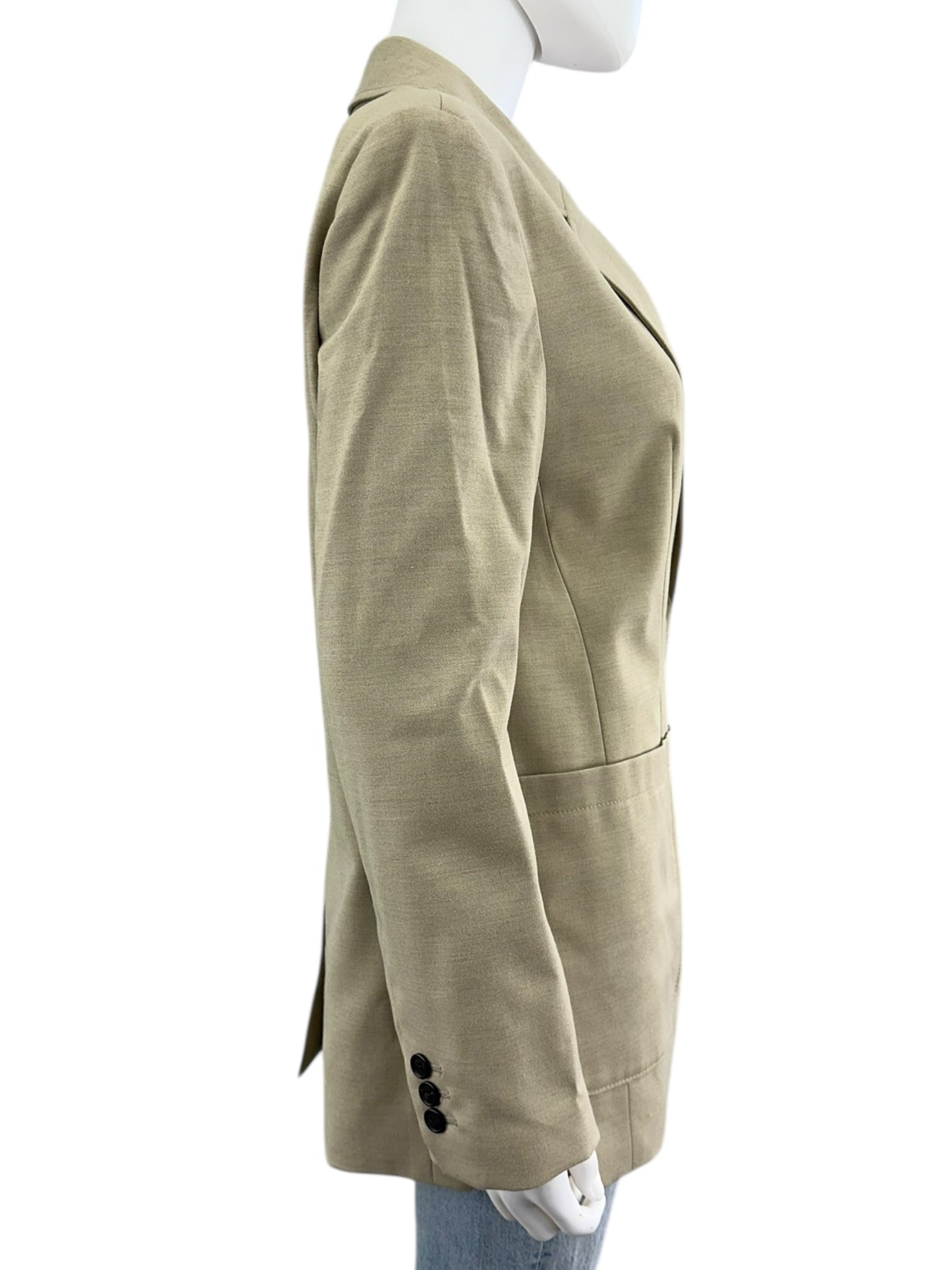 Beige oversized notched collar blazer with long sleeves, front pockets and a front double button closure.