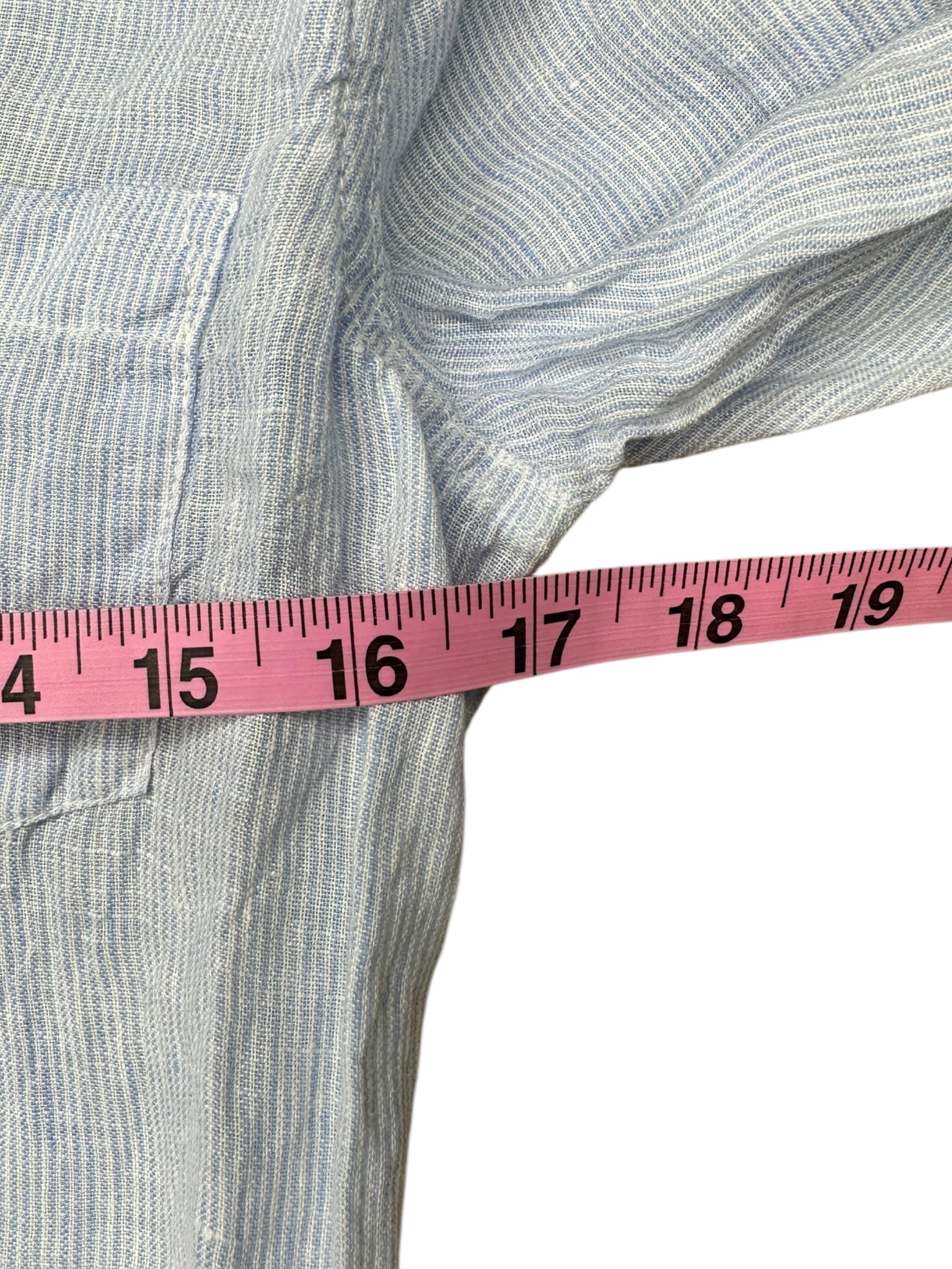 blue and white striped collared button down long sleeve with chest front pocket. Made with 100% linen.