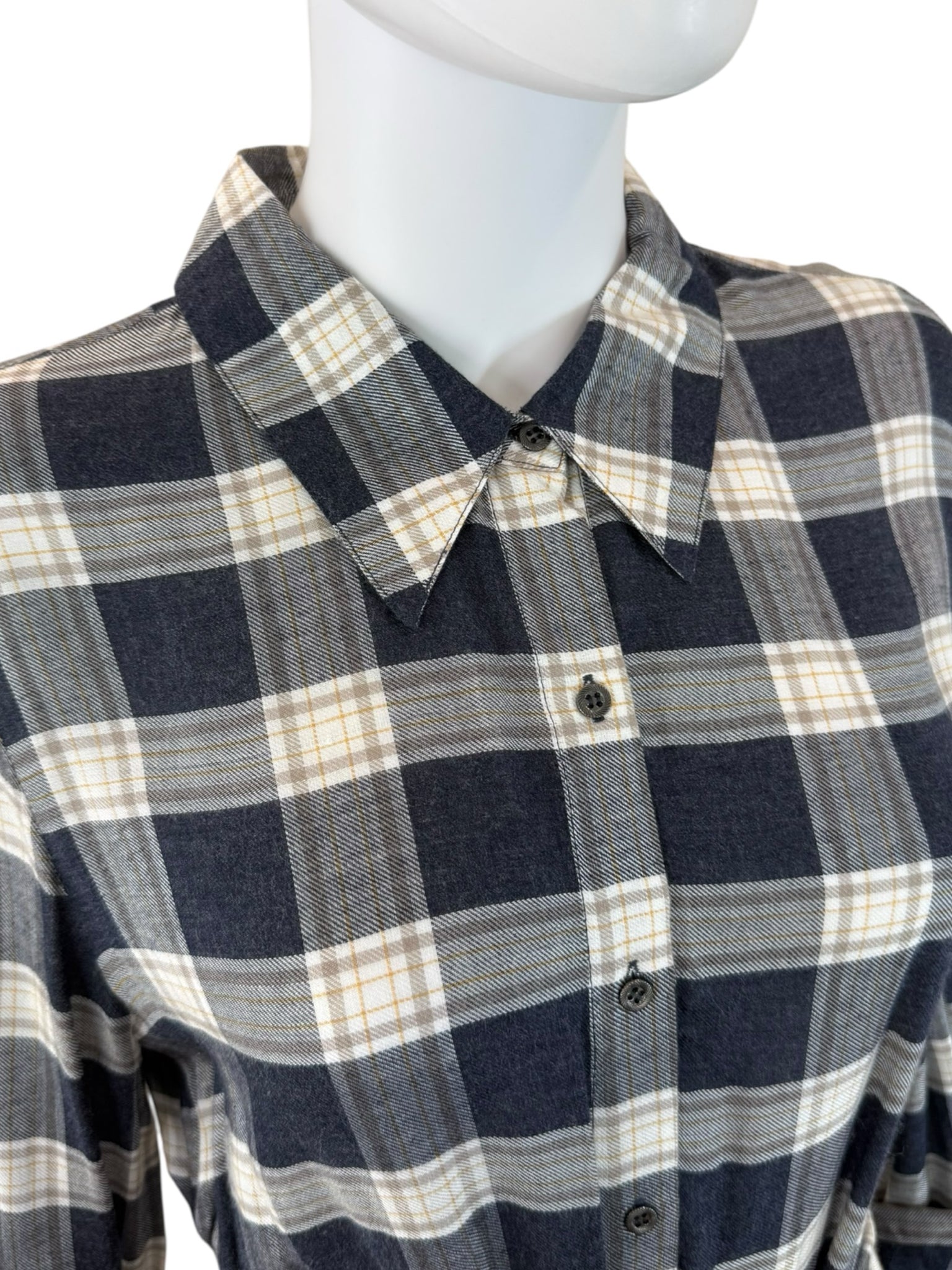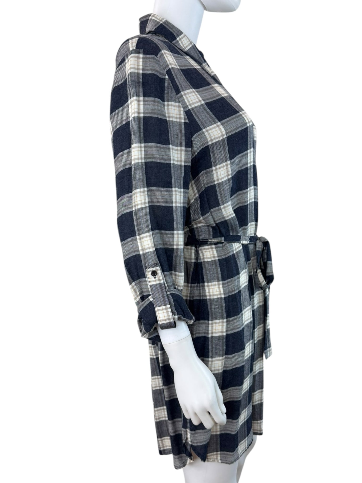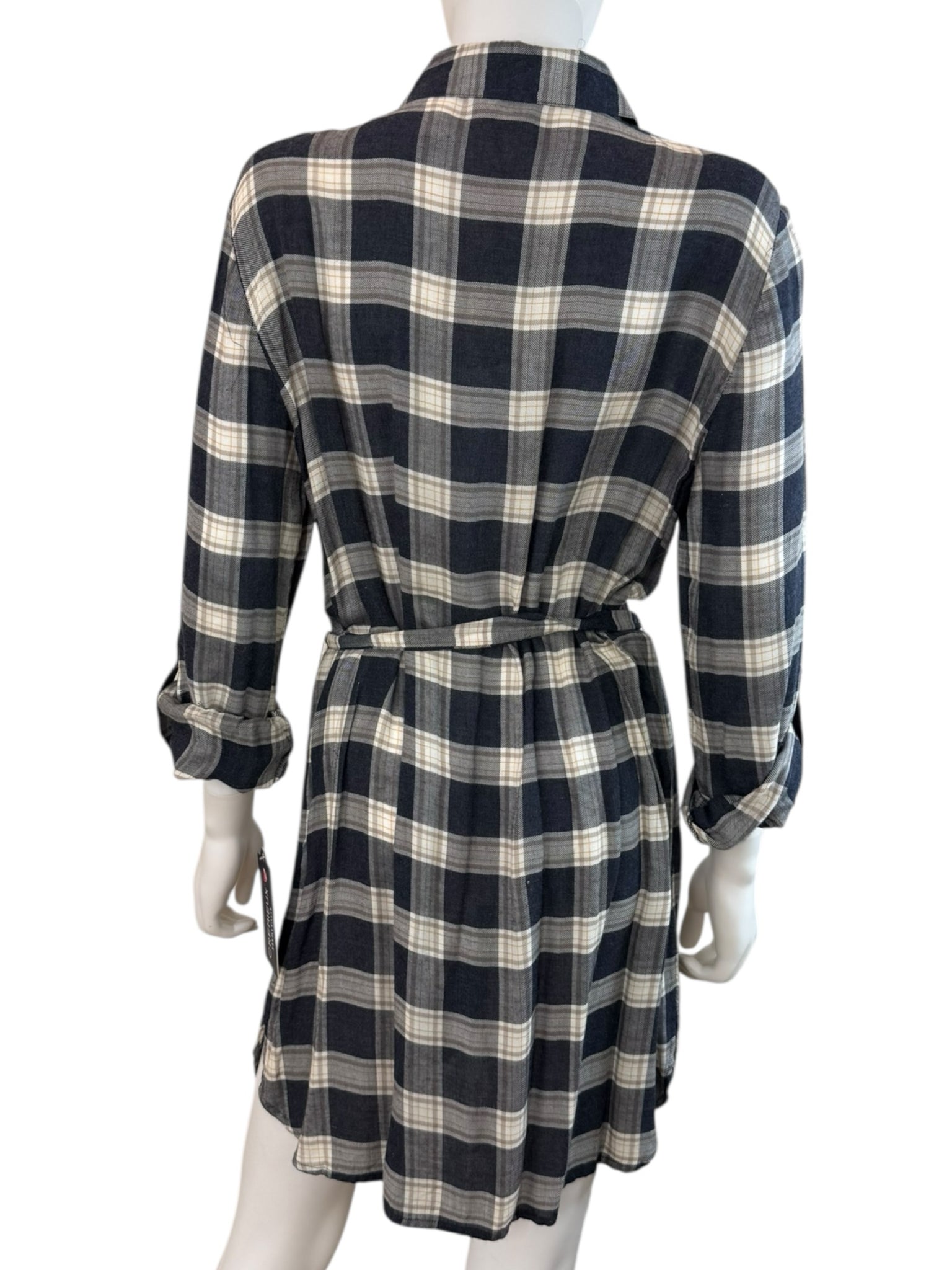 Navy, white, and tan plaid shirt dress with long sleeves and belt.