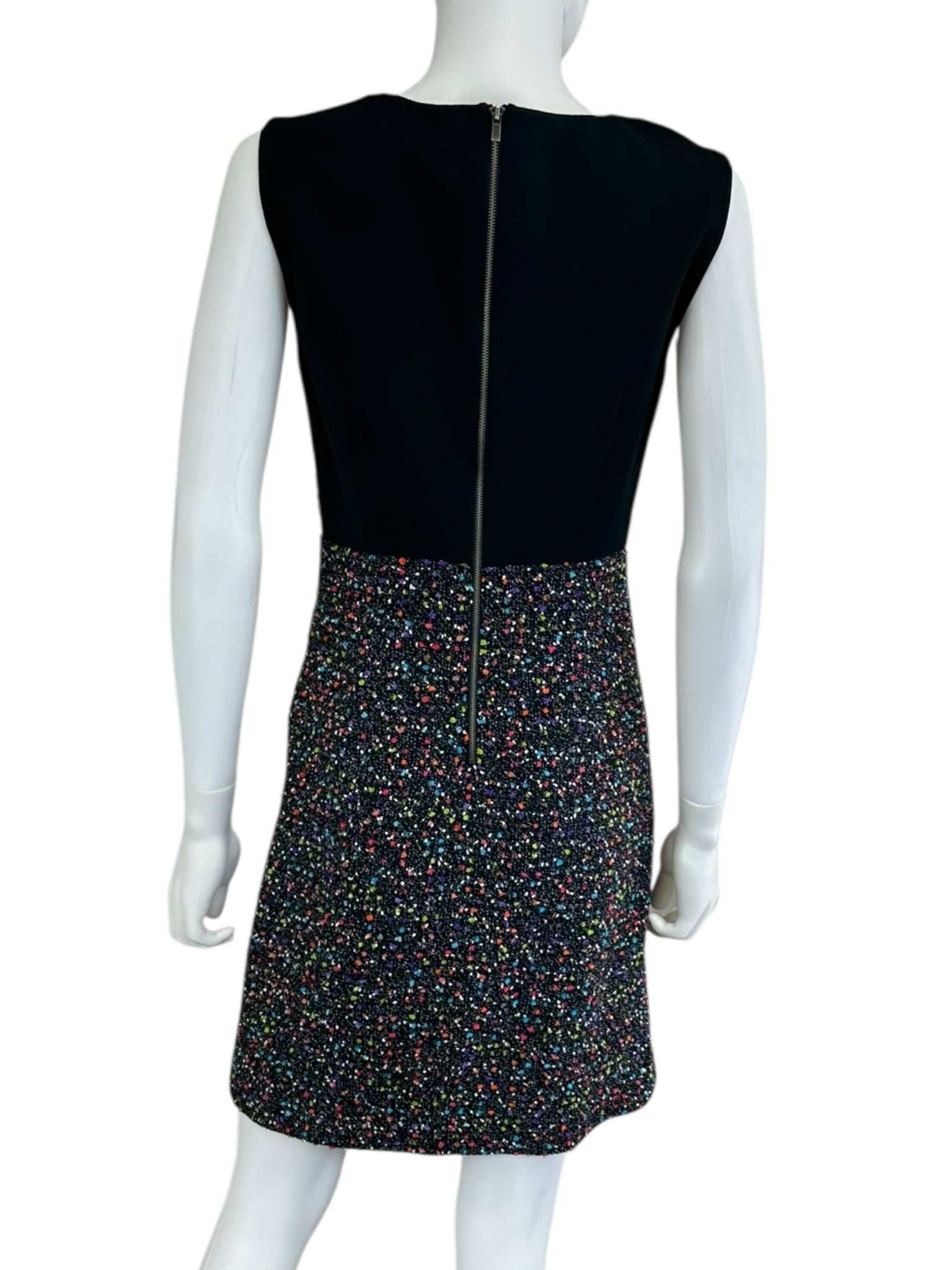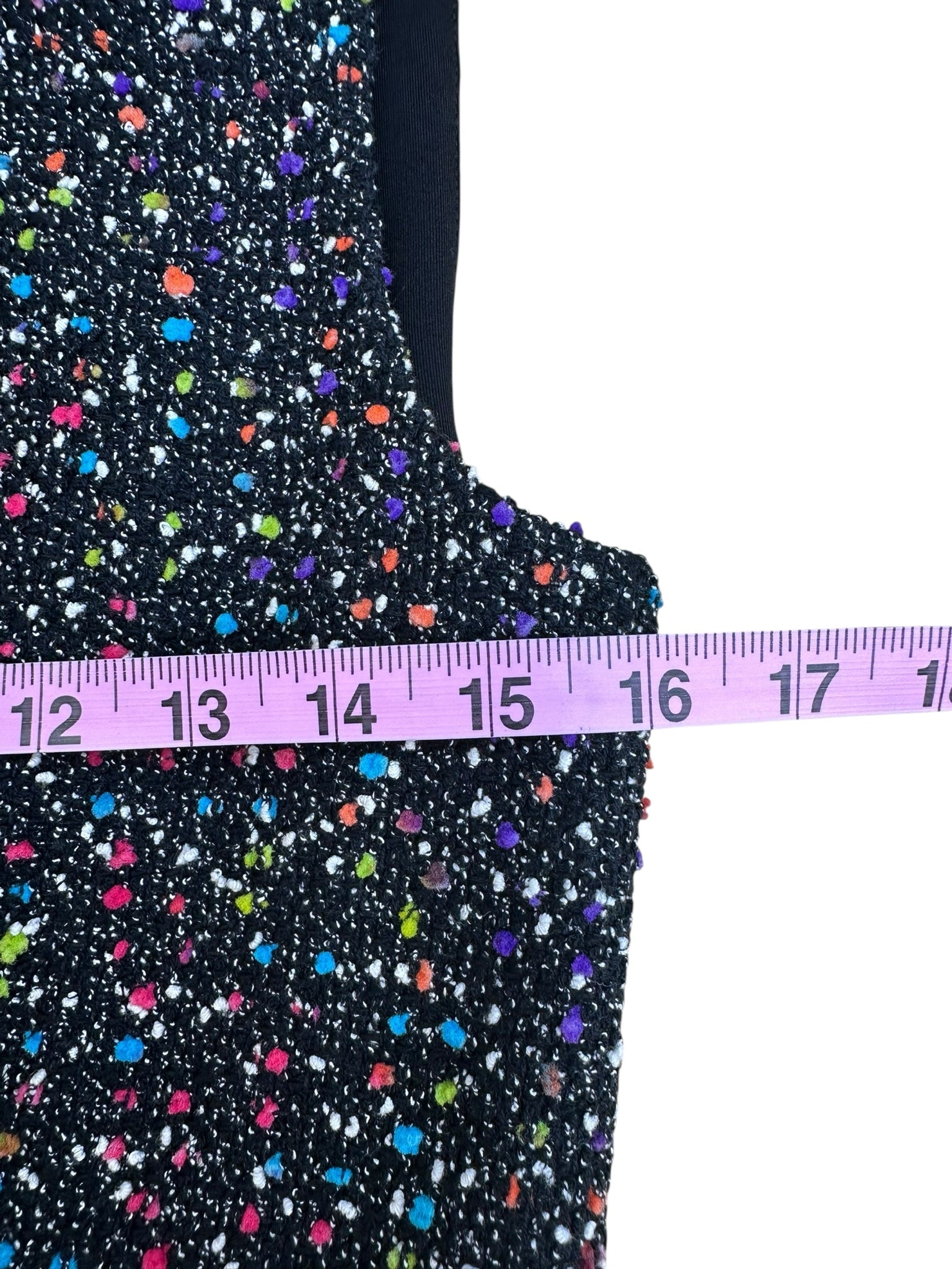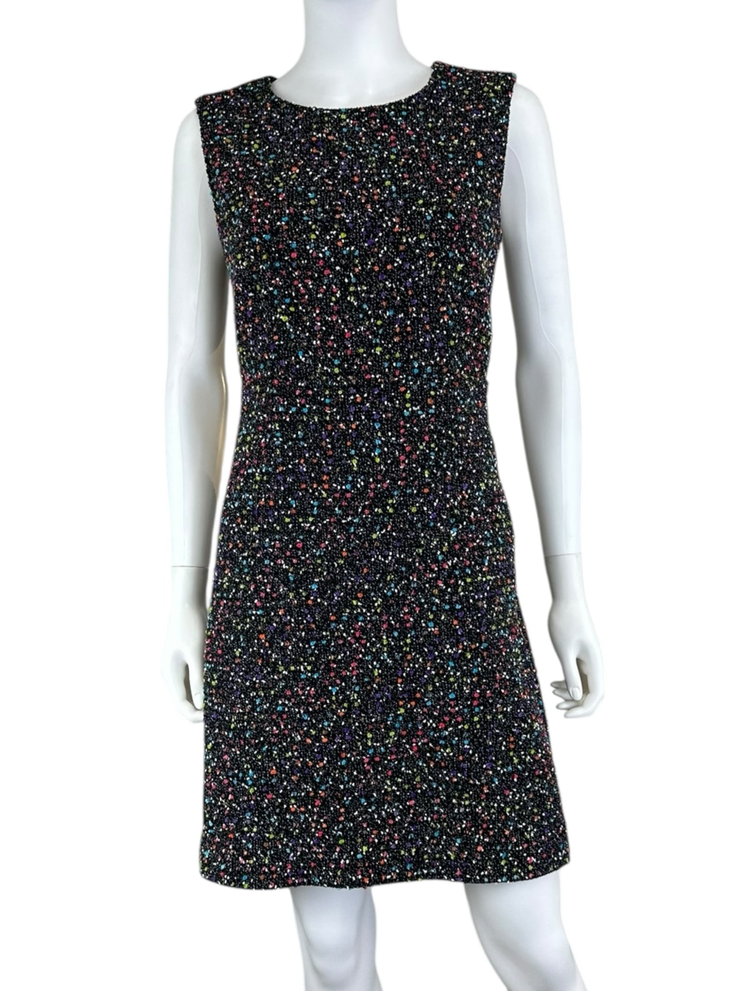 Diane Von Furstenberg black with multicolor rainbow confetti tweed texture knee length sleeveless dress featuring a high neckline and an exposed back zipper closure.