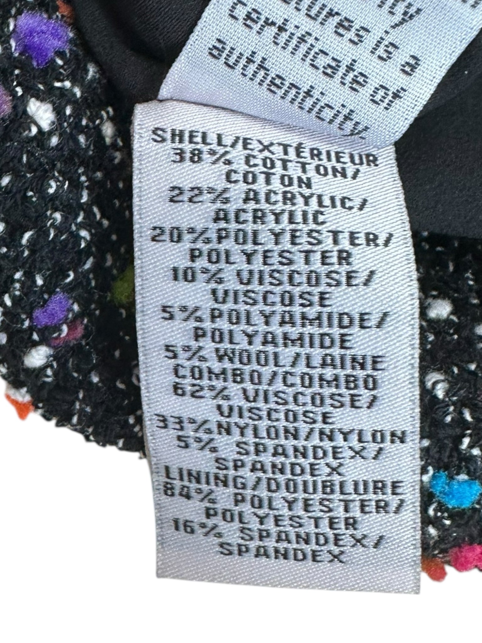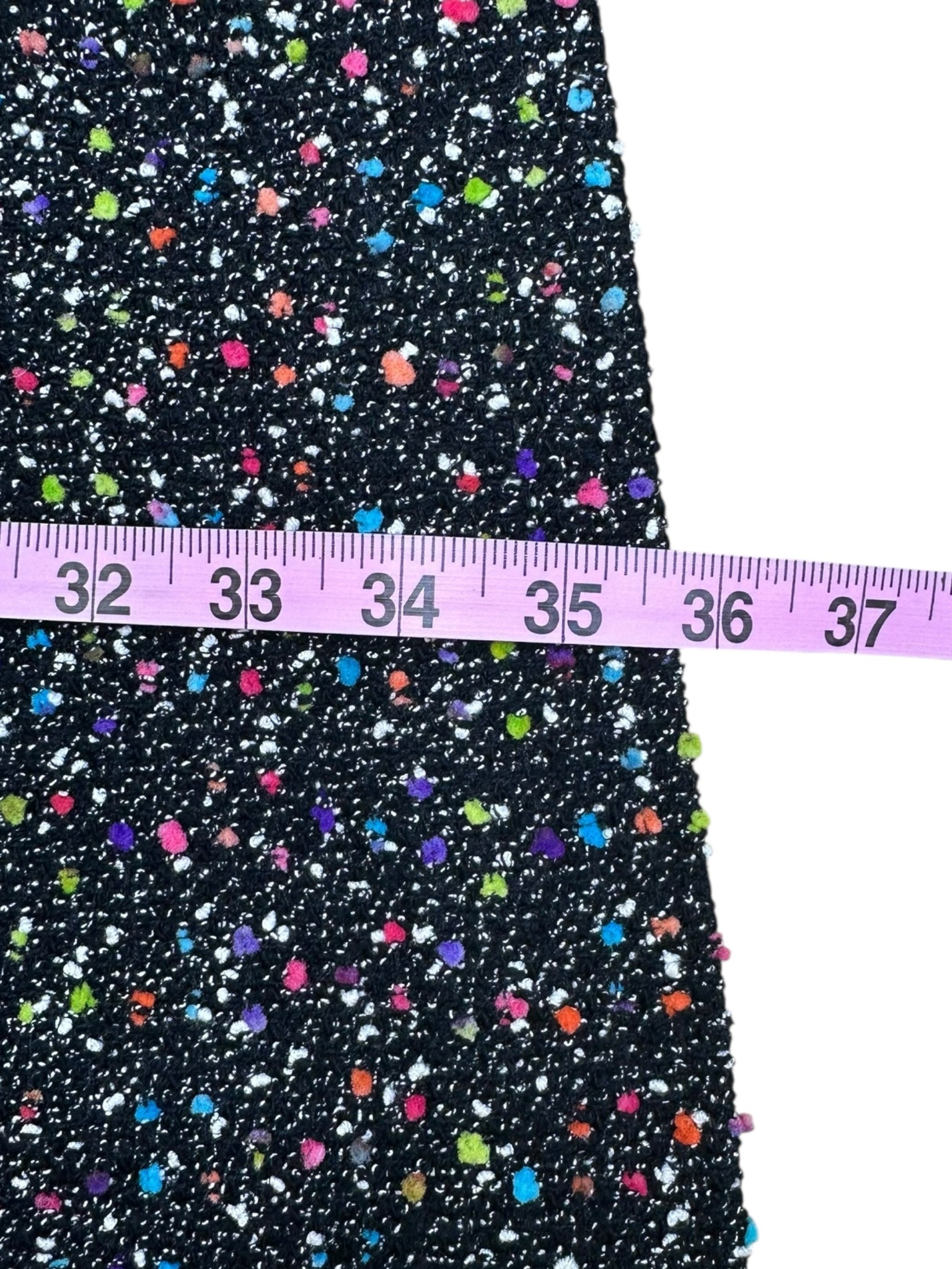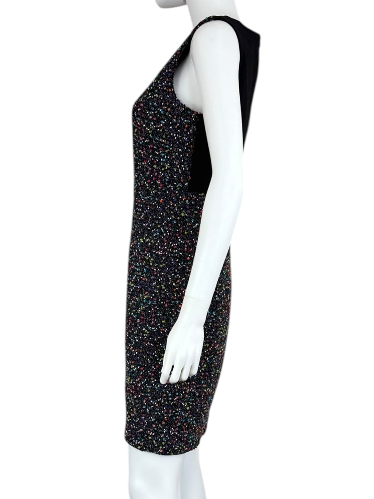 Diane Von Furstenberg black with multicolor rainbow confetti tweed texture knee length sleeveless dress featuring a high neckline and an exposed back zipper closure.