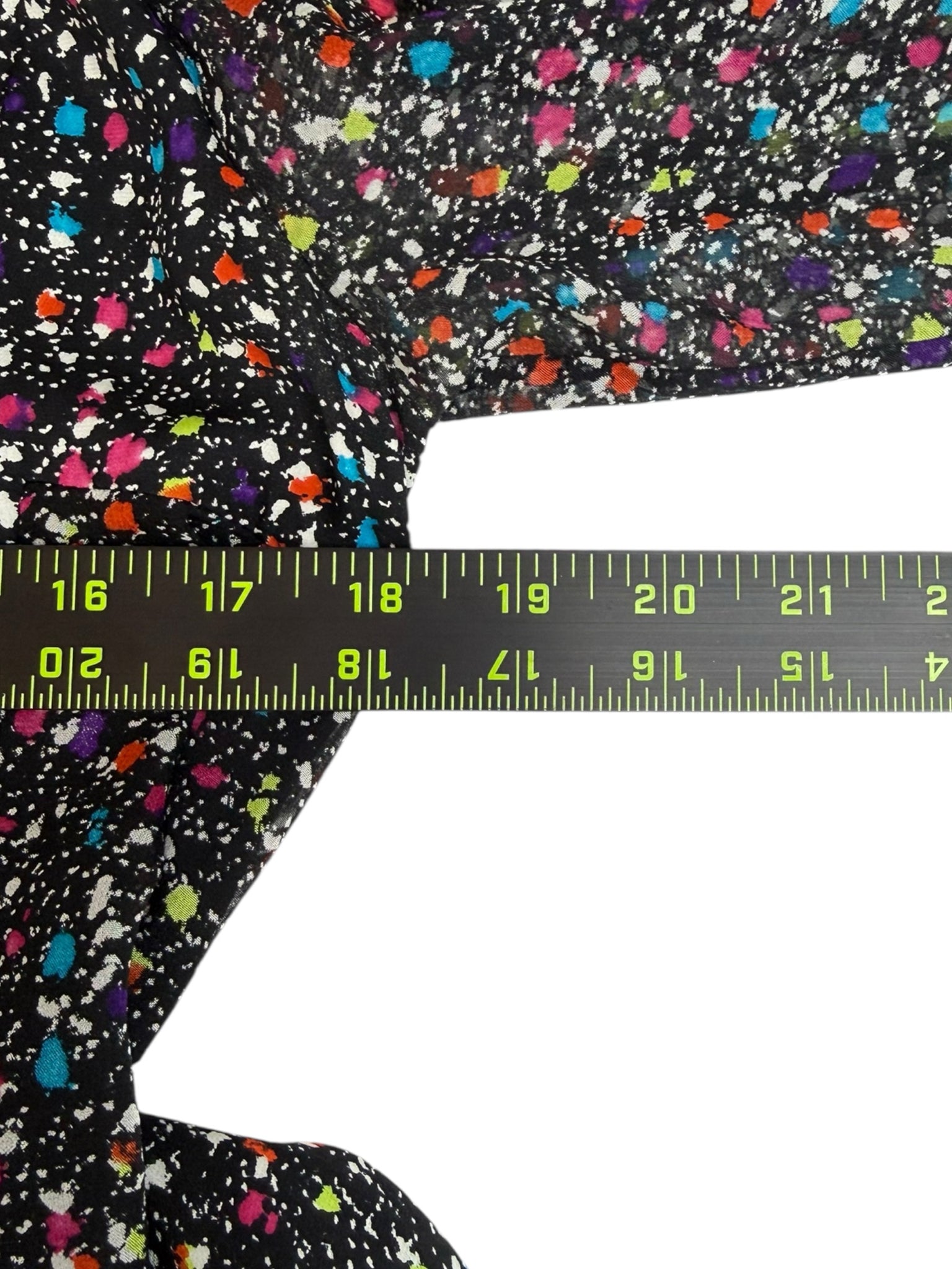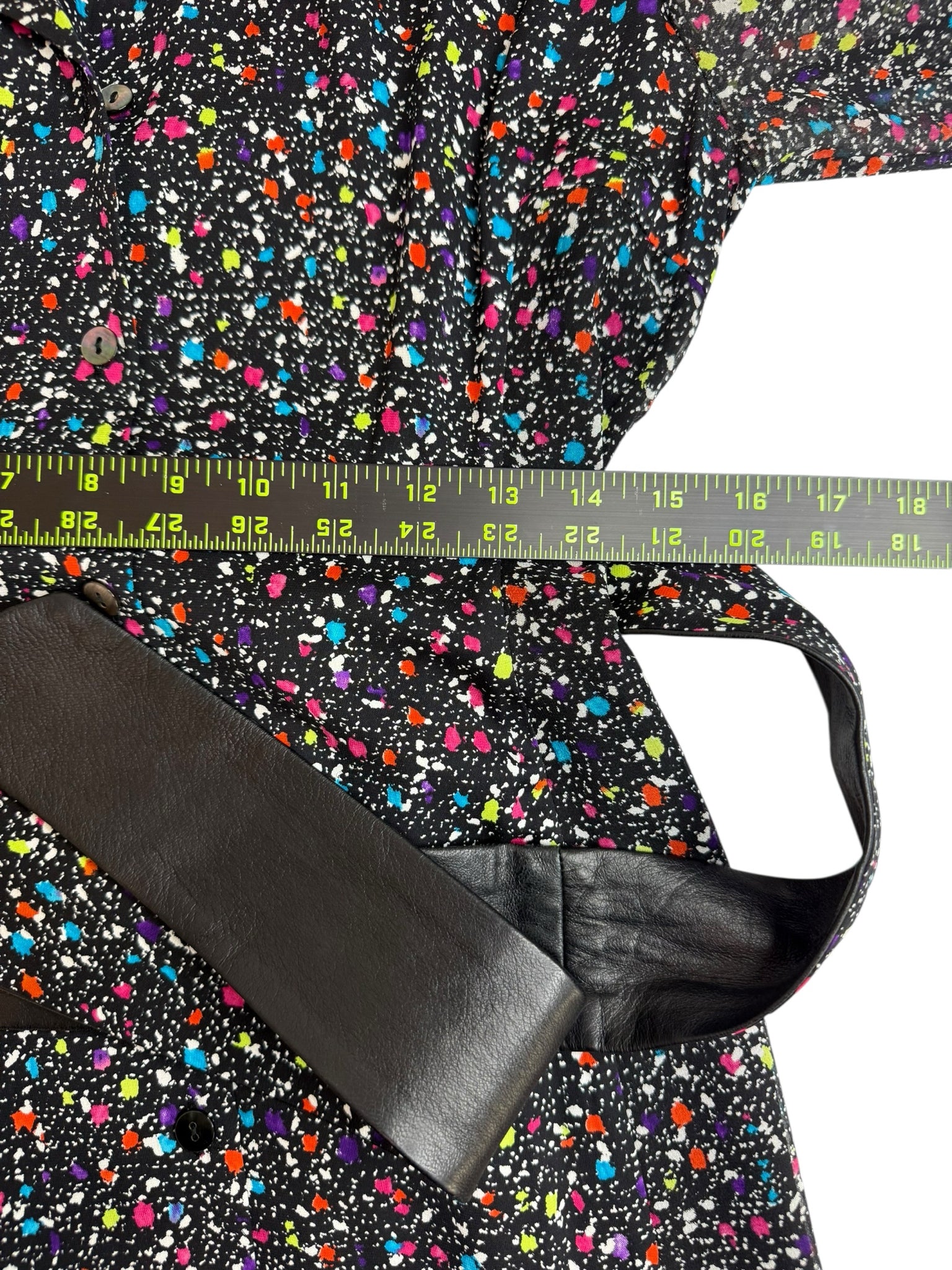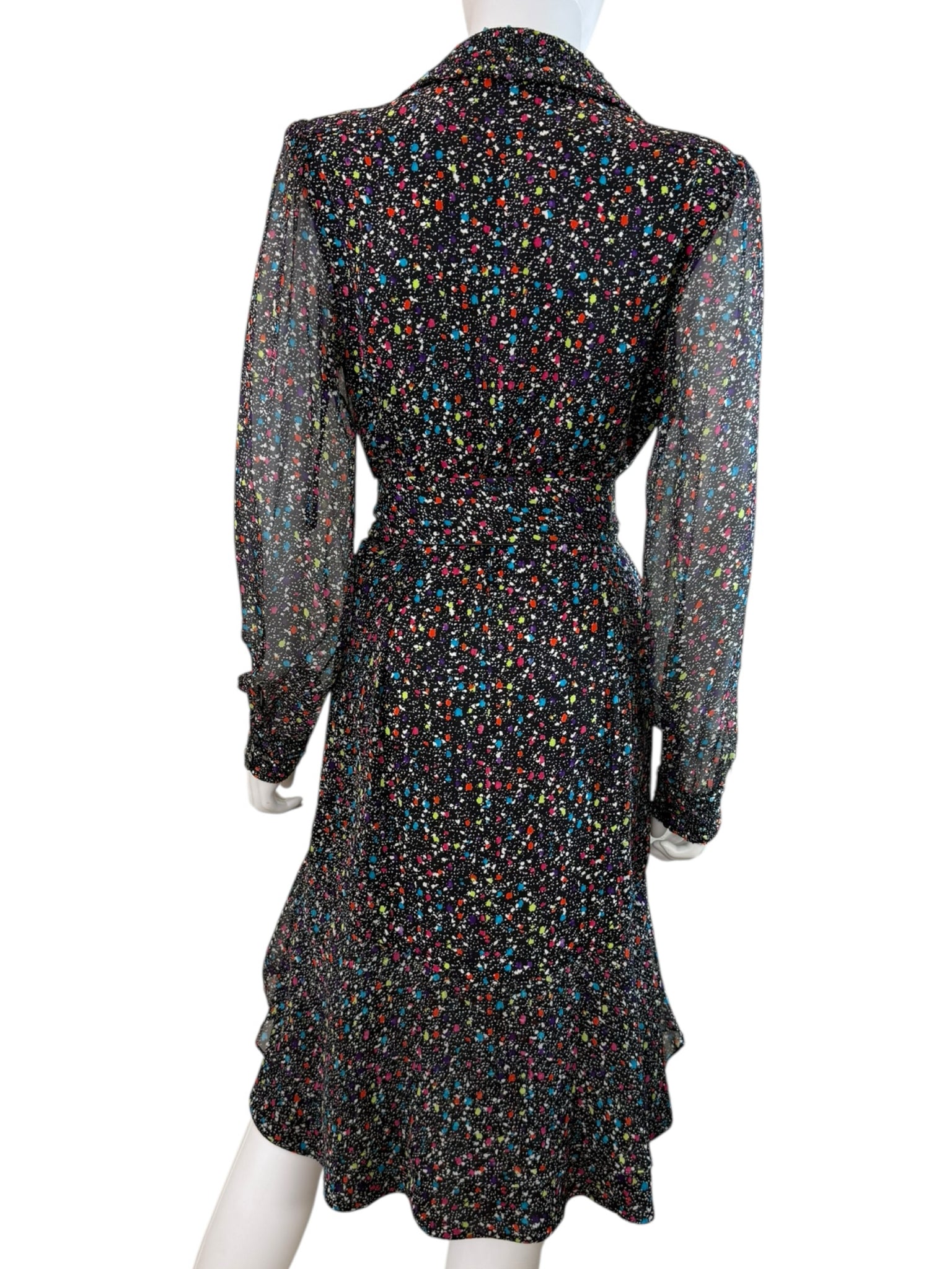 Black with multi-colored splatter print long sleeve midi.