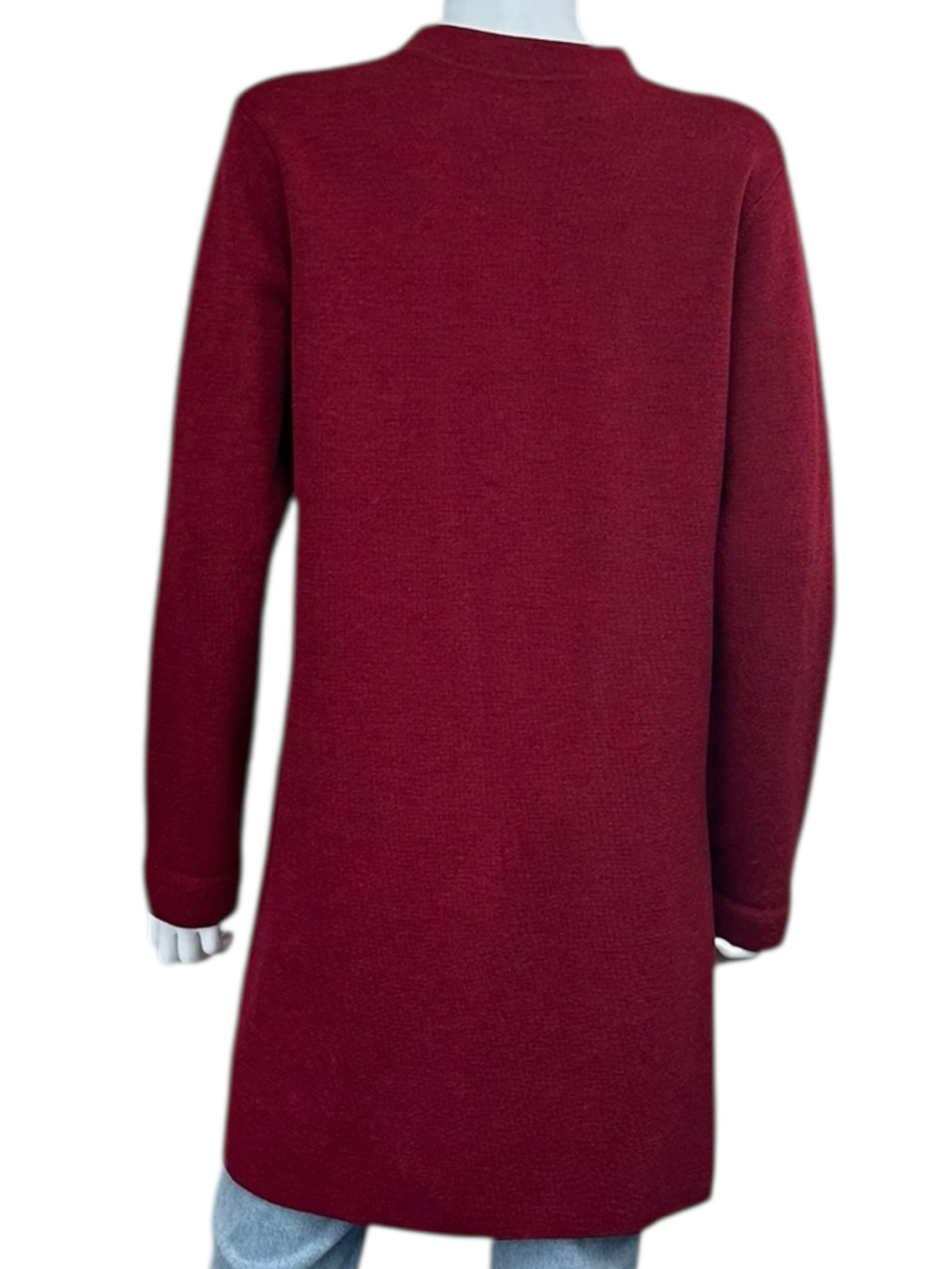 100% wool dark red sweater knit duster cardigan with long sleeves, front pockets and an open front.