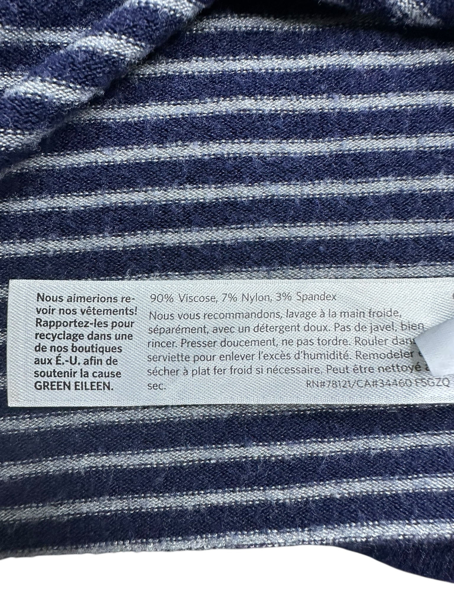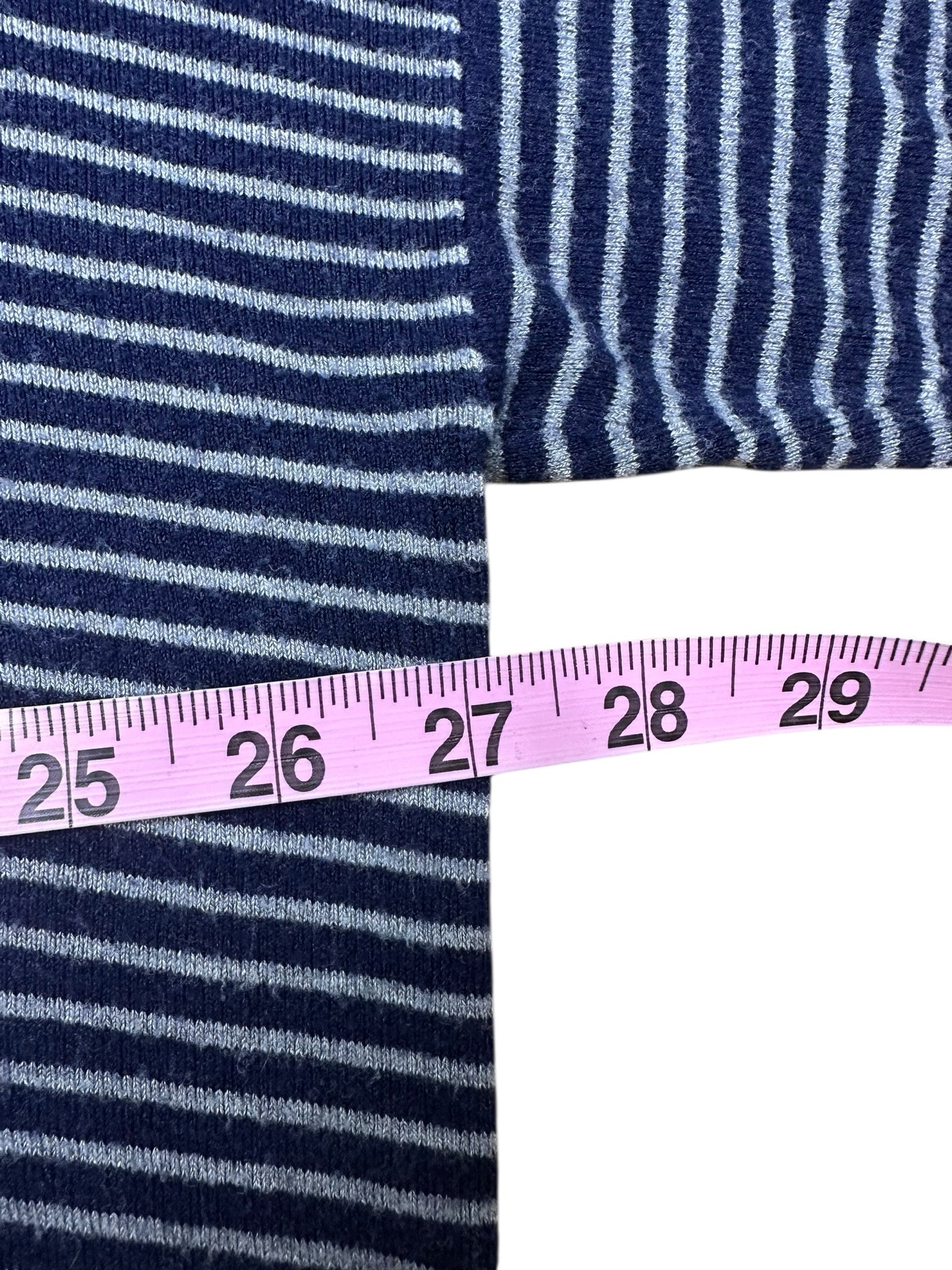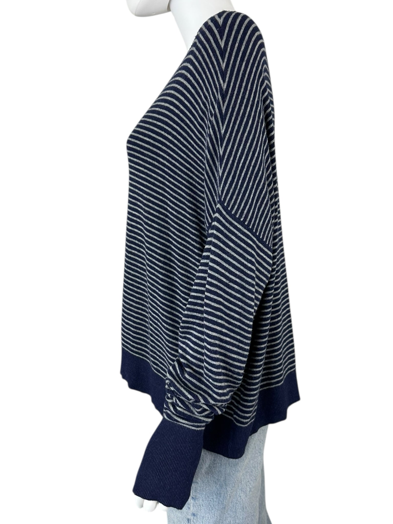 Super soft and comfy navy blue and gray striped oversized sweater with long sleeves.