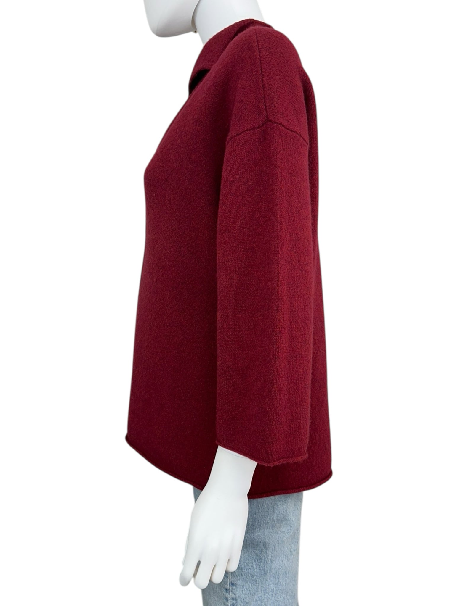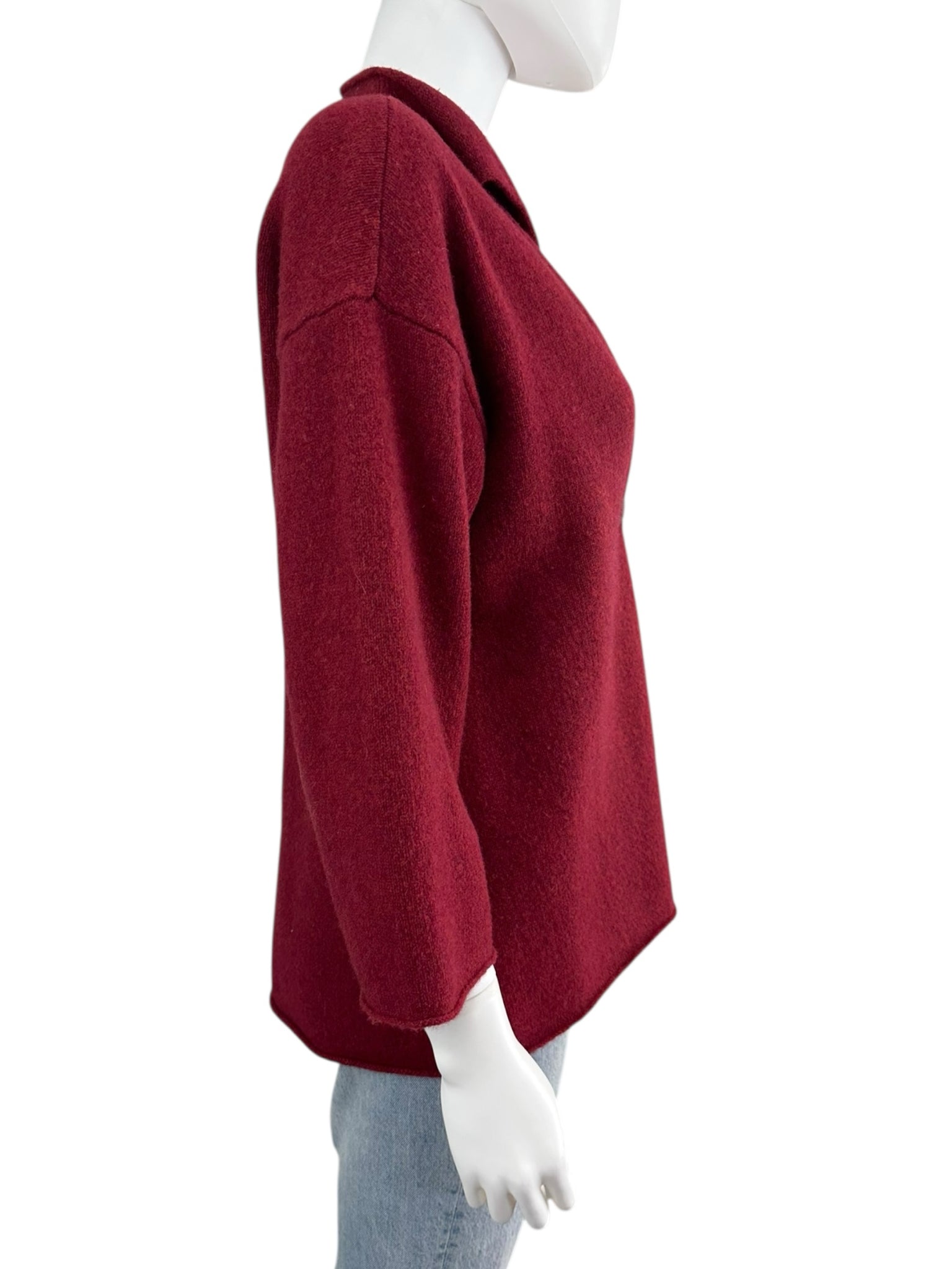 Dark red collared long sleeve with one red front button closure and high low hem line. Fold over neckline.