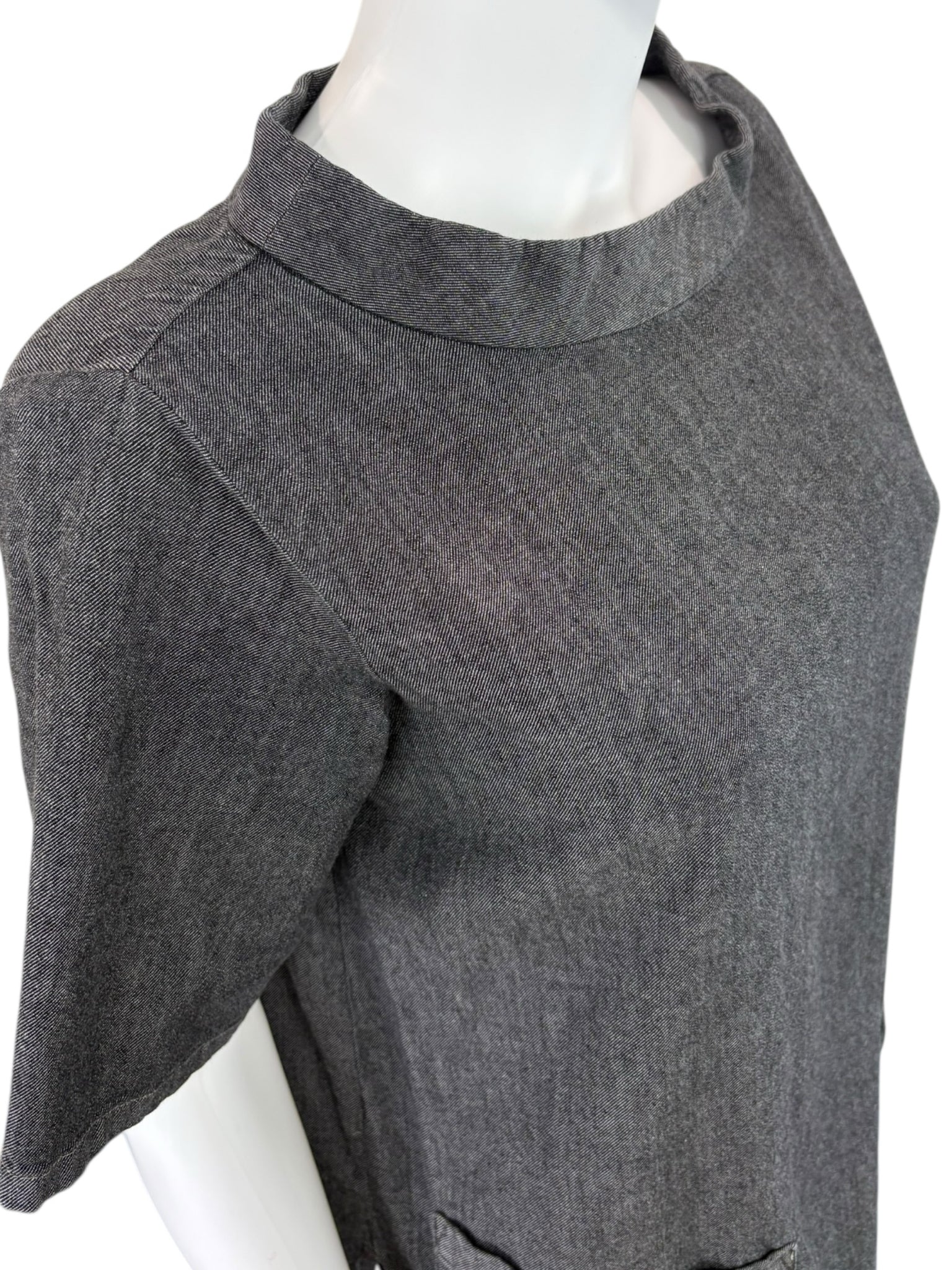 Dark grey organic cotton short sleeve blouse with two front pockets.