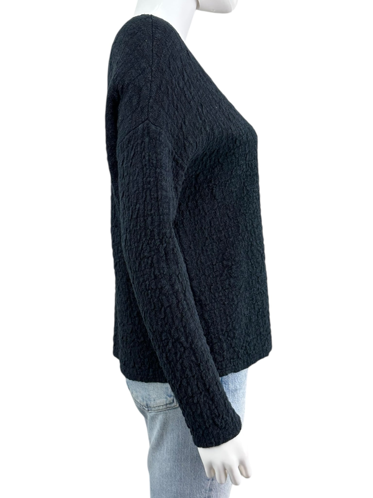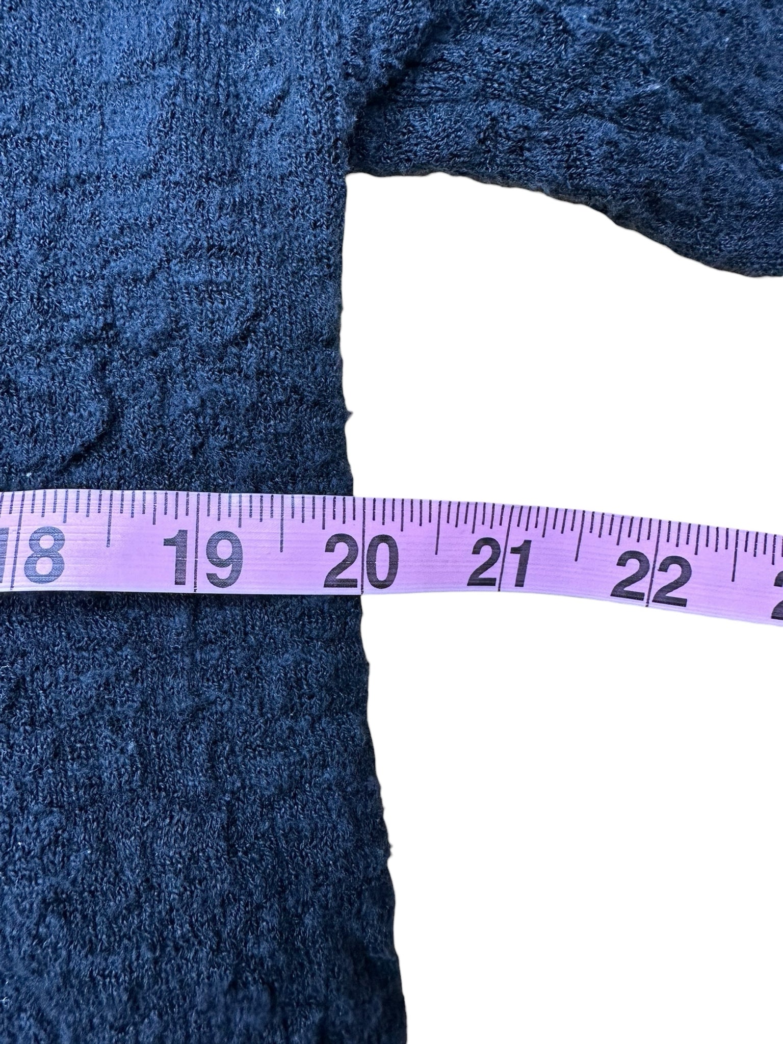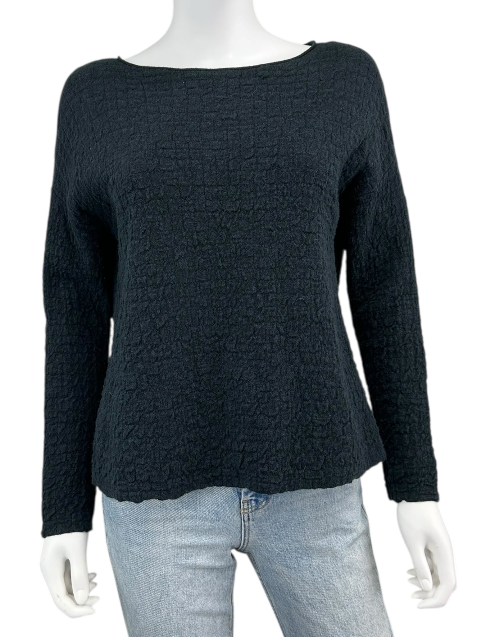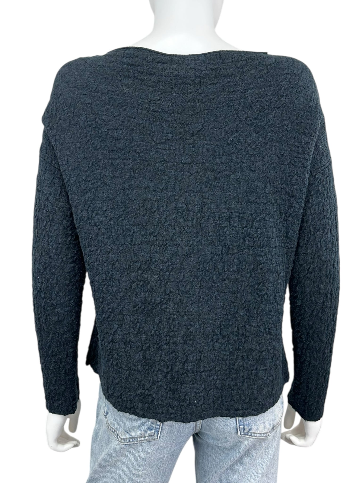Navy blue textured organic linen/cotton blend pullover knit top with a wide neckline and long sleeves.
