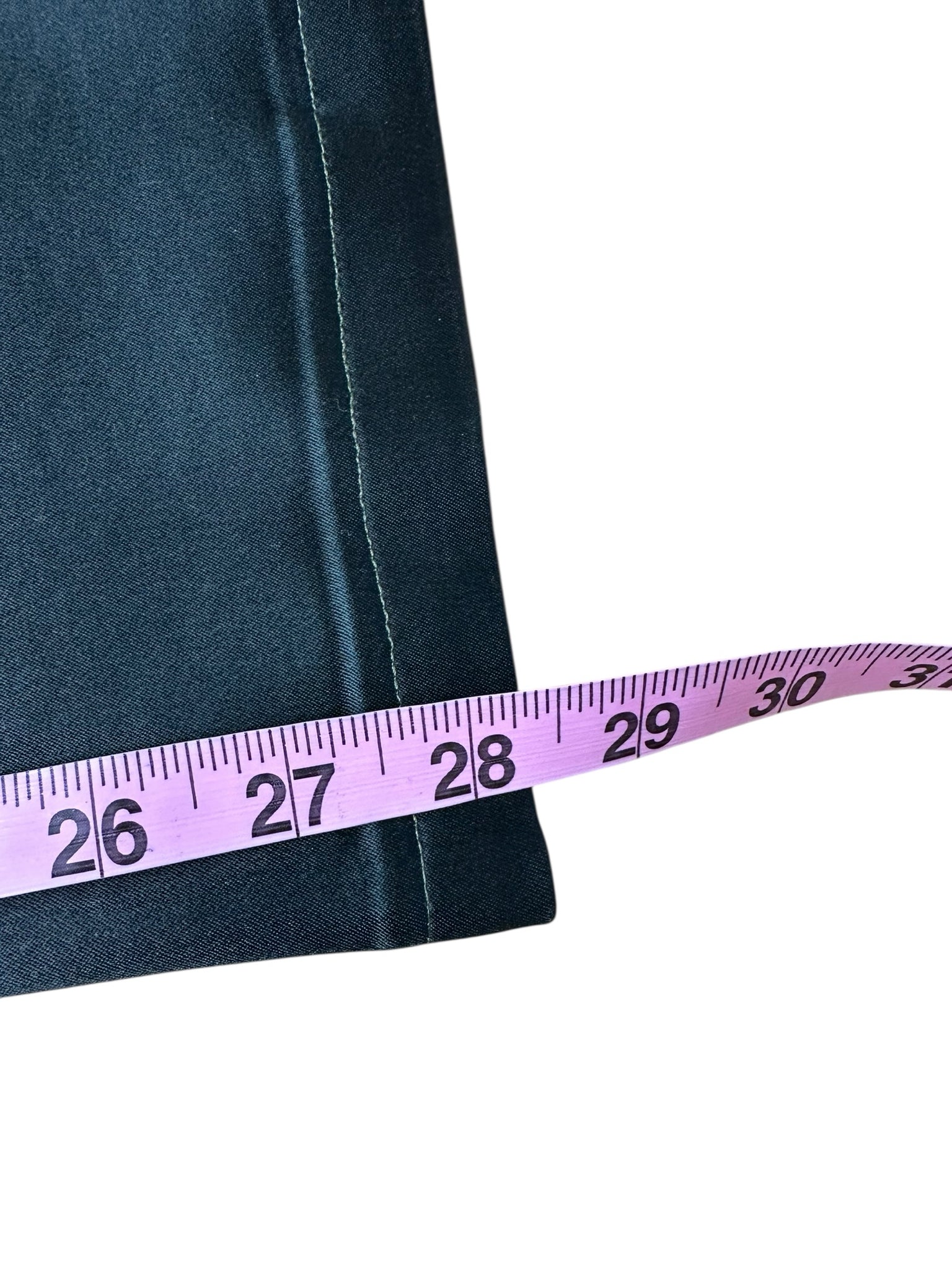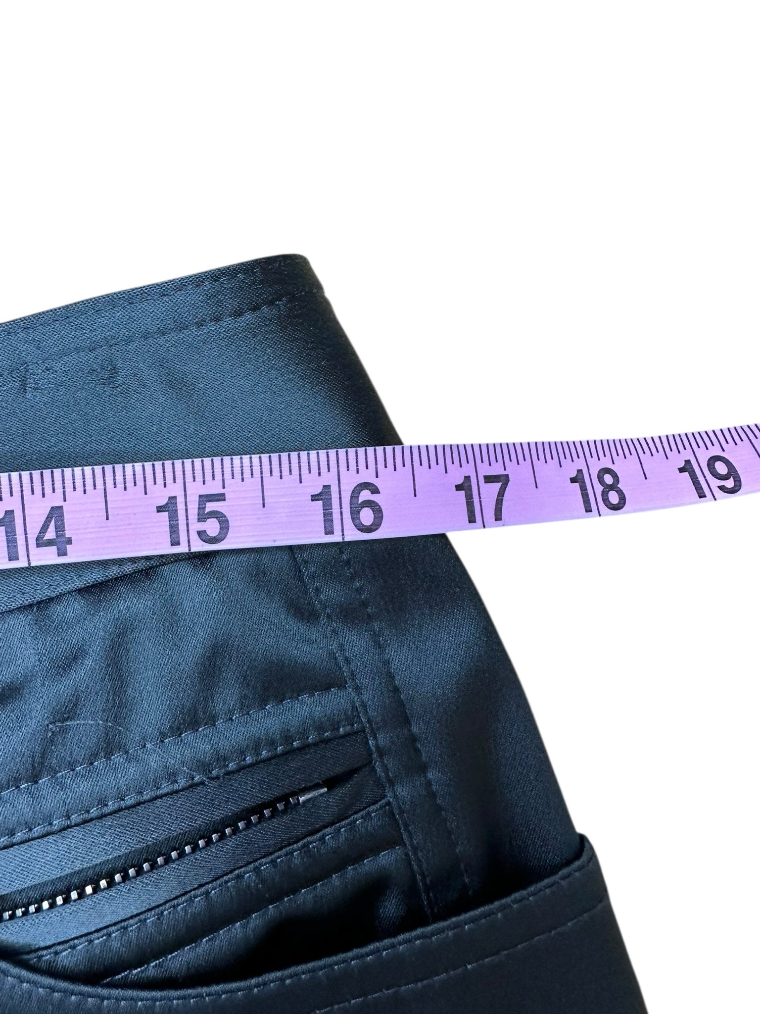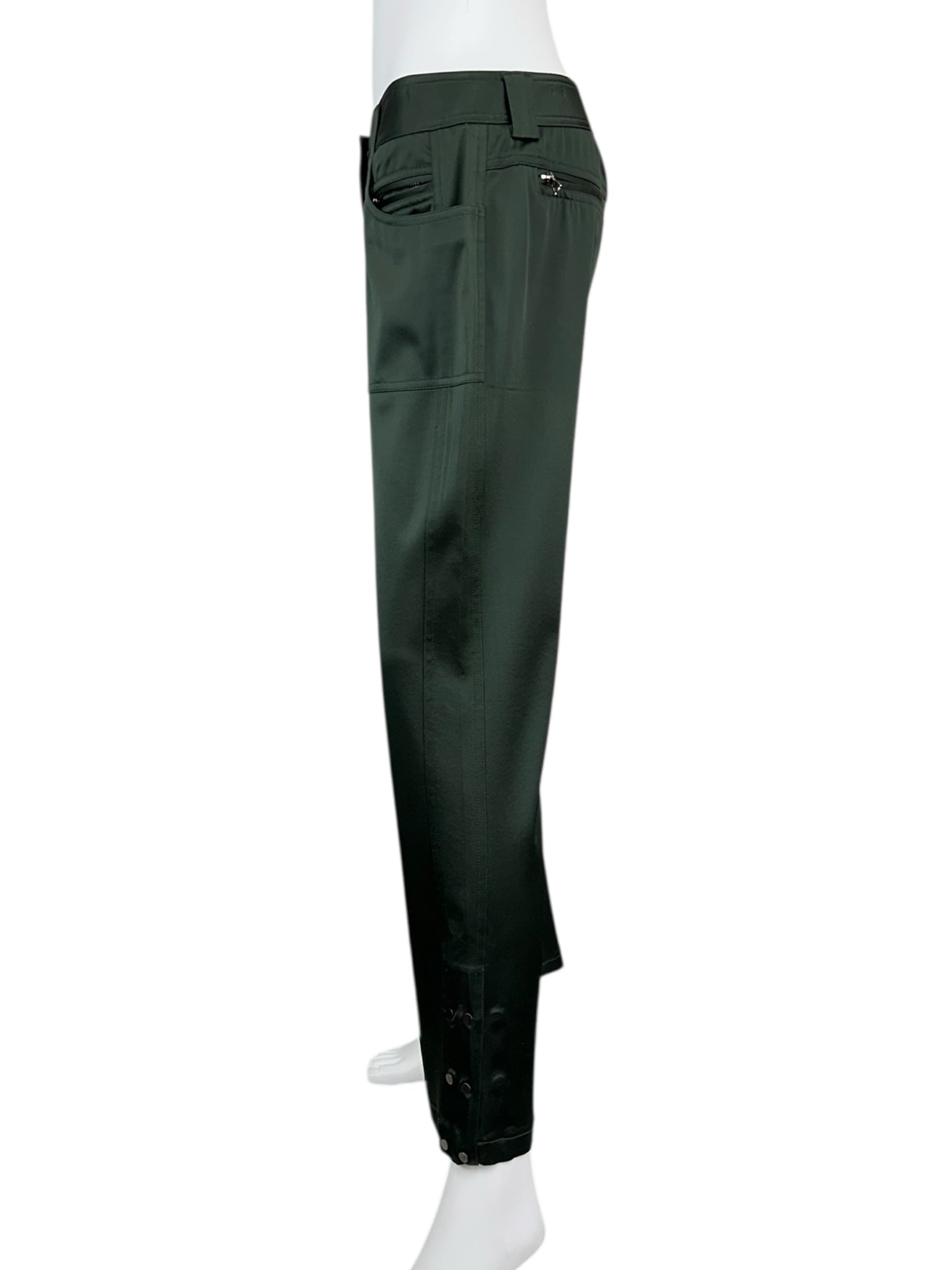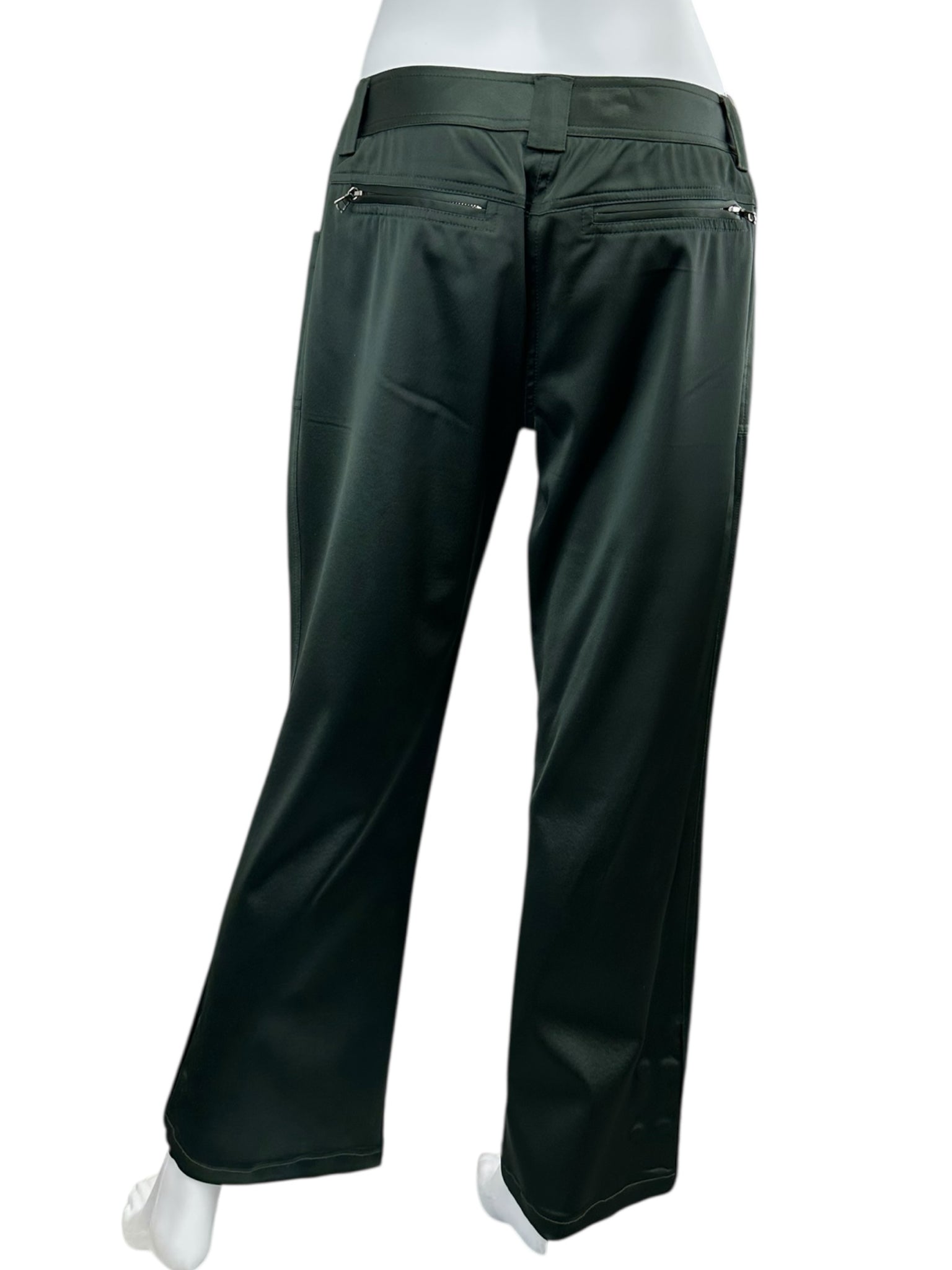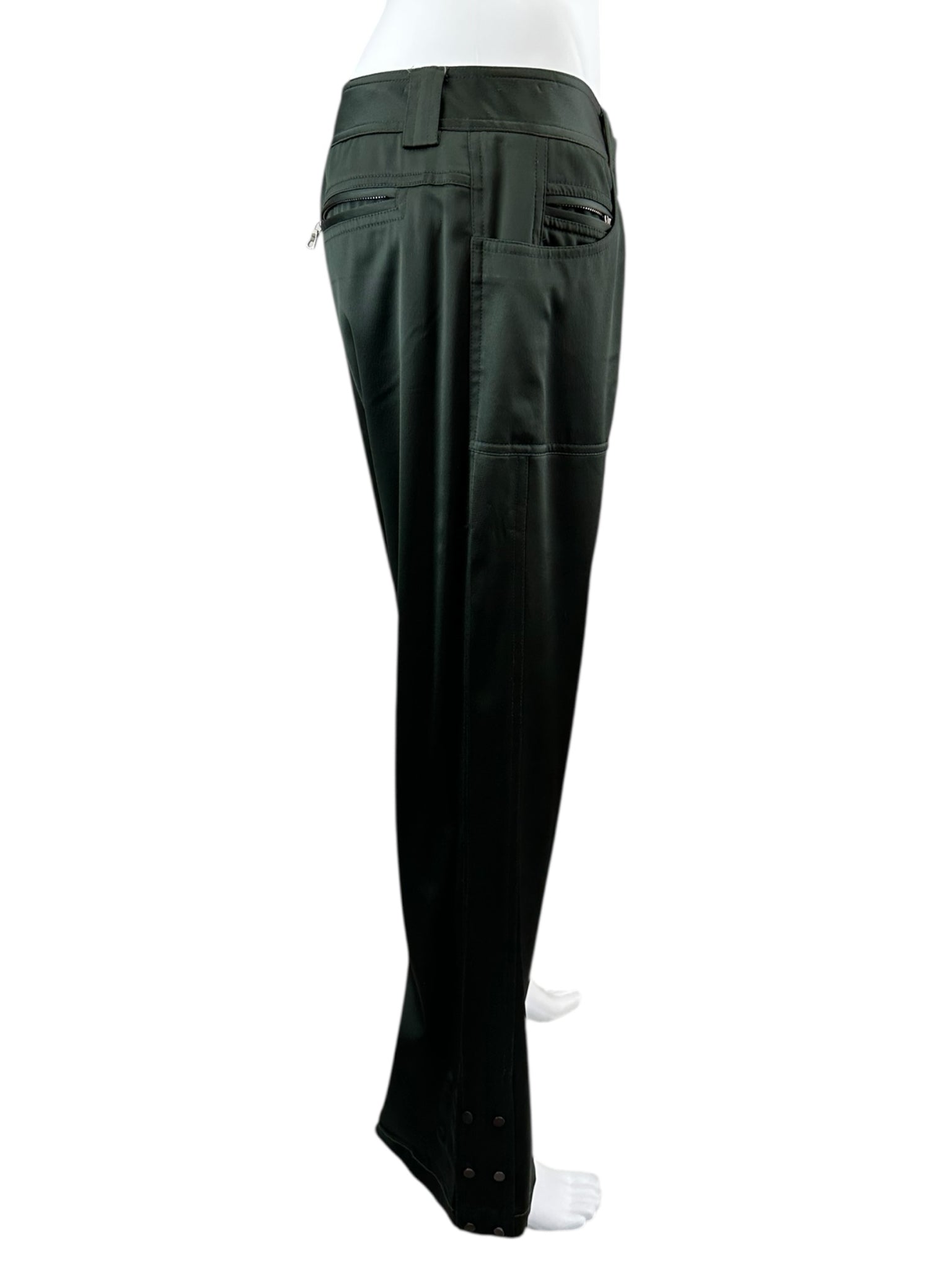 These tailored black silky pants feature a sleek, straight-leg silhouette with subtle silver utilitarian details like zippered front pockets and patch pockets at the thighs, and belt loops at the waist. Finished with a smooth, structured fabric and ankle