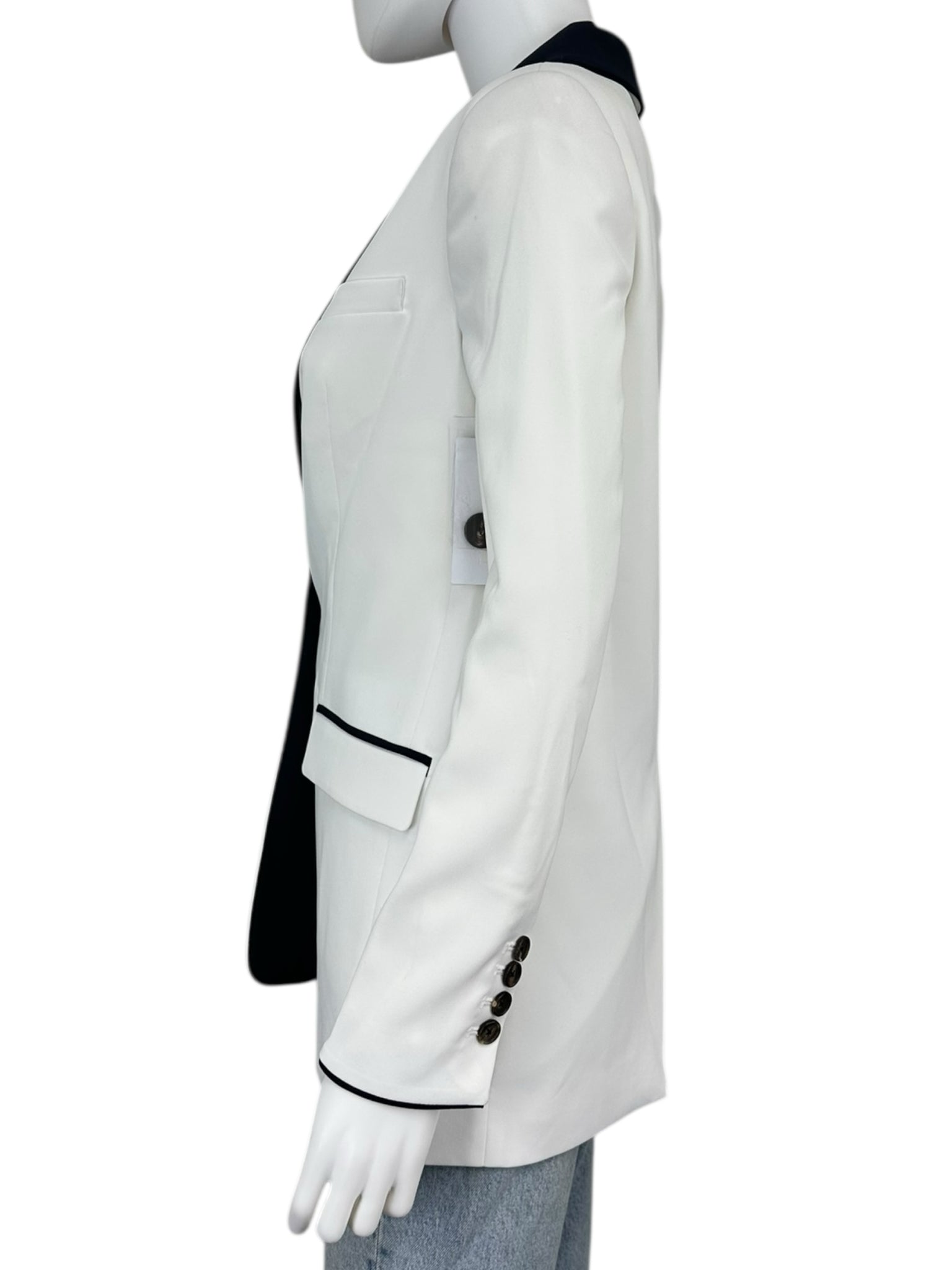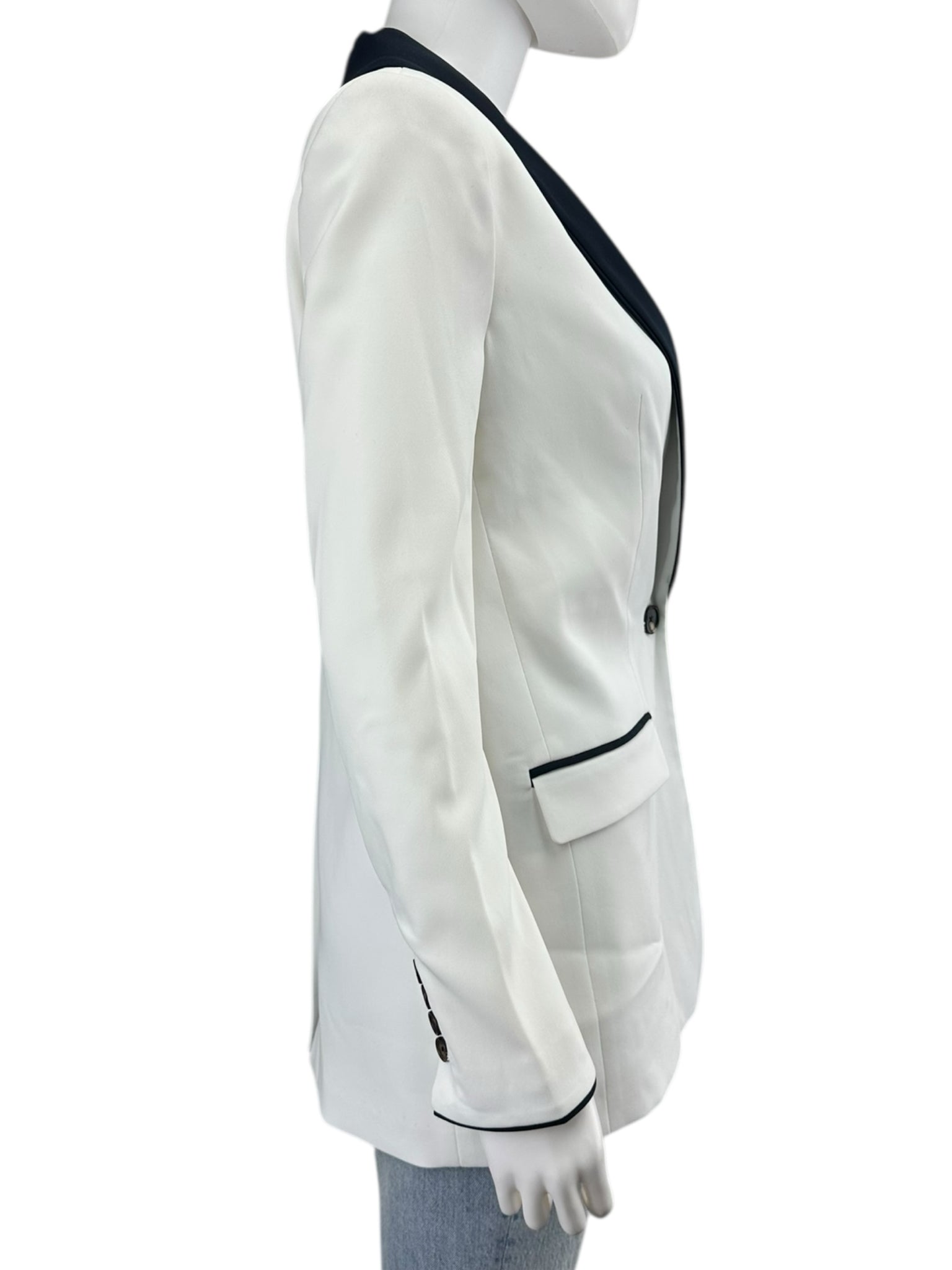 New with tags! White and black tuxedo style blazer with long button cuff sleeves, front pockets and a single front button closure.