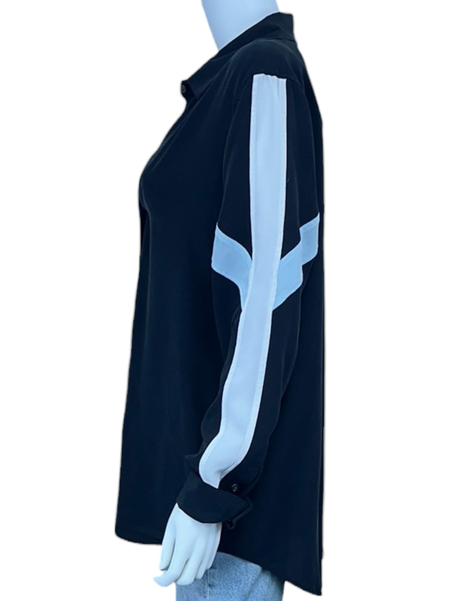 100% silk black collared long sleeve button-down shirt with color block detailing.