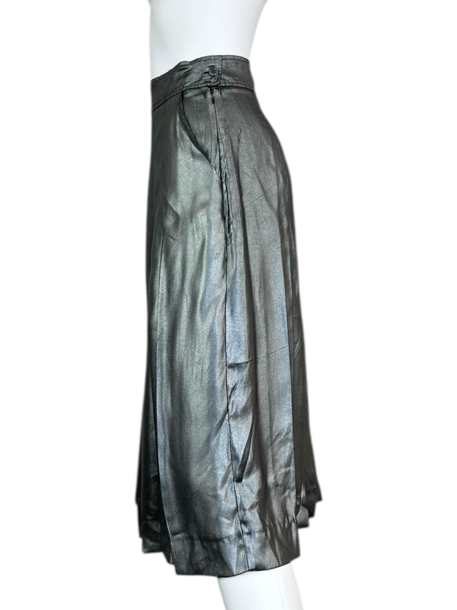 Soft metallic silver stretch knit pleated culottes with front pockets and a side zipper/hook closure.