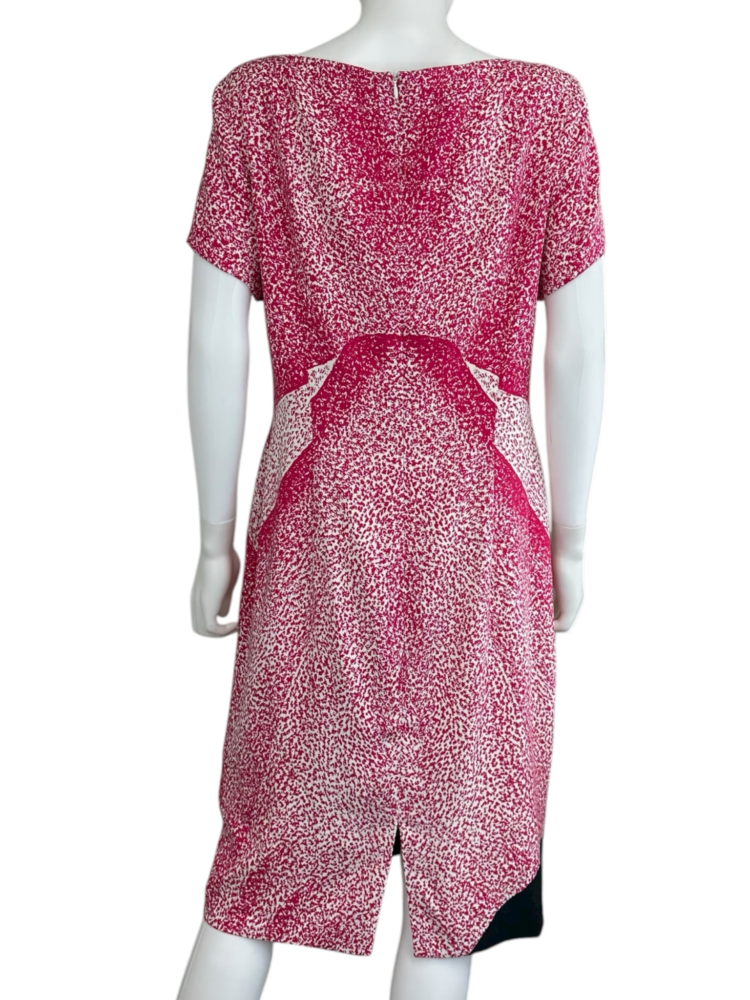 White with a bright pink & black abstract swirl print short sleeved midi dress with a back zipper closure.