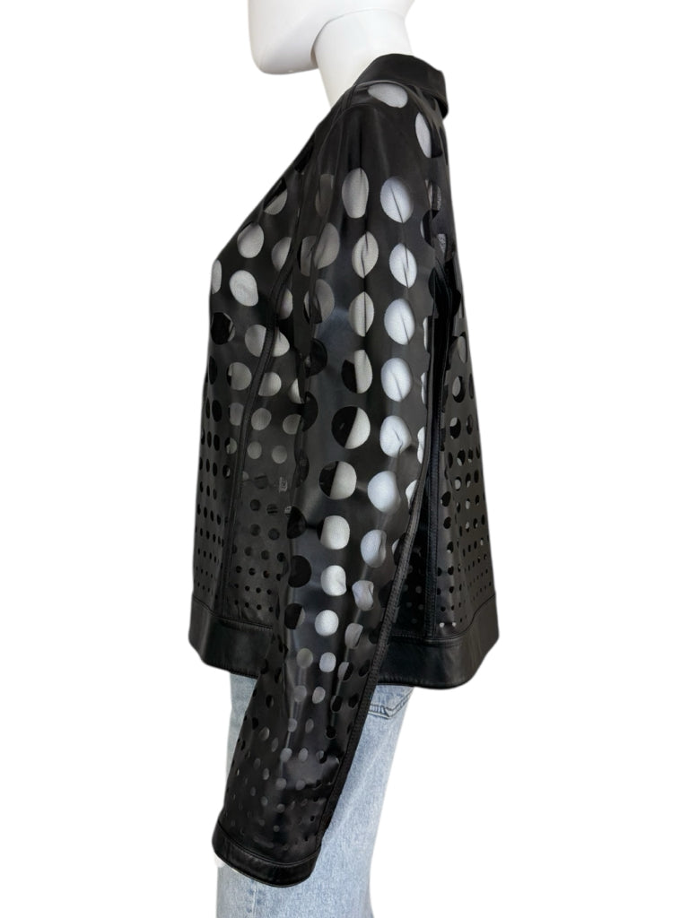 Lightweight black mesh and lamb leather polka dot pattern jacket with long sleeves and a front zipper closure.