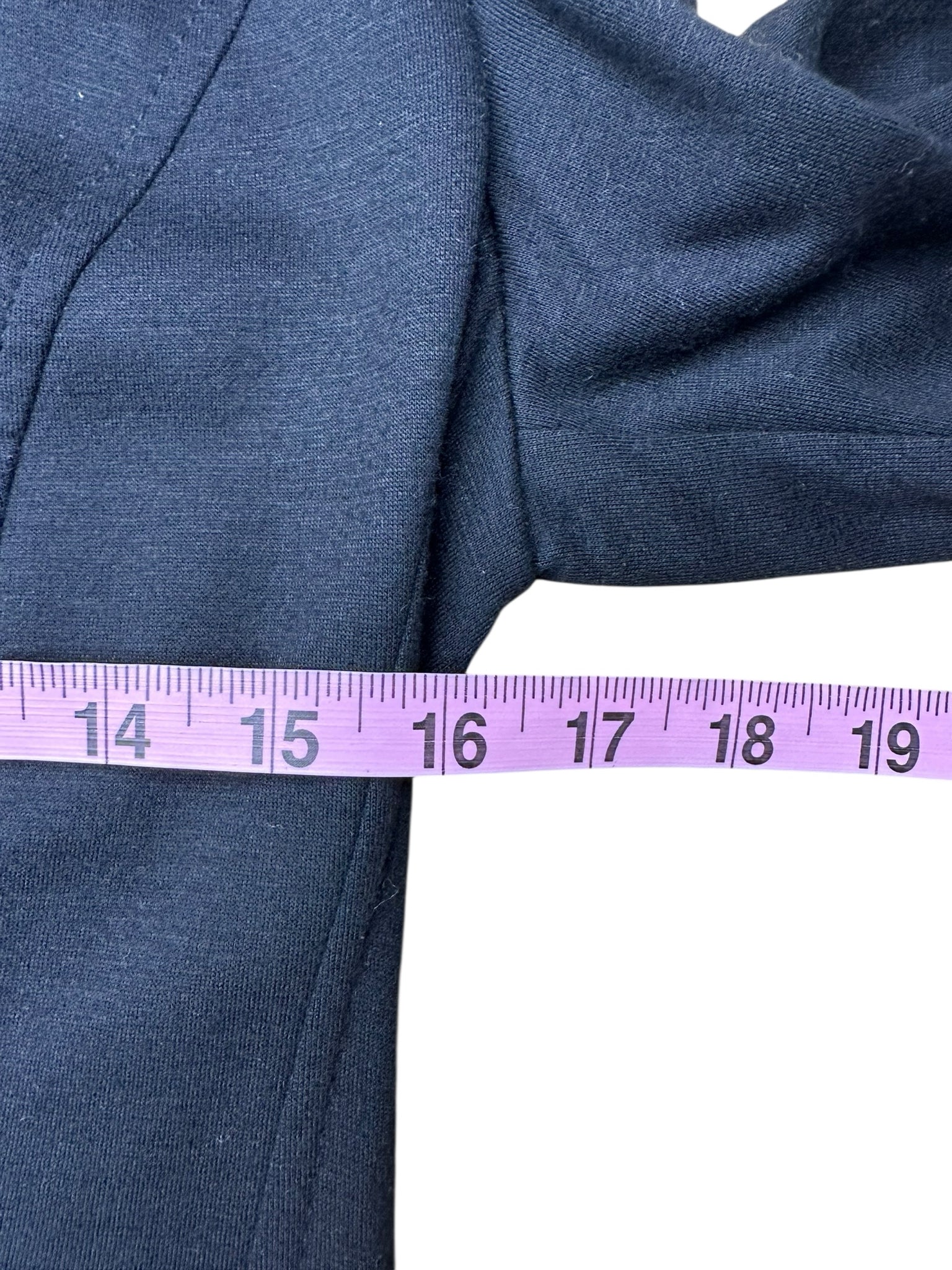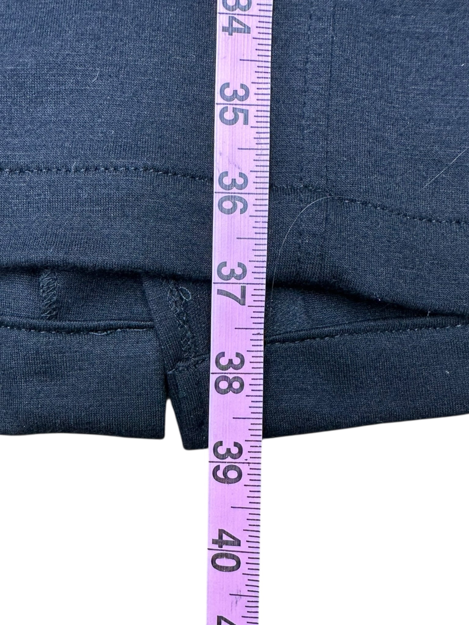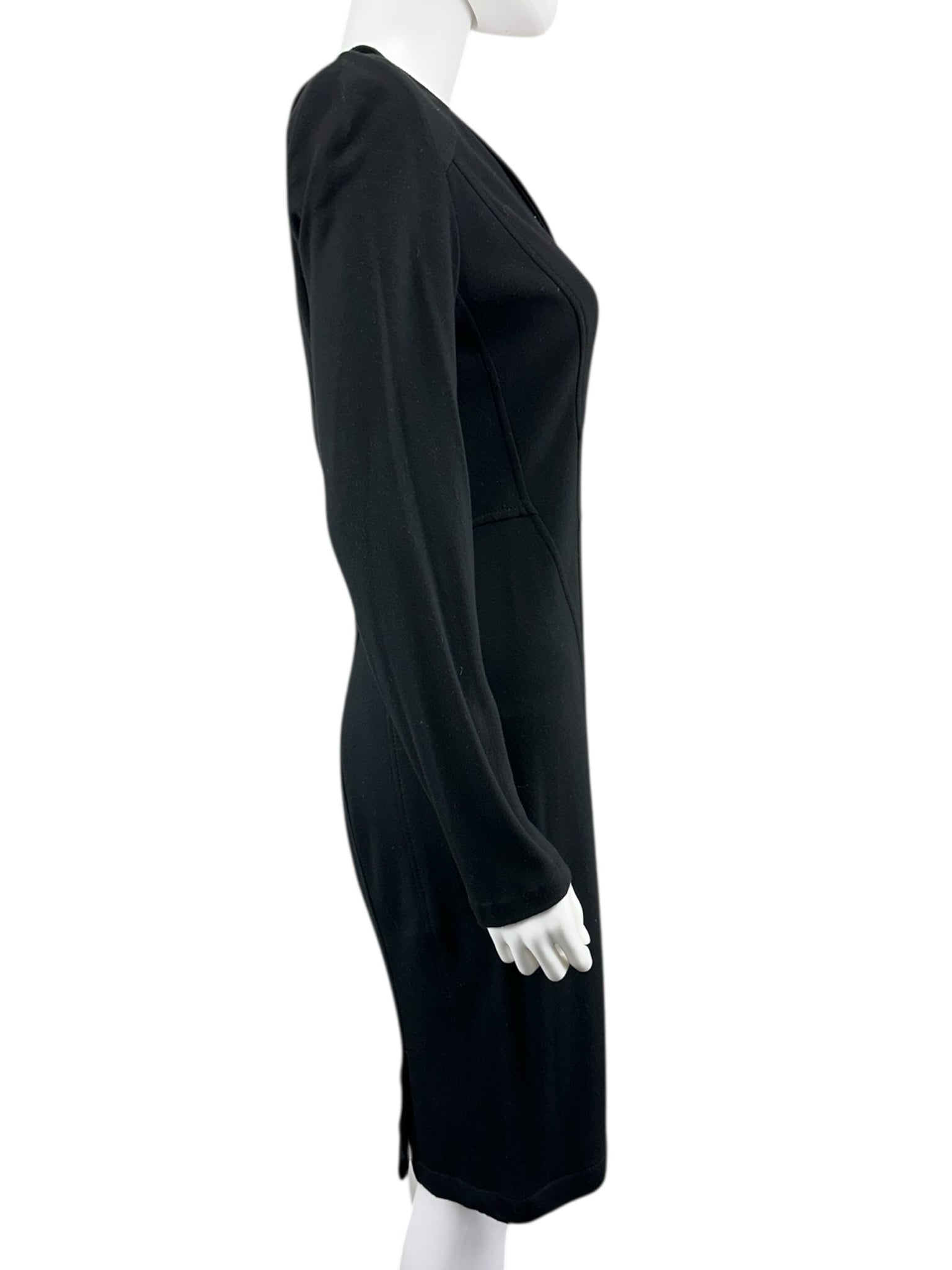 Soft black stretch knit midi dress with long sleeves and a back zipper closure.
