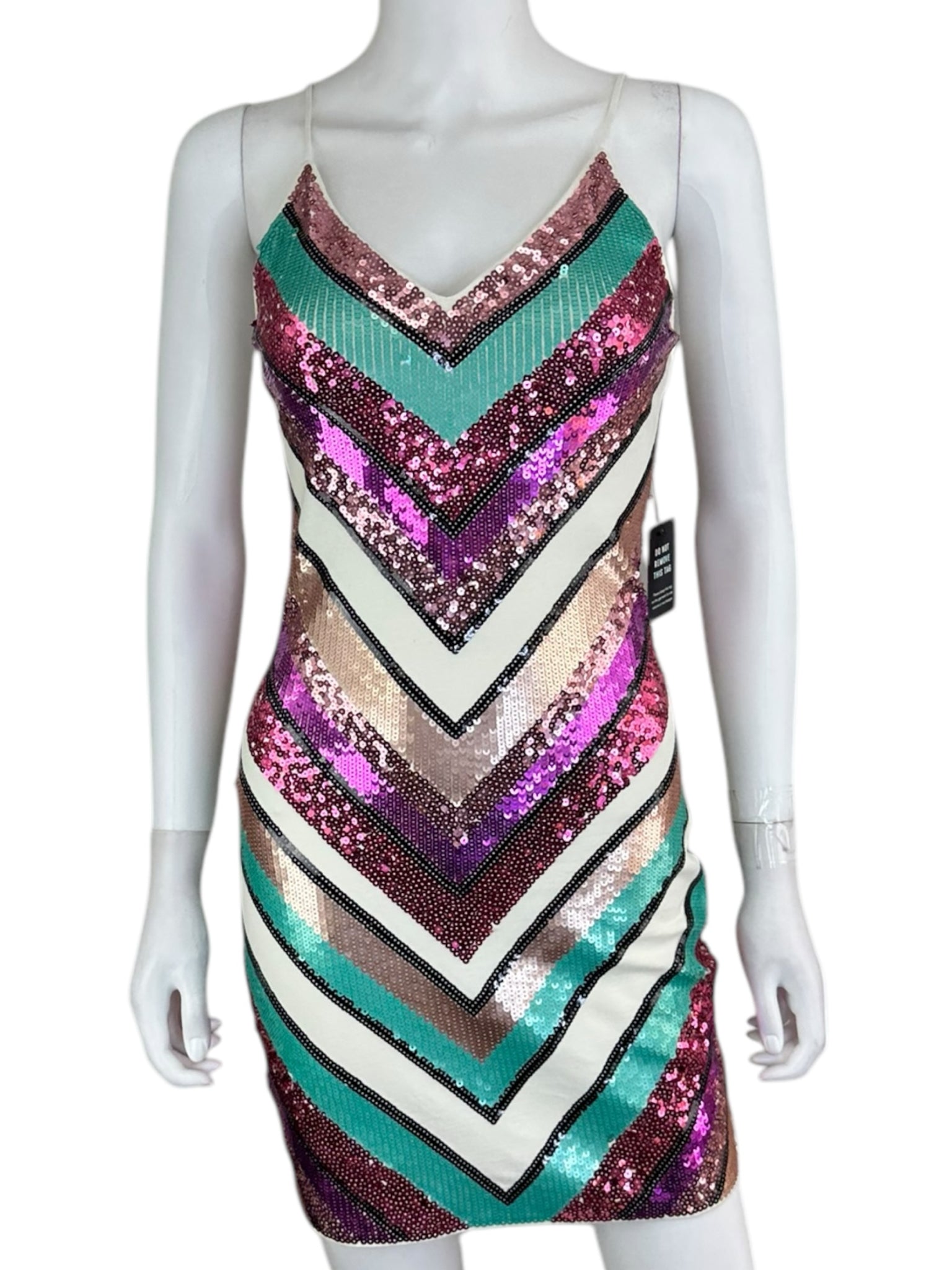 NWT multi-color chevron sequin pattern mini dress with adjustable spaghetti straps. Dress is made from a double lined comfy stretched knit fabric.