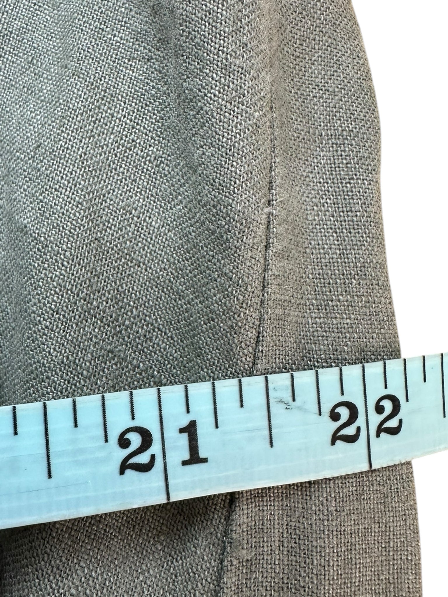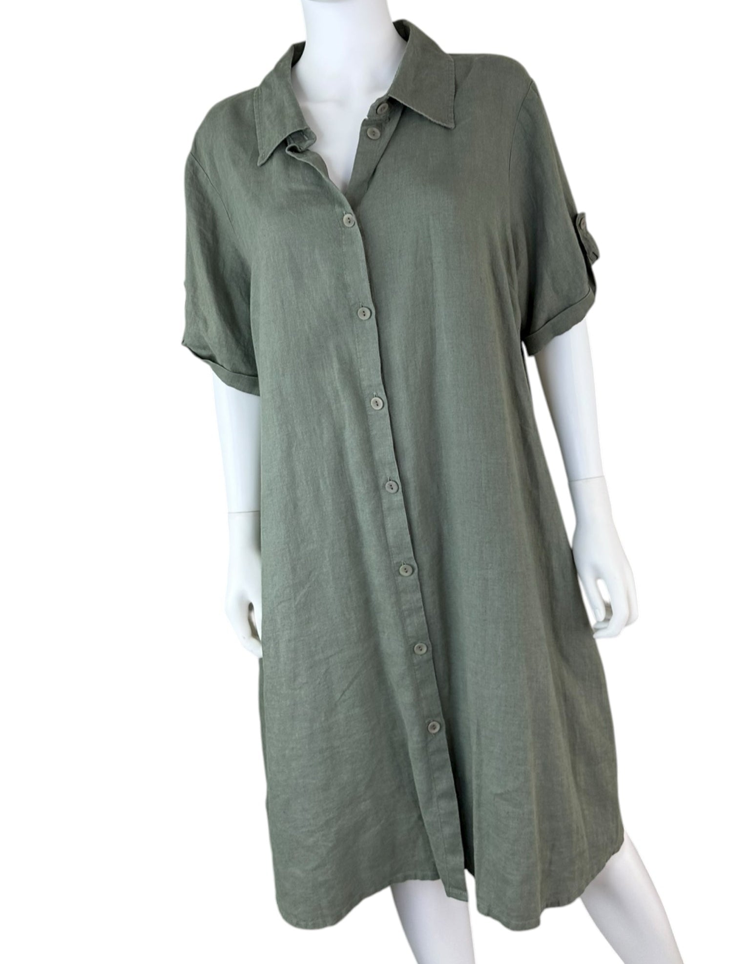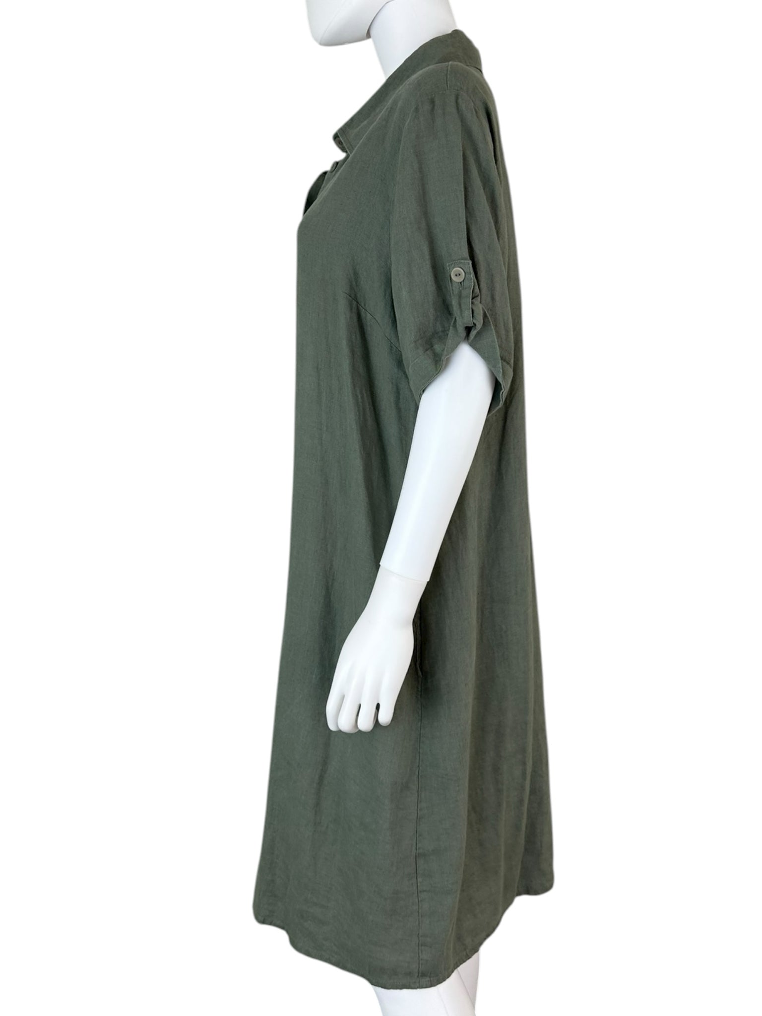 Dark olive green 100%linen collared midi dress with elbow length roll tab sleeves and a button front closure.