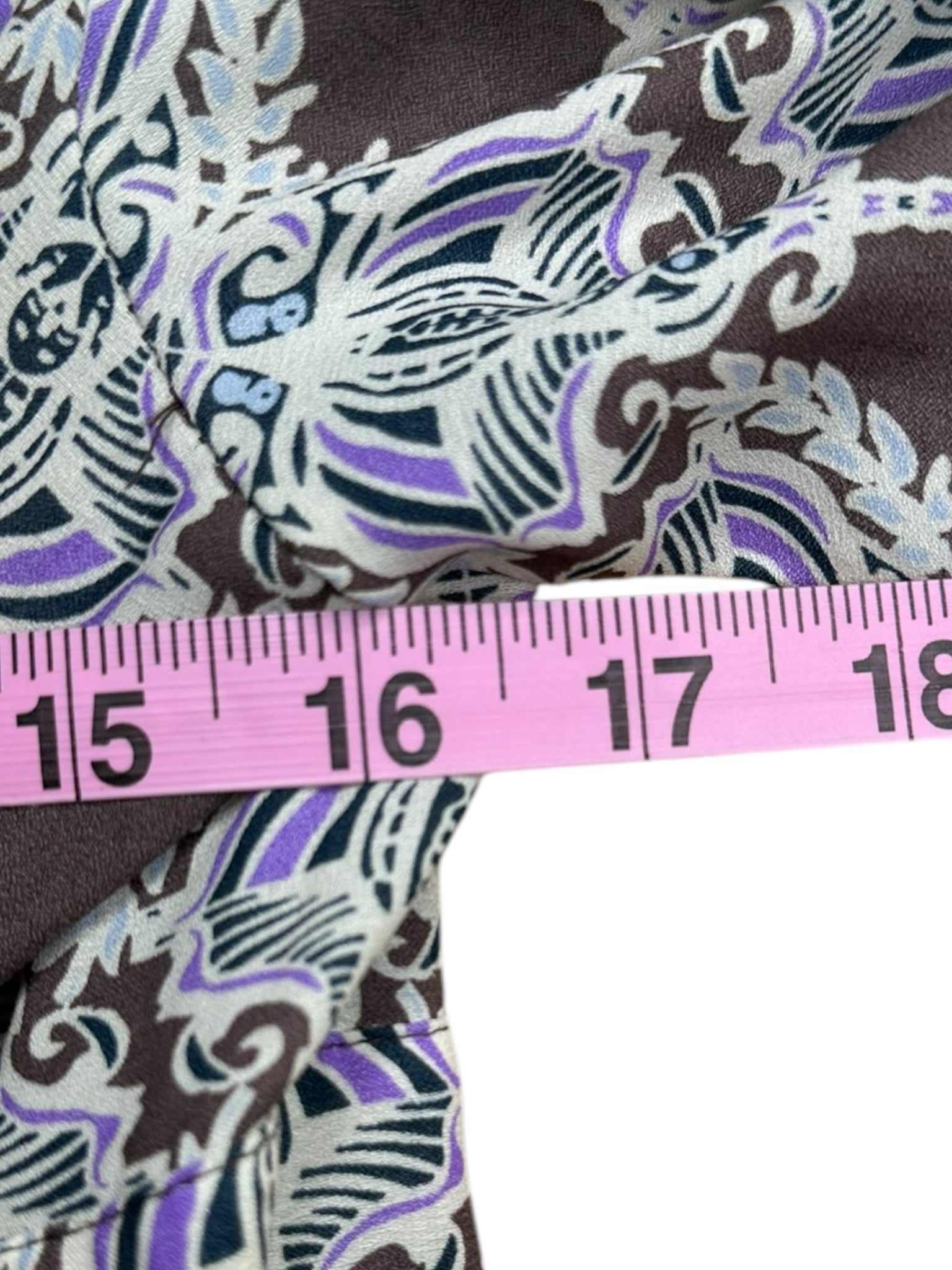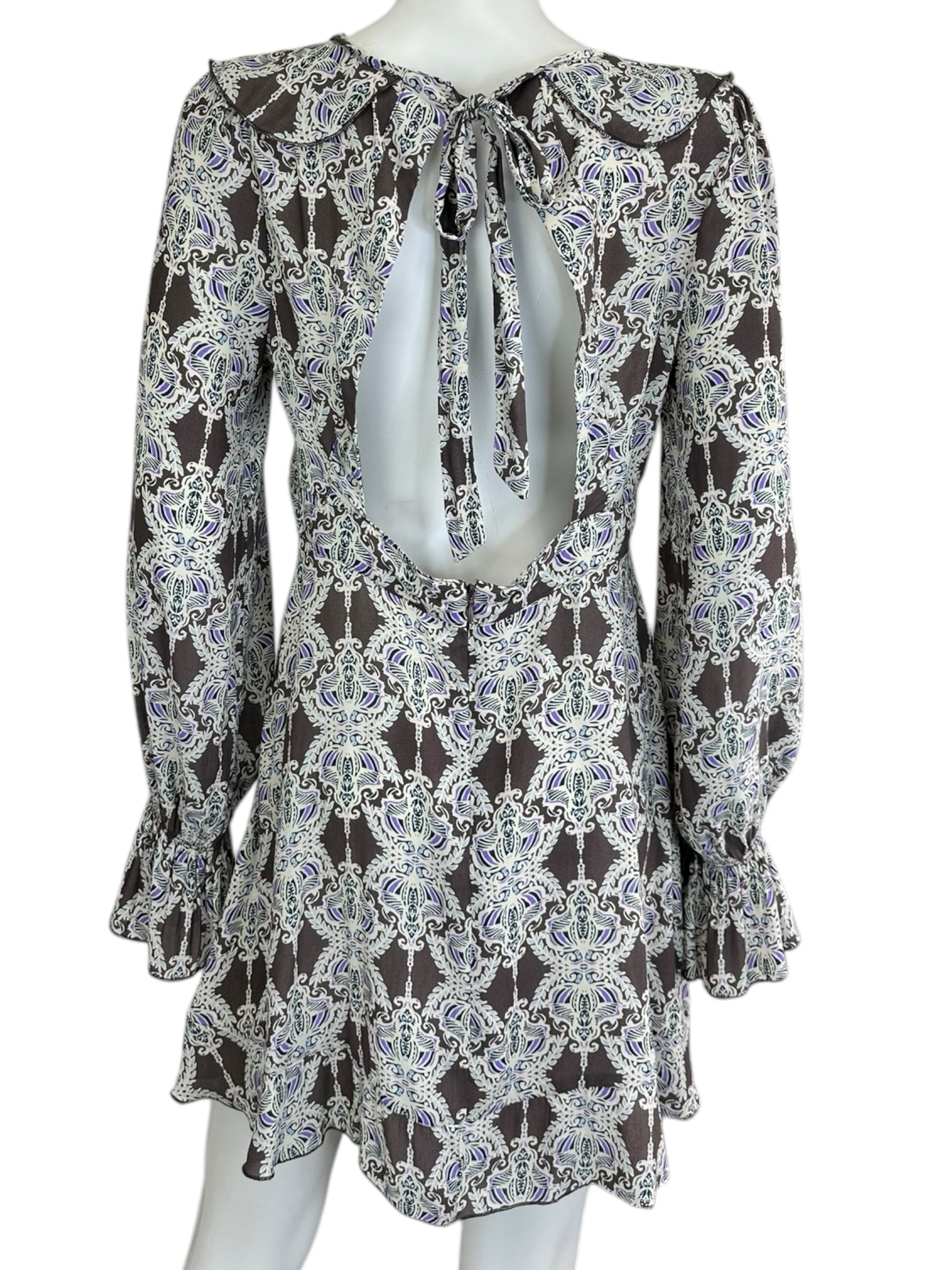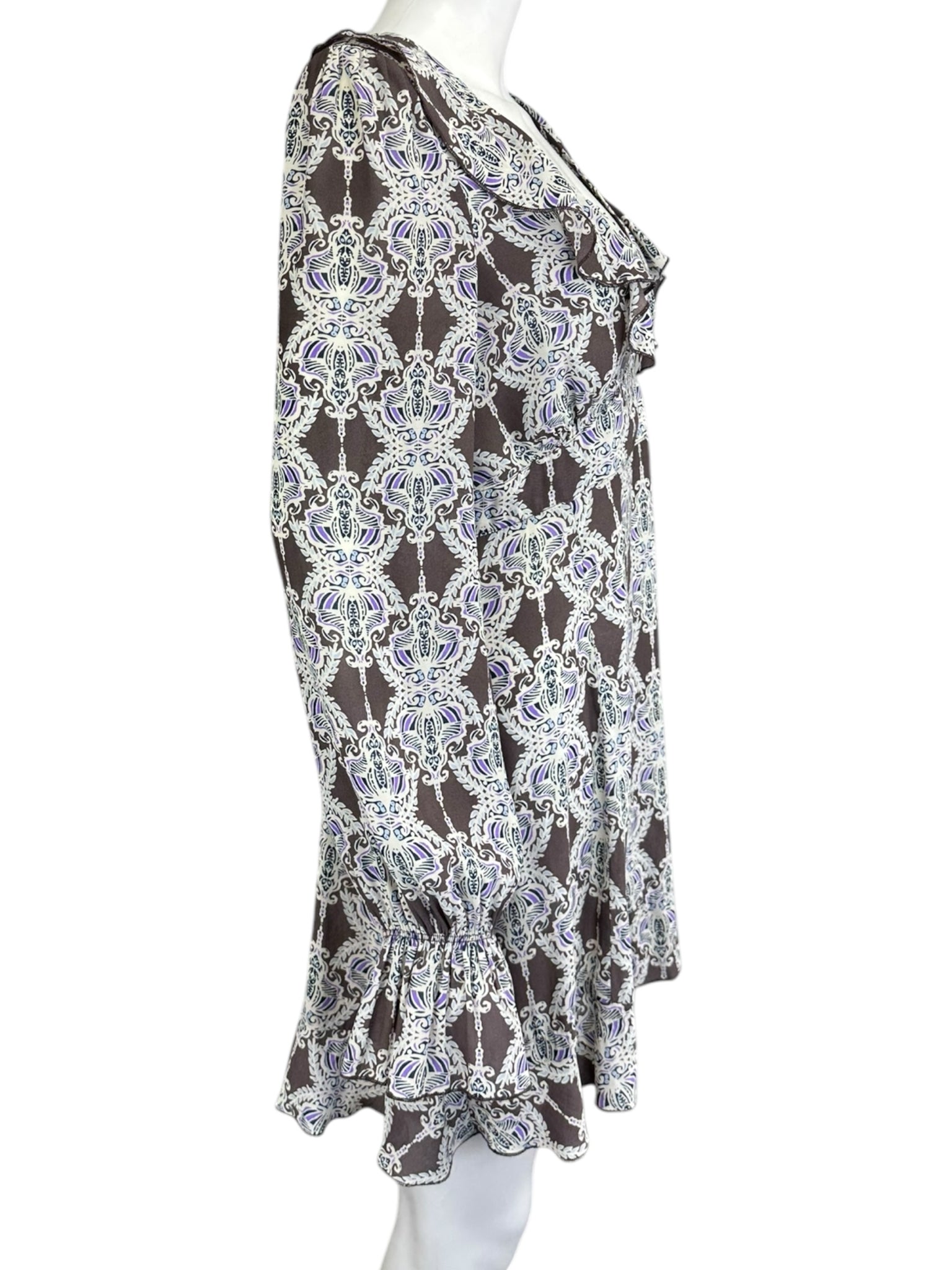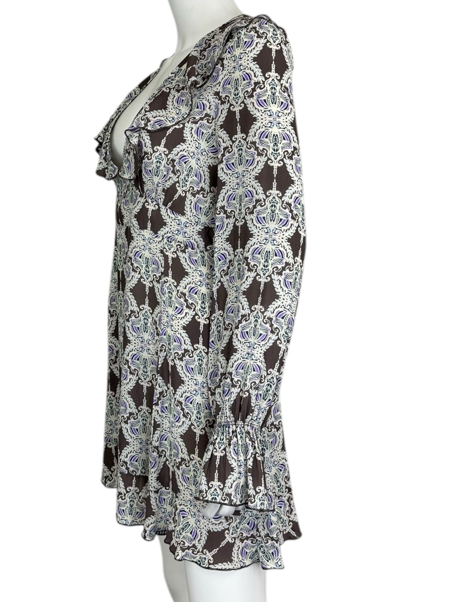 Brown and white V-neck mini dress with purple patterned paisley print. Dress features long sleeves with a ruffle cuff, ruffle trim plunging neckline and an open back with tie closure.